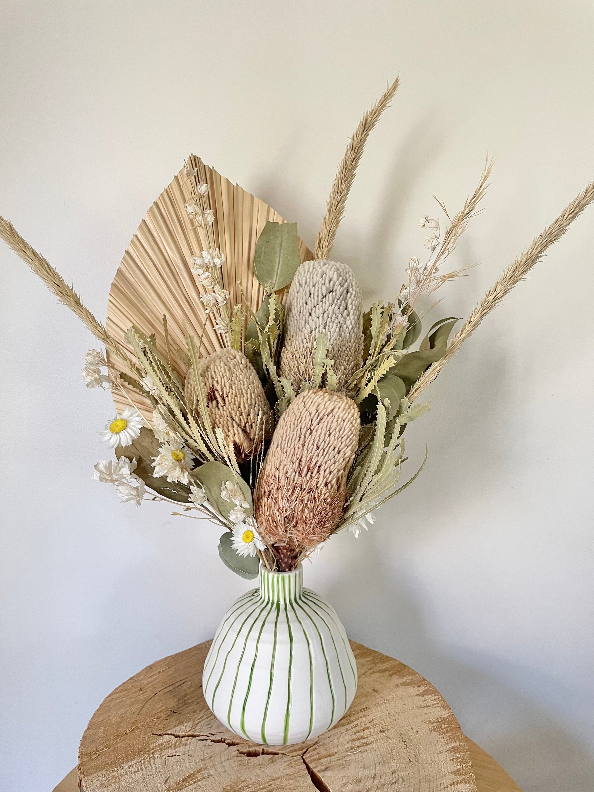 Gorgeous dried banksias mixed with dried flowers, grasses, palm and eucalyptus, presented in a quality striped ceramic vase.