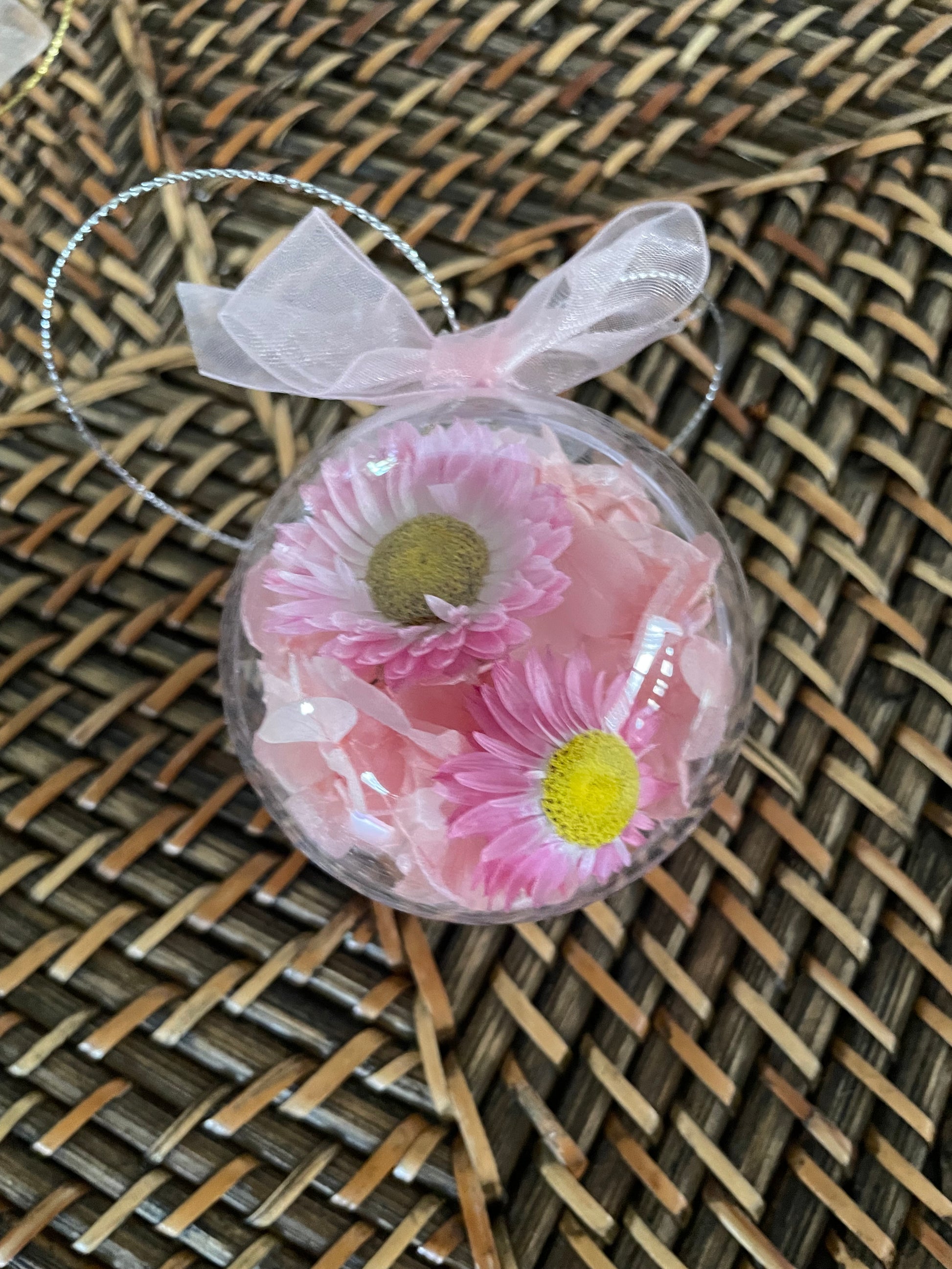 An acrylic 6cm bauble filled with Pink hydrangea and pink paper daisies ready to hang with silver string and a sheer pink ribbon bow!