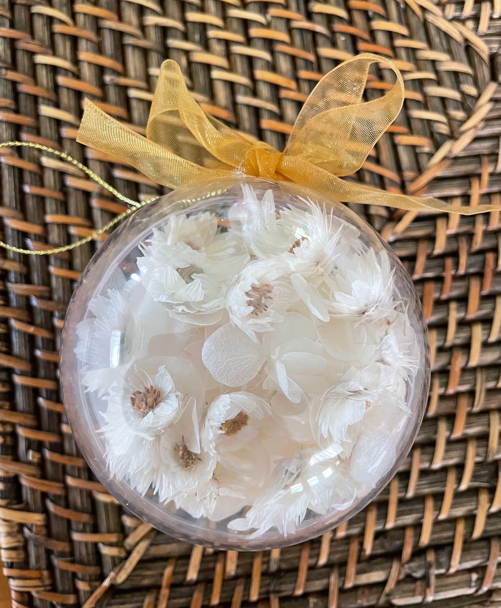 An acrylic 8cm bauble filled with preserved white hydrangea petals & dried white daisies ready to hang on the tree with gold string & bright gold sheer ribbon bow!