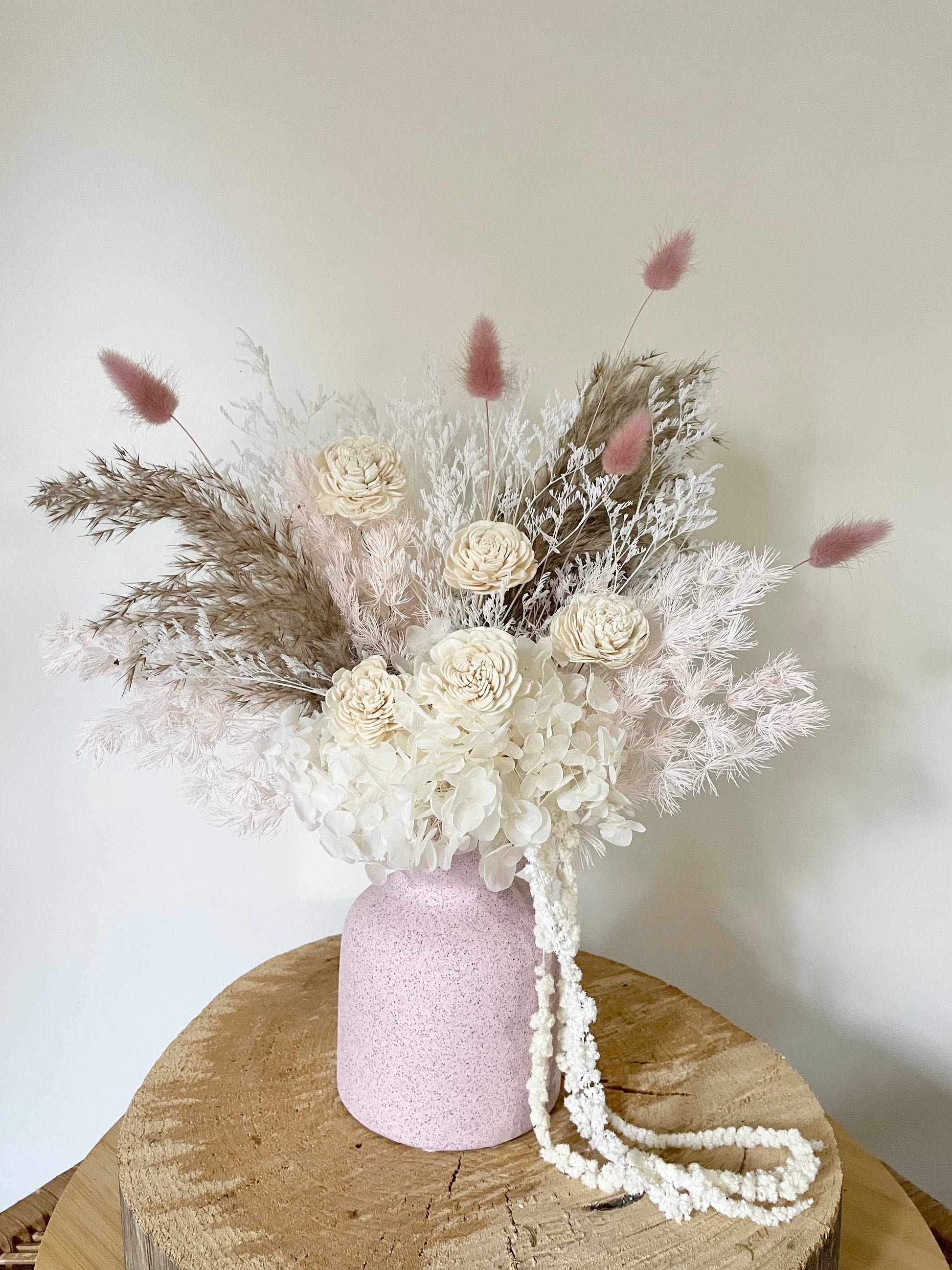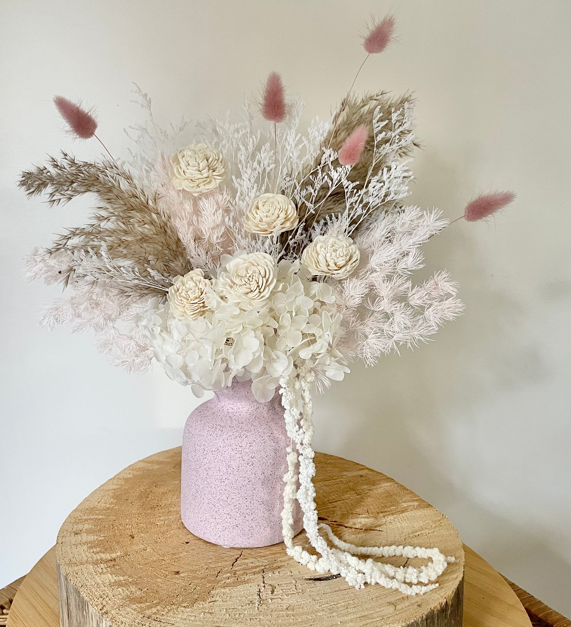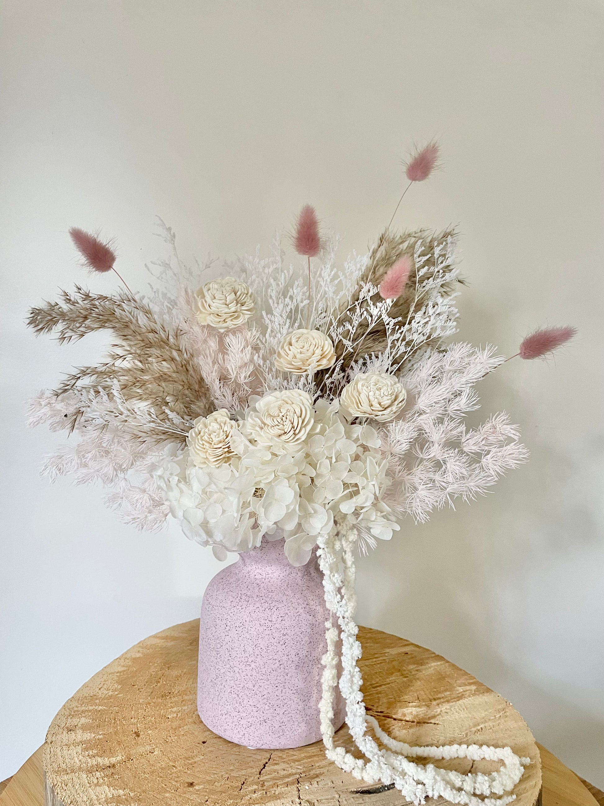 A mix of Dried and preserved grasses, bunny tails, creamy white hydrangea and creamy white sola flowers in a pink ceramic pot.