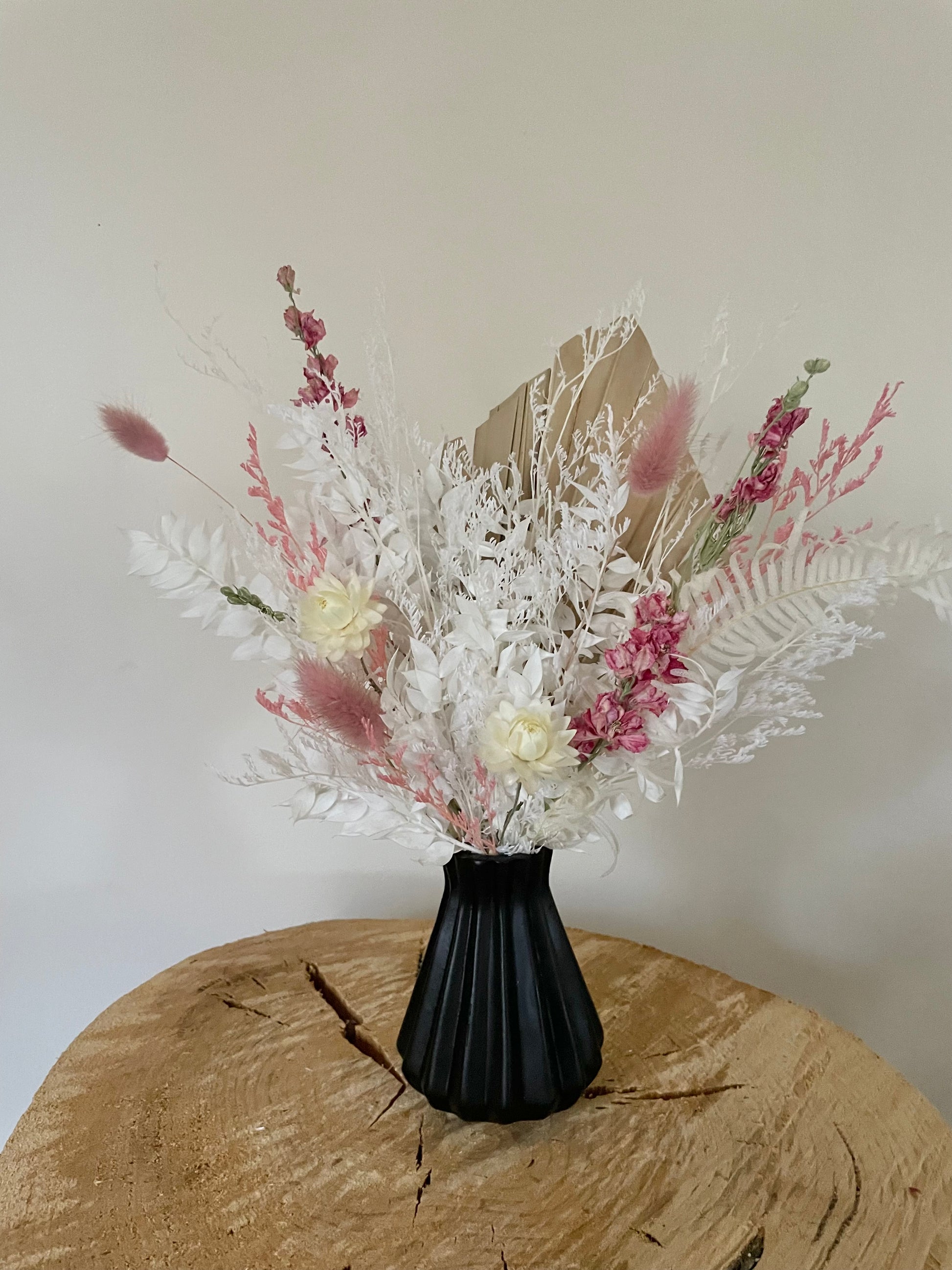 Carefully selected dried and preserved flowers and foliages in a white palette with pops of pink presented in a black ceramic vase.