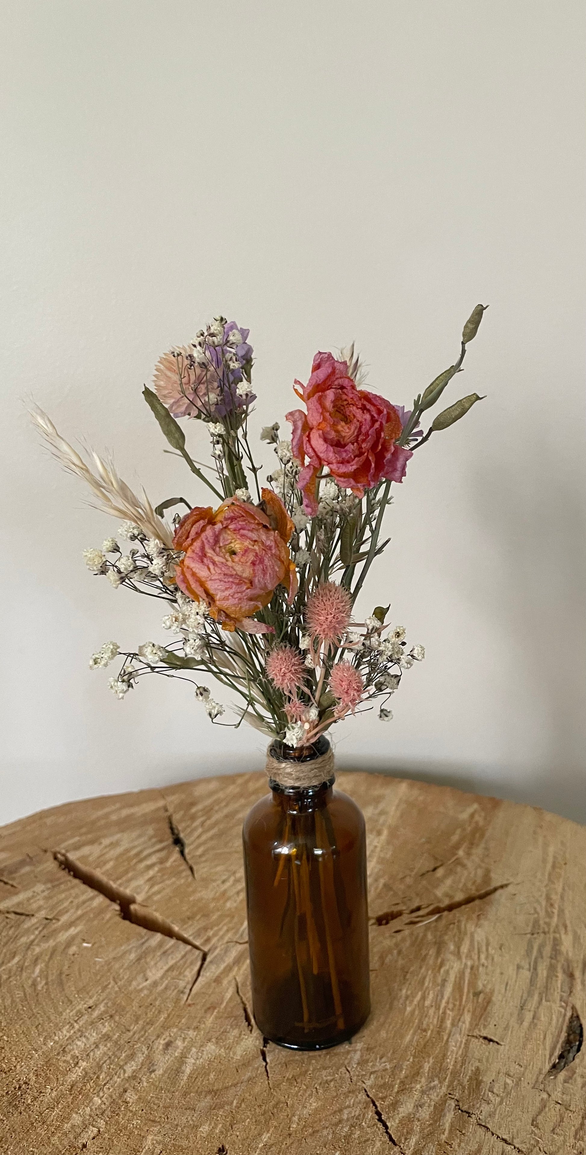 Gorgeous dried ranunculus in a mixed mini posy presented in a miniature amber bottle.