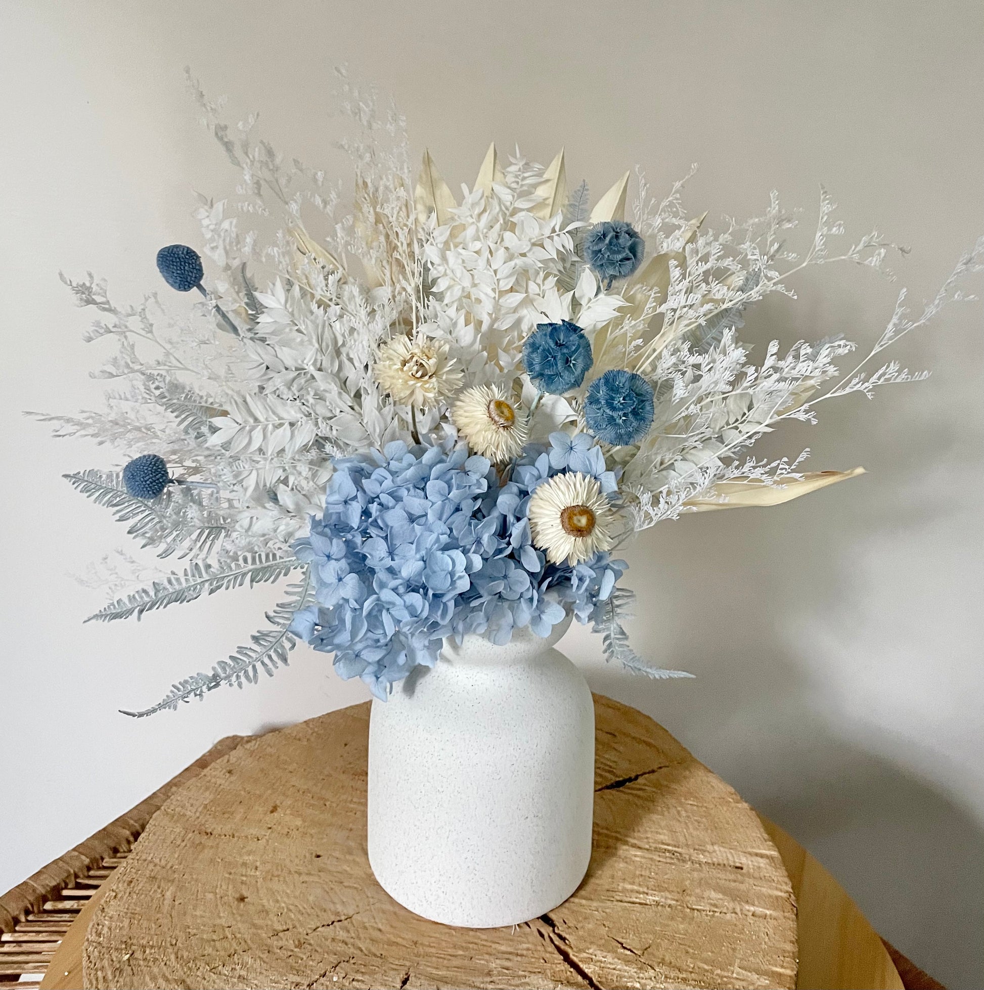 A gorgeous pot of preserved flowers and foliage with dried strawflowers in a blue & white colour palette. presented in a quality white ceramic pot.