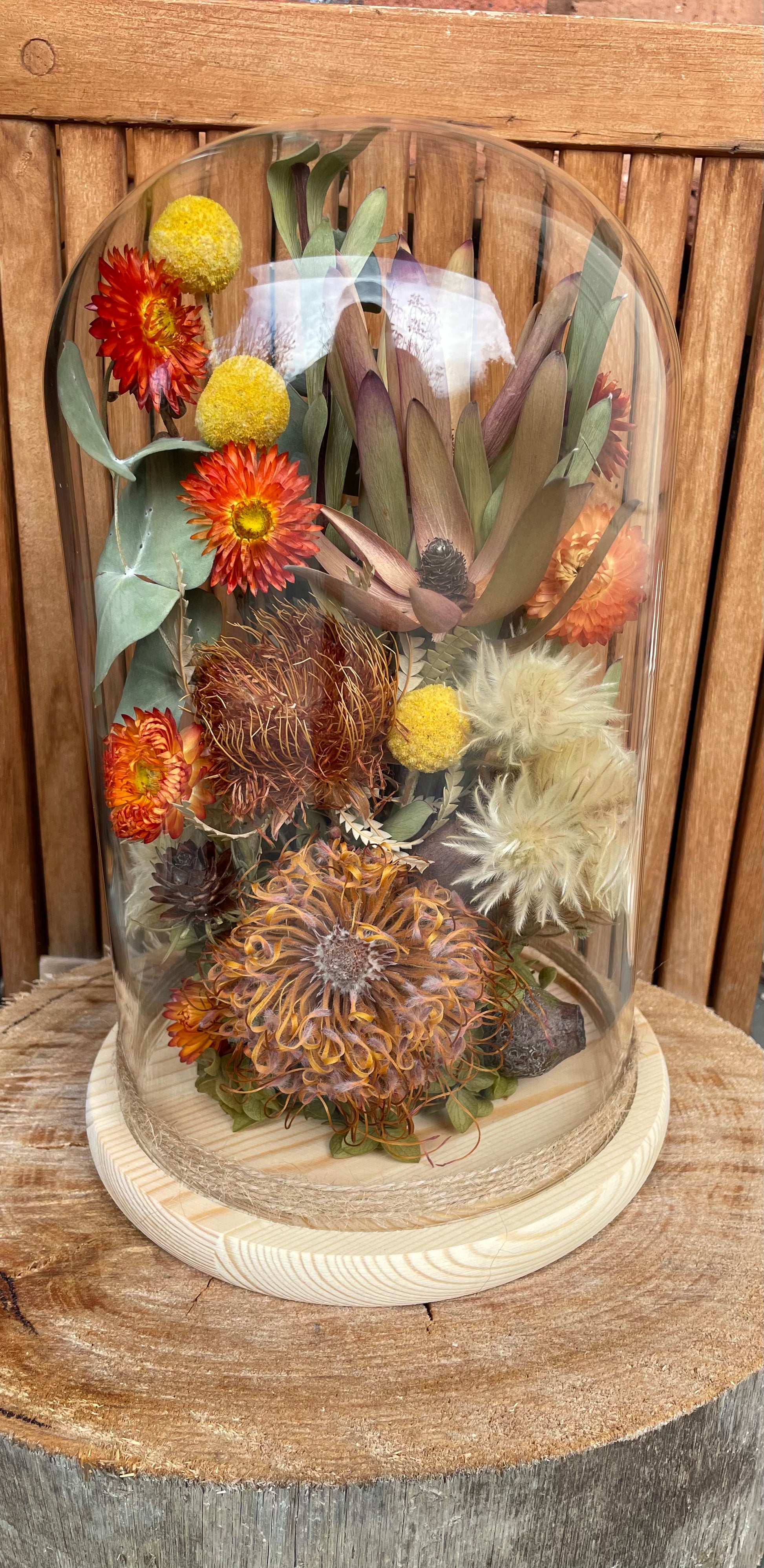 A gorgeous native arrangement in a rust palette in a quality glass dome with a bamboo base wrapped in jute. A 360 view