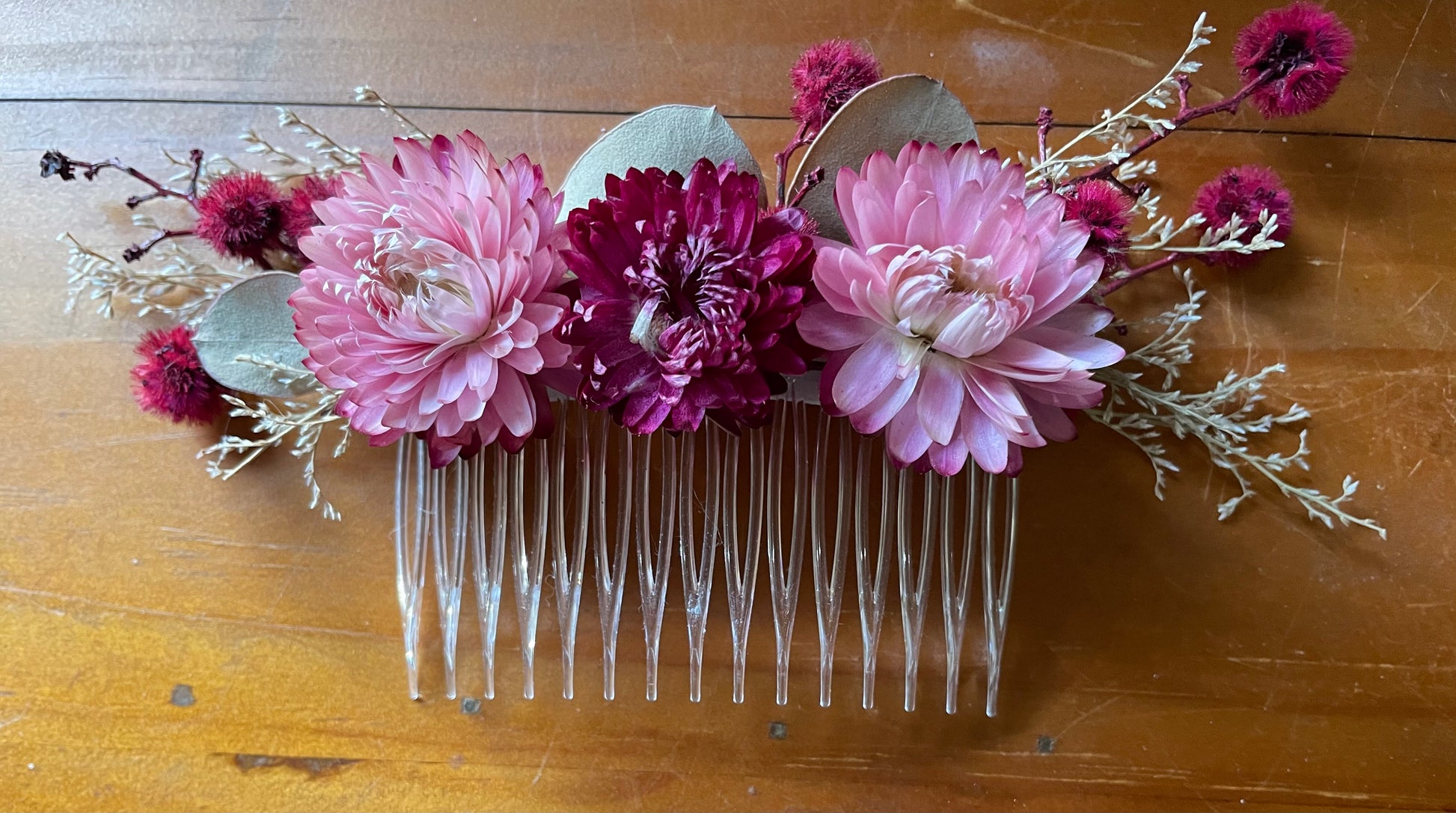 A metal hair comb with a dried floral arrangement in pinks