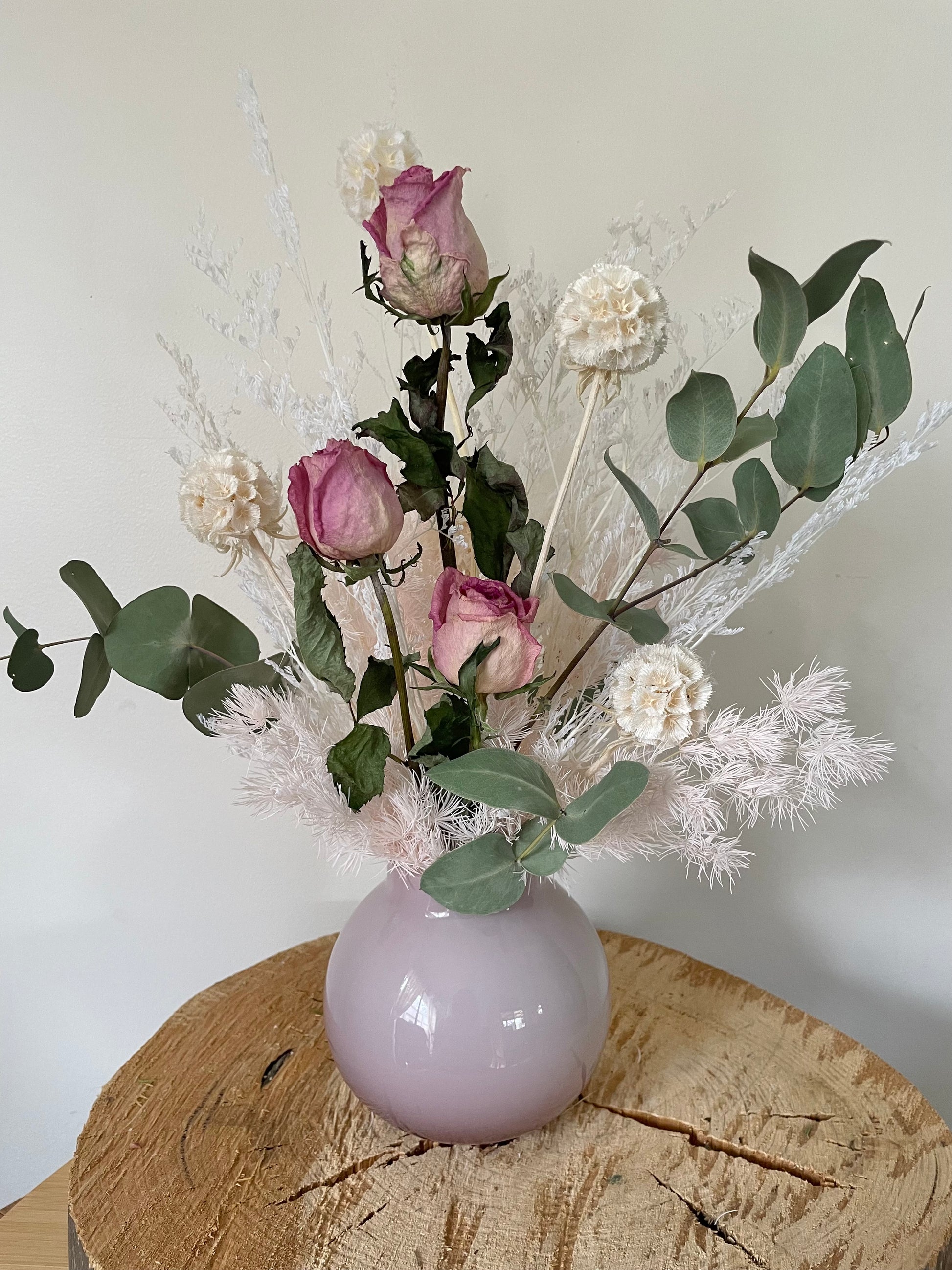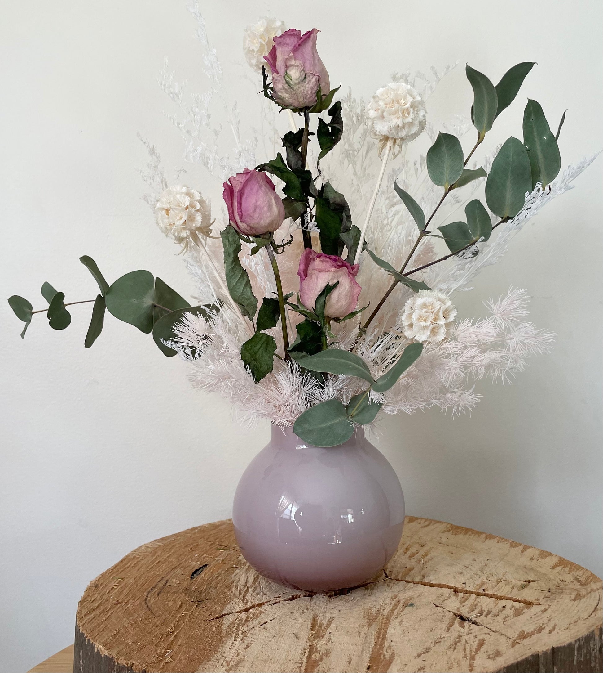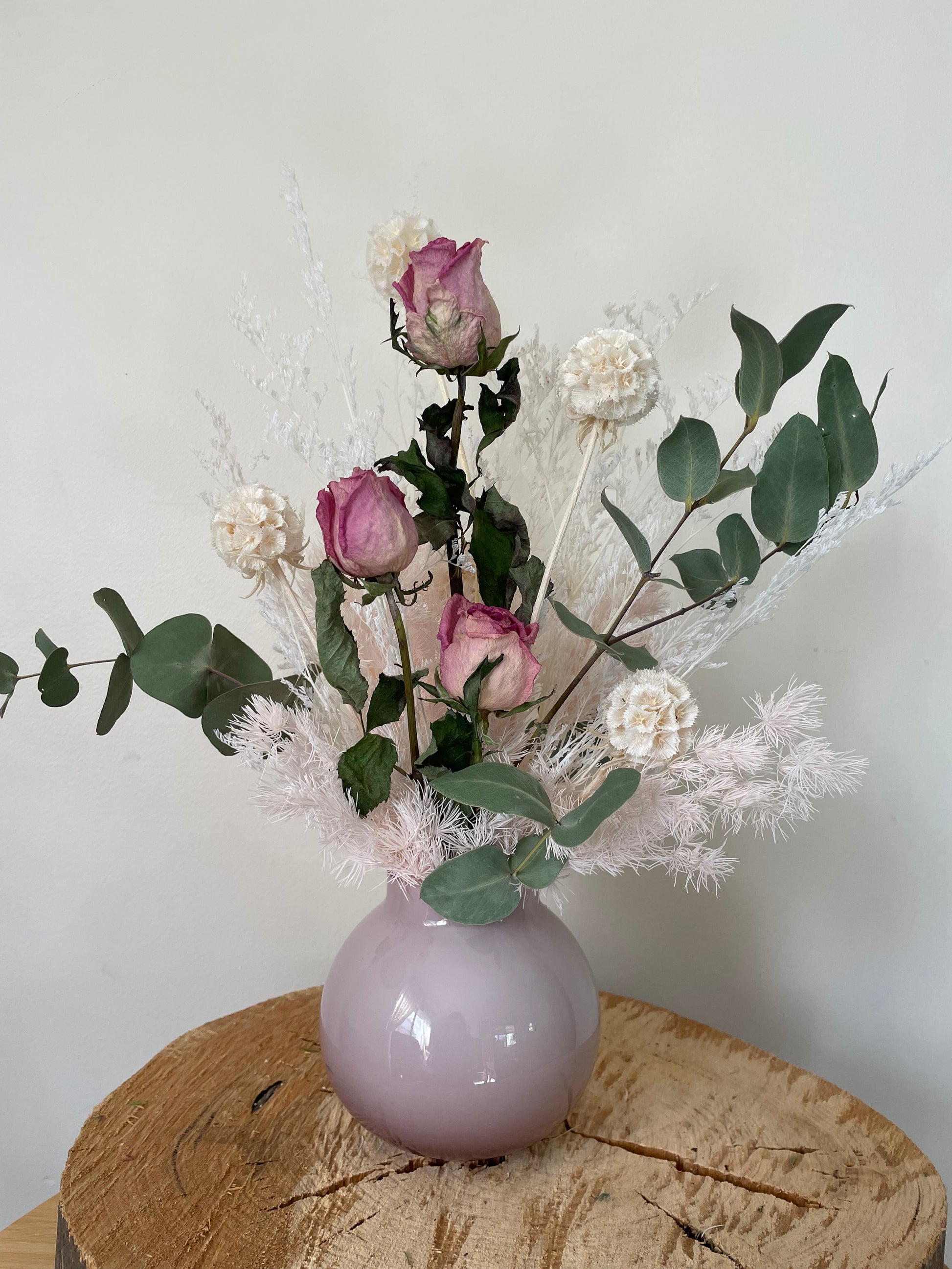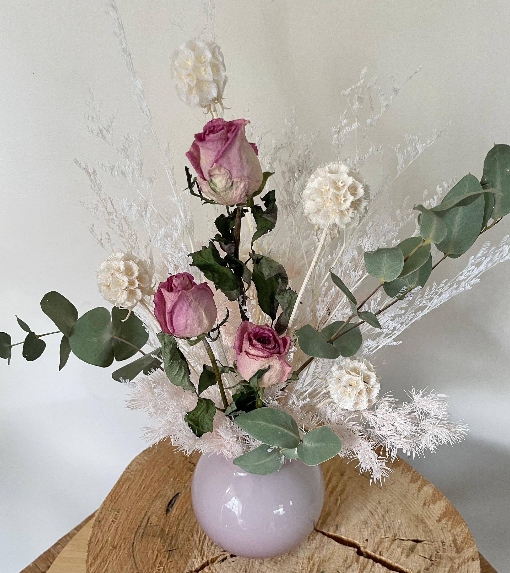 A gorgeous dried and preserved flower arrangement featuring dried pink roses. The eucalyptus stems pop amongst the soft pinks and whites.