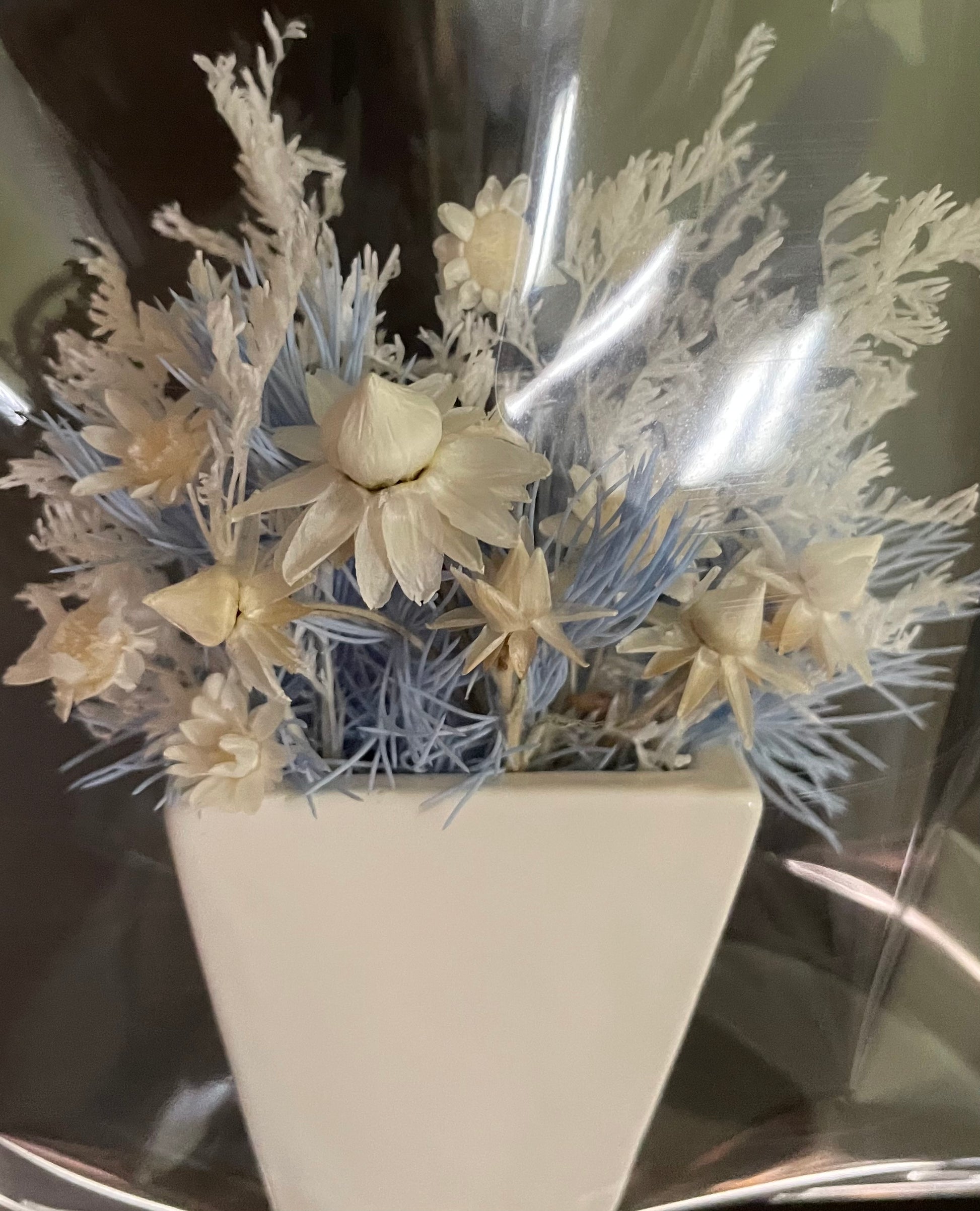 A fridge magnet miniature white ceramic pot measuring 4cm filled with blue Ming fern, white misty, white everlasting buds!