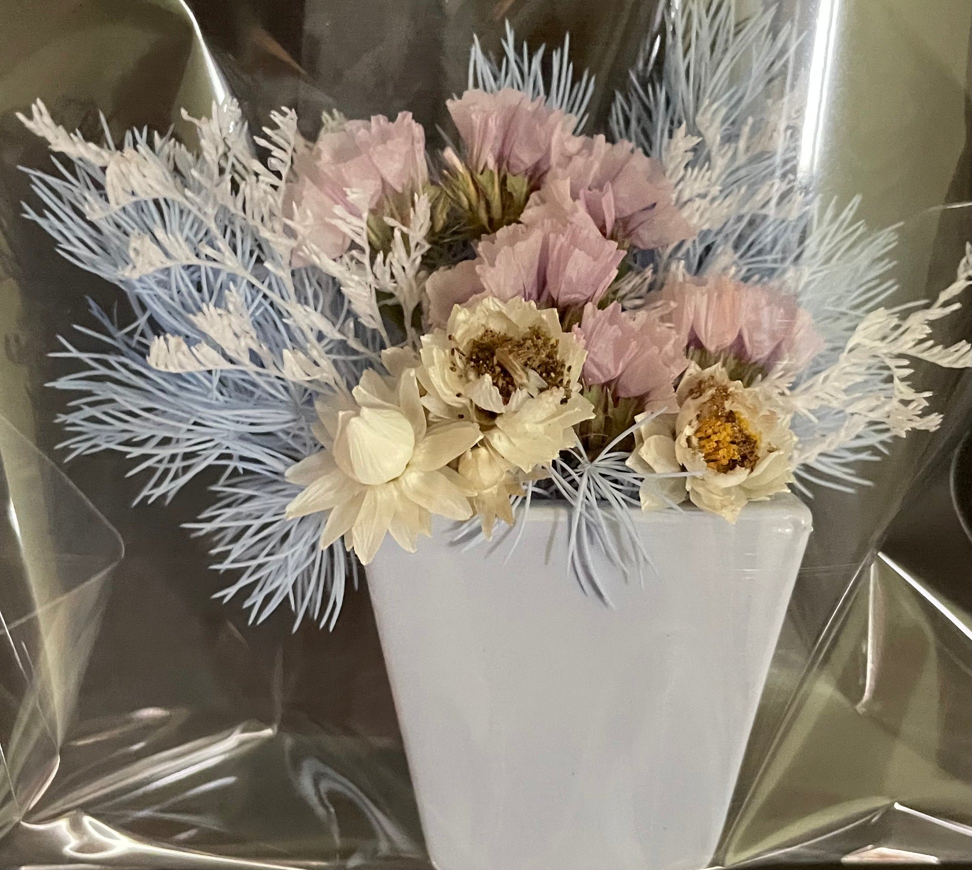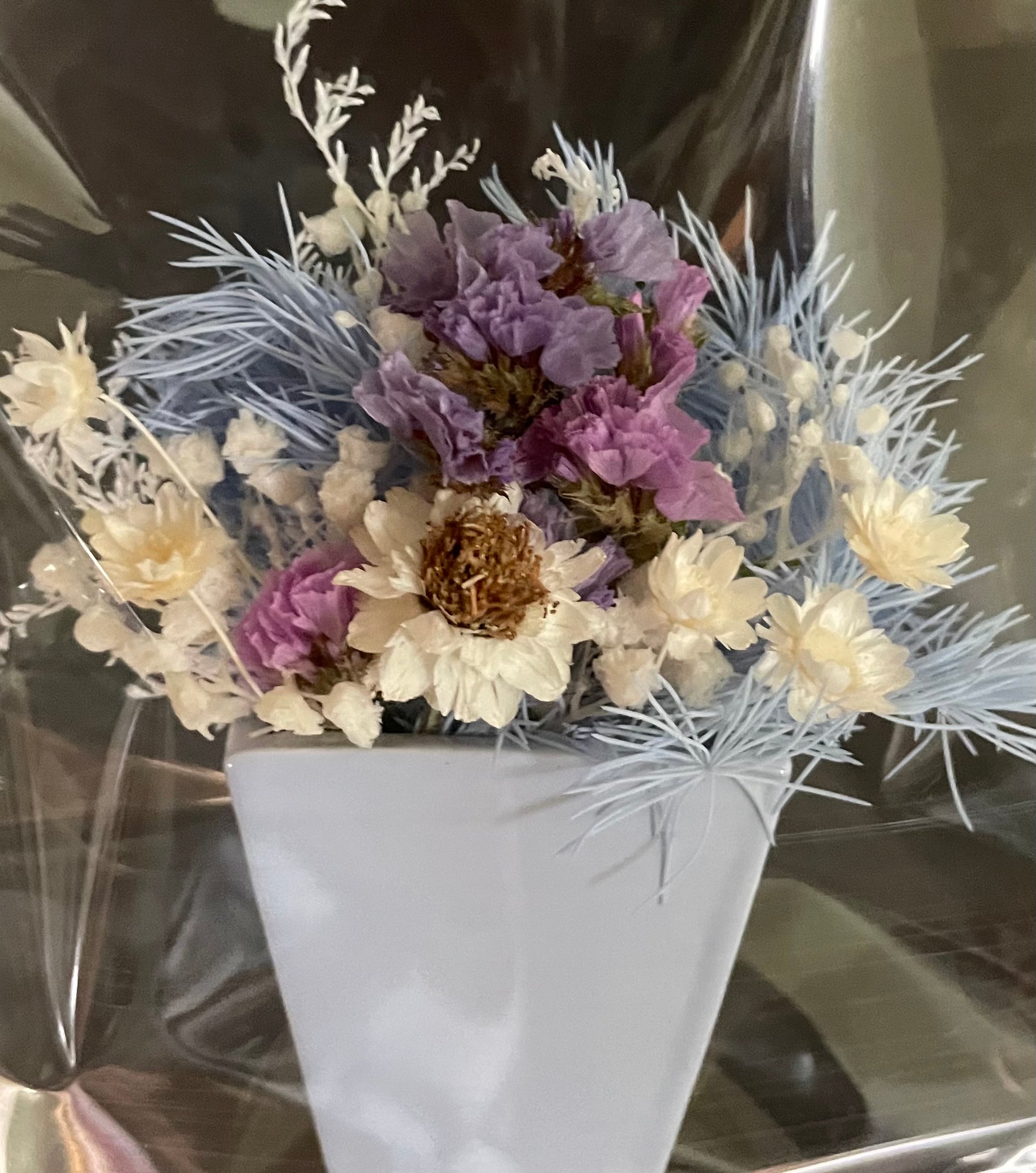blue Ming fern, stattice in shades of purple, everlastings, misty