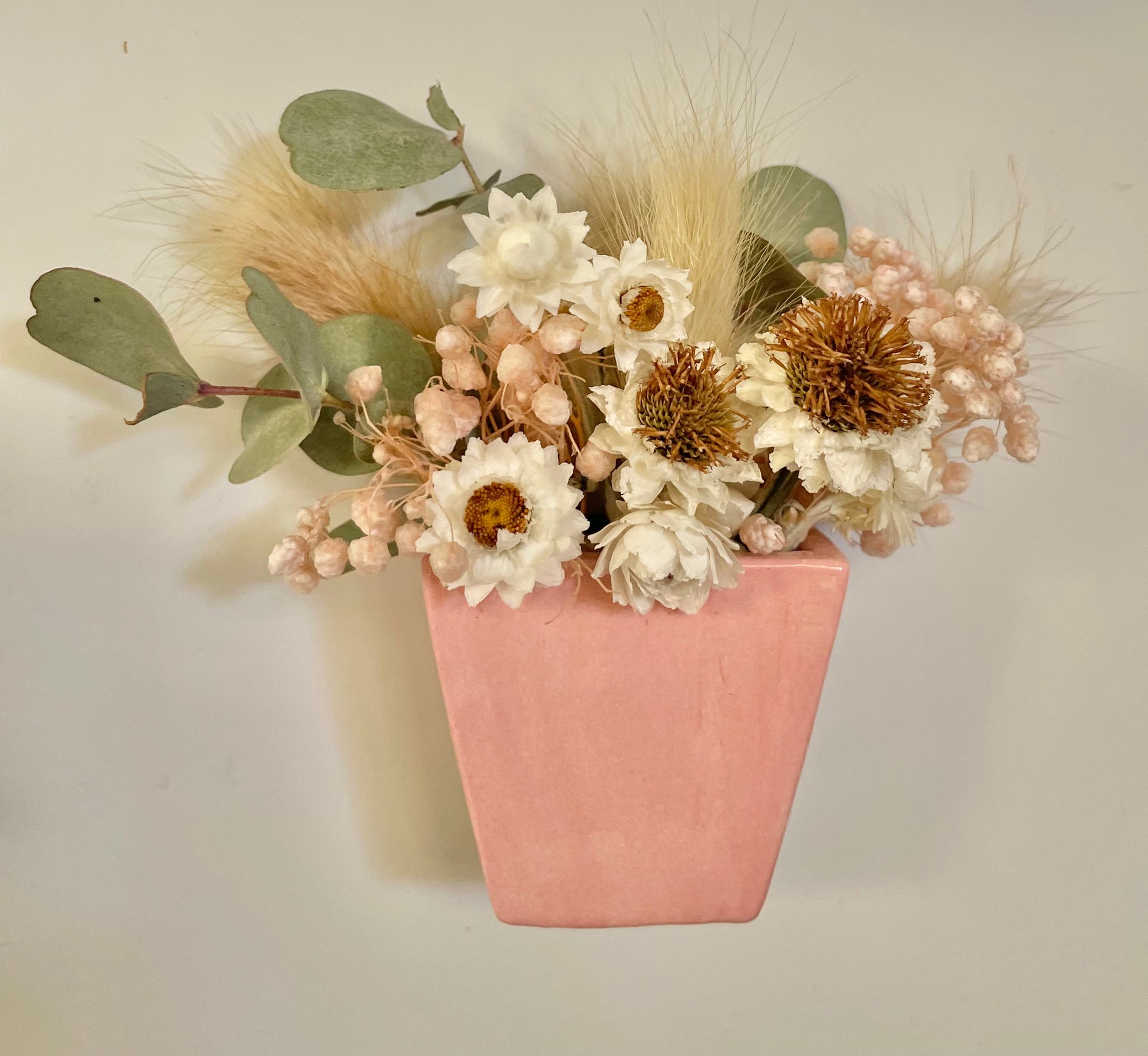 A miniature pink ceramic pot measuring 4cm filled with mixed foliages and dried everlasting daisies