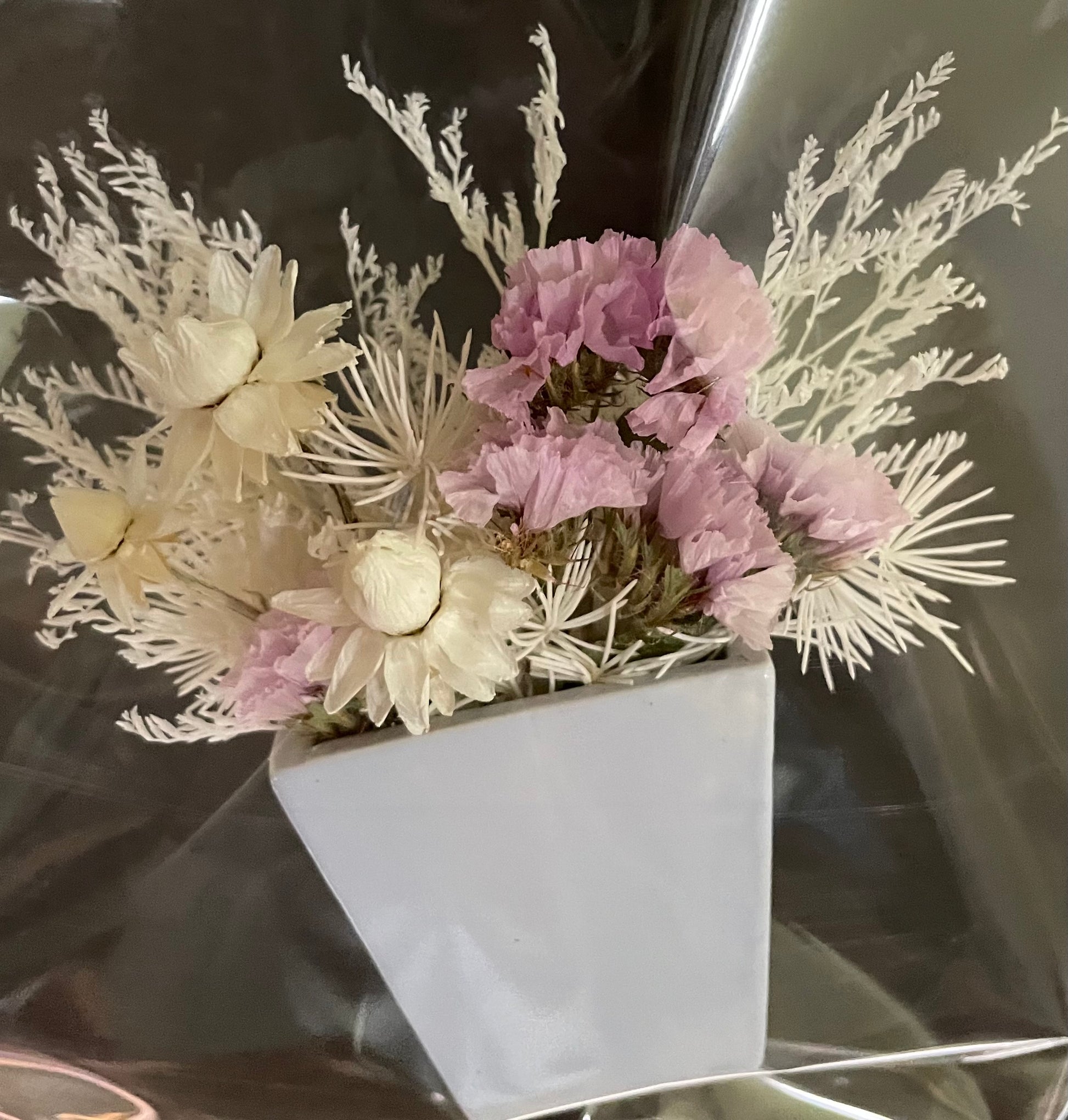 A fridge magnet miniature ceramic 4cm blue pot filled with dried everlasting buds , mauve stattice snd white misty