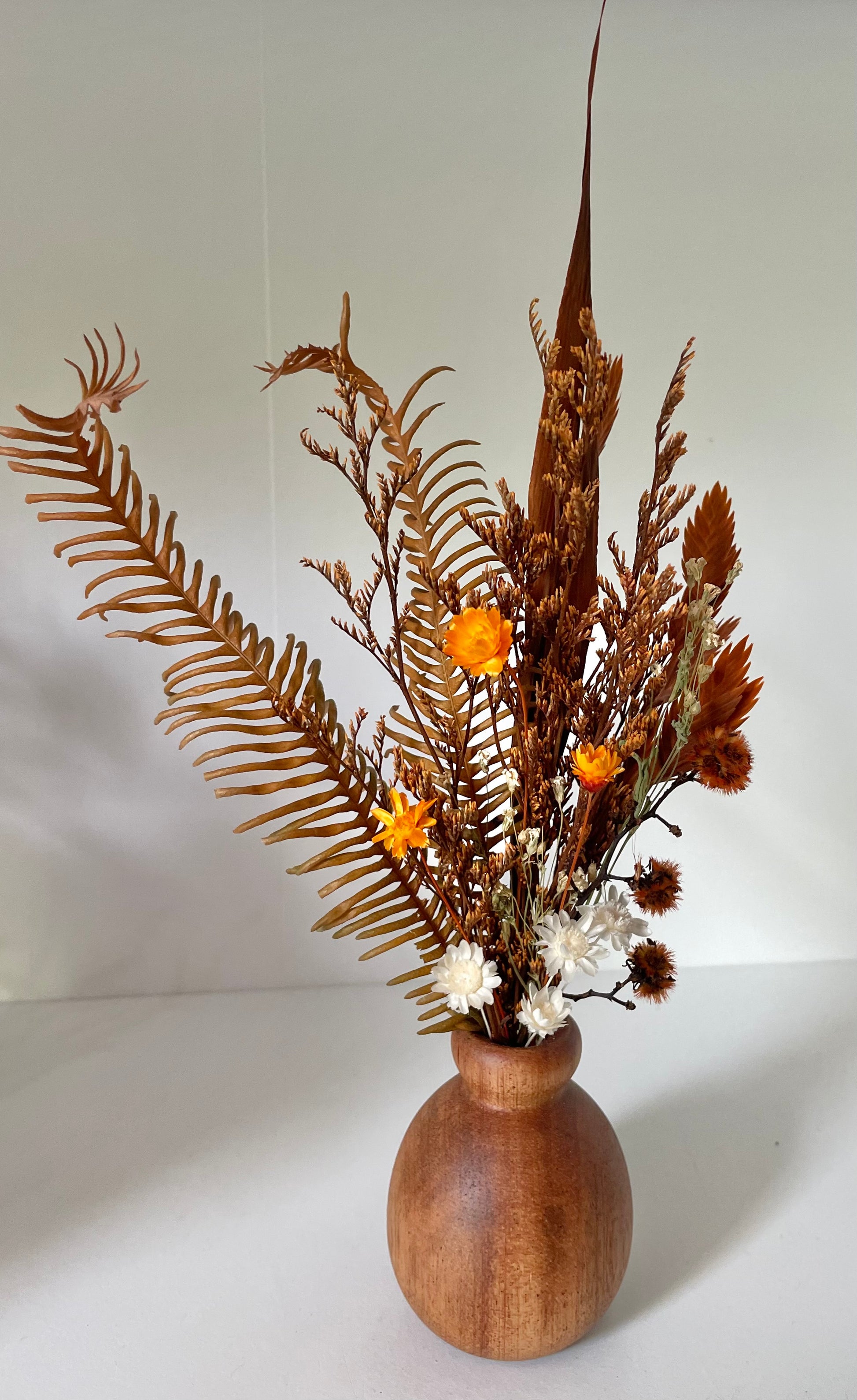 A small flower arrangement in a rust colour palette in a mini timber vase paired with a mini soy candle in a mini glass milk bottle all presented in a cardboard gift box
