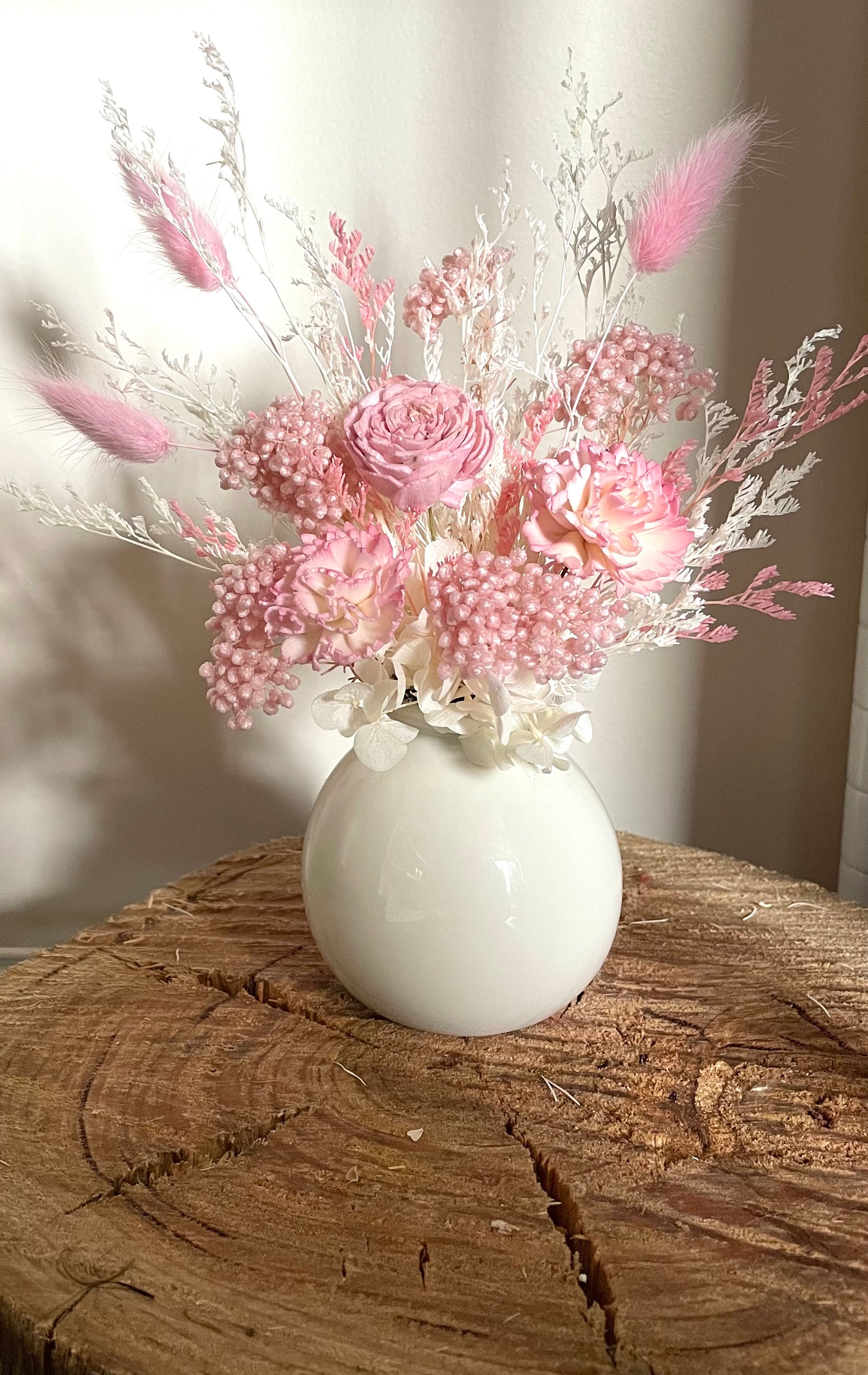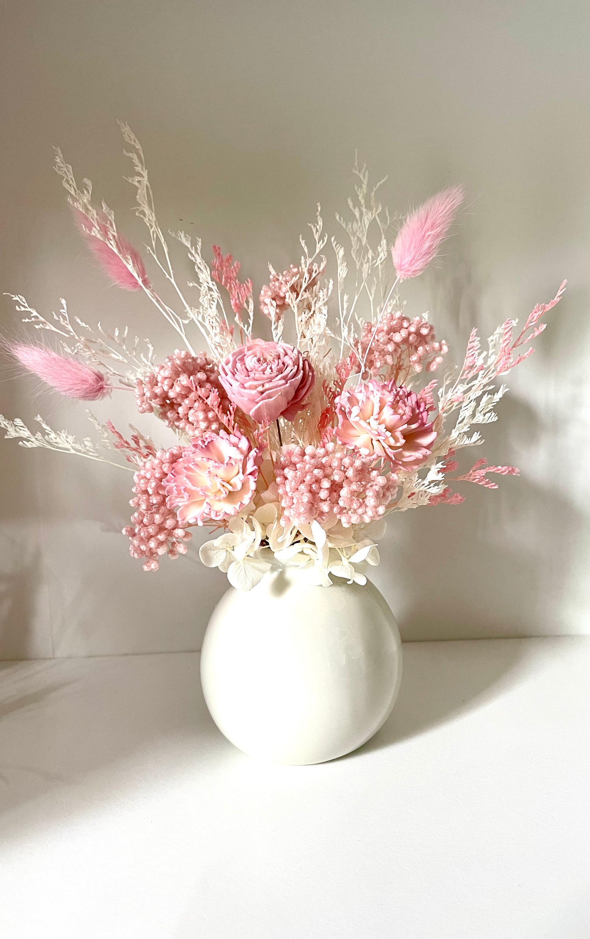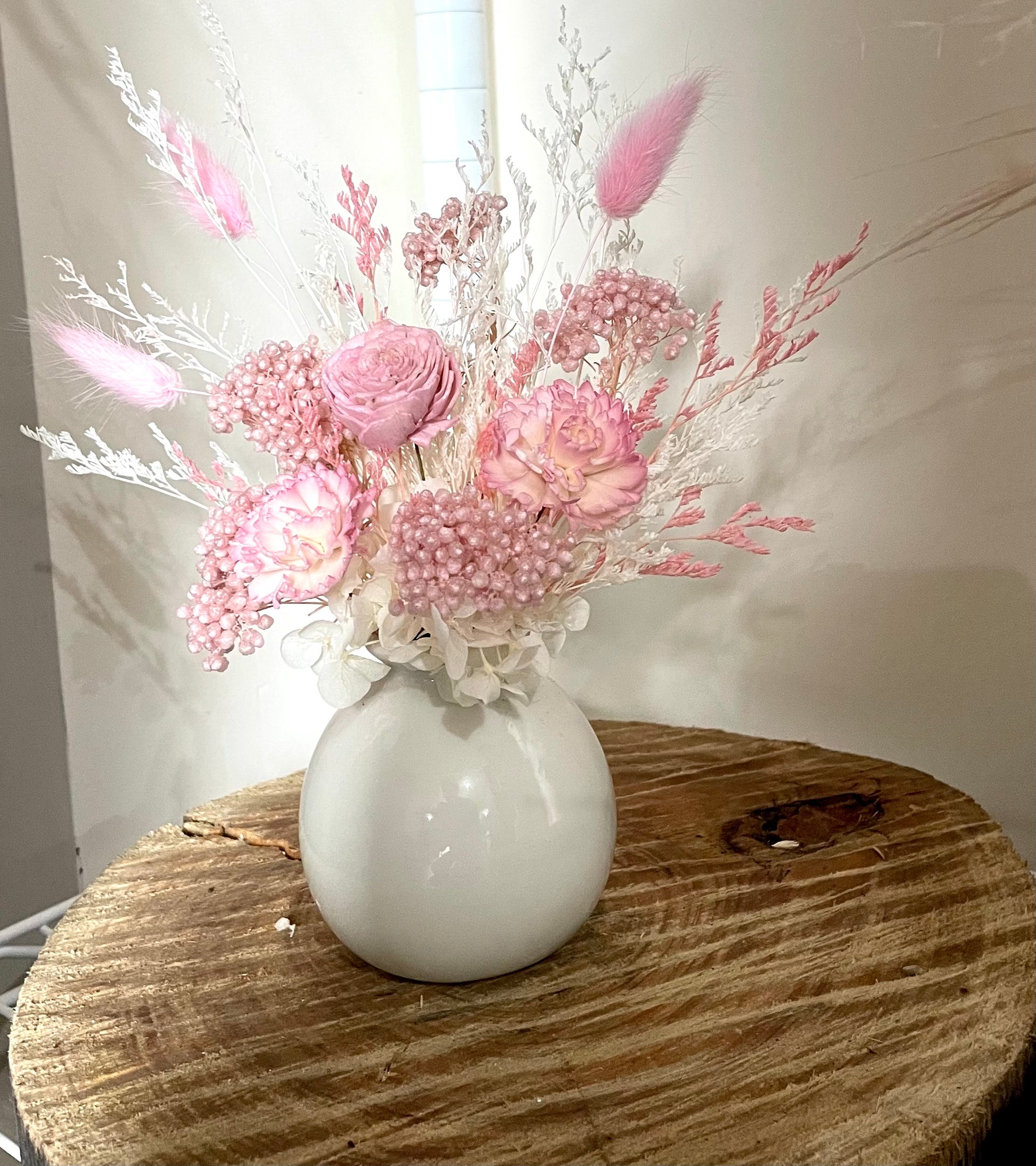 A beautiful mini arrangement featuring preserved foliages and baby pink sola flowers presented in a mini white 7cm ceramic pot with the completed arrangement measuring 20cm at the tallest stem tip
