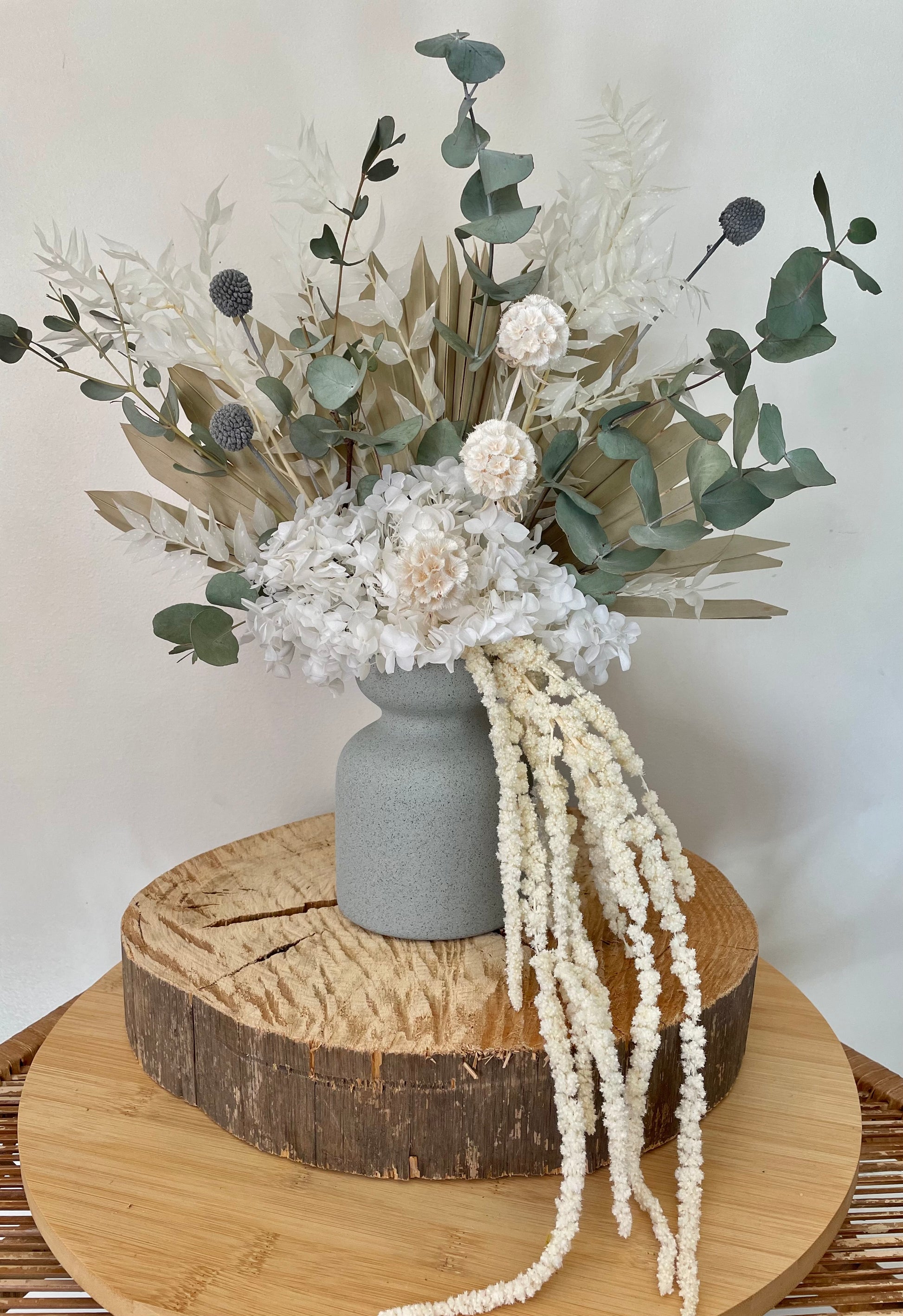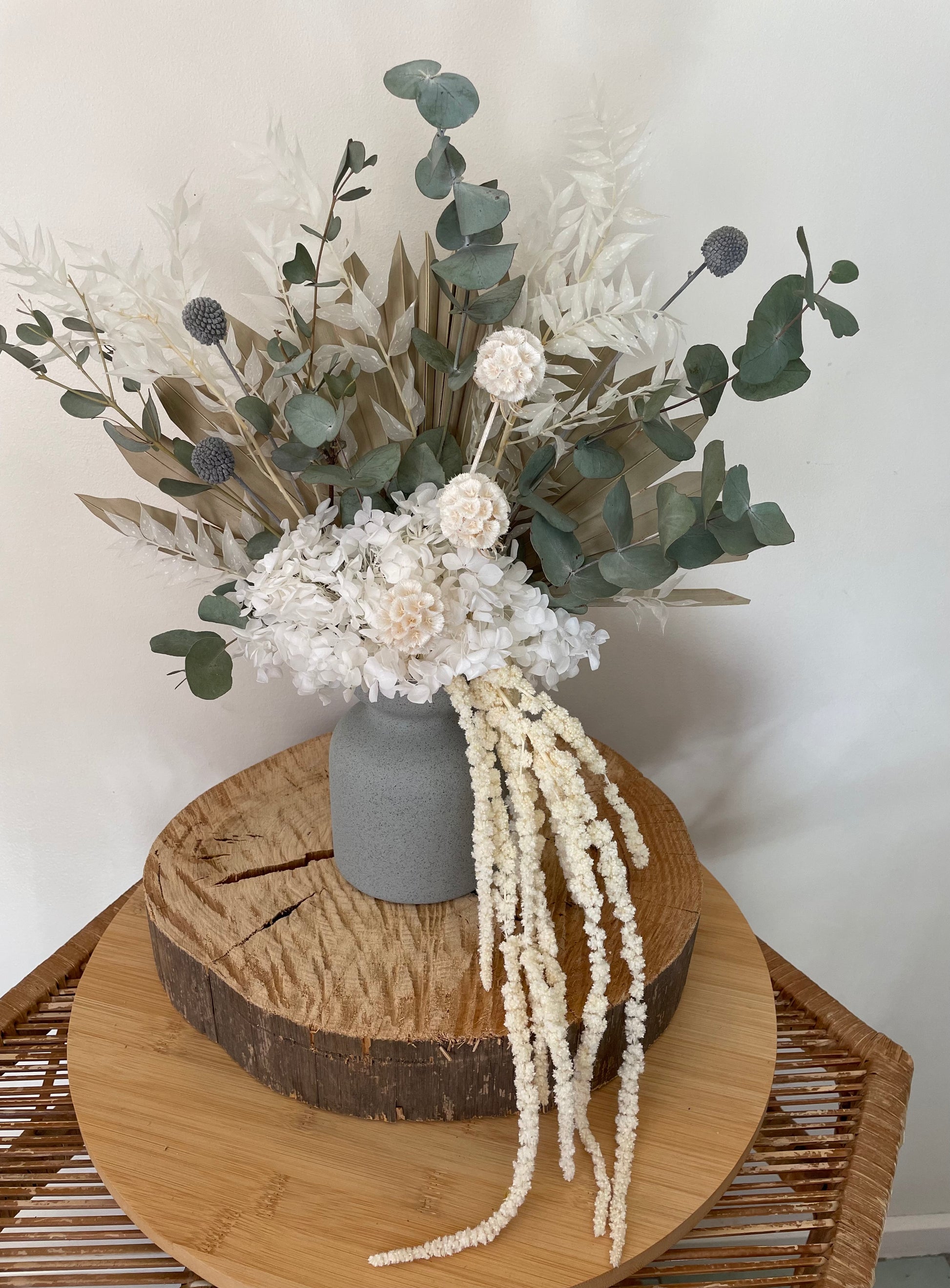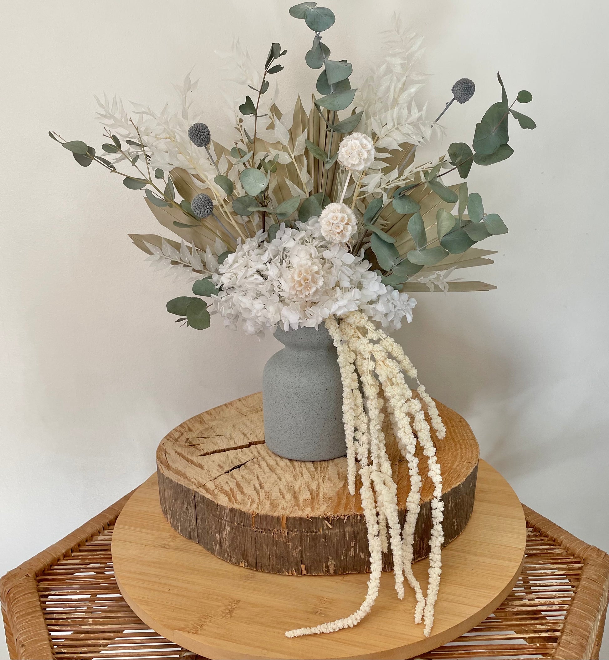 A mix of dried & preserved flowers & foliages in a beautiful crisp sage green & white palette presented in a premium quality grey ceramic pot