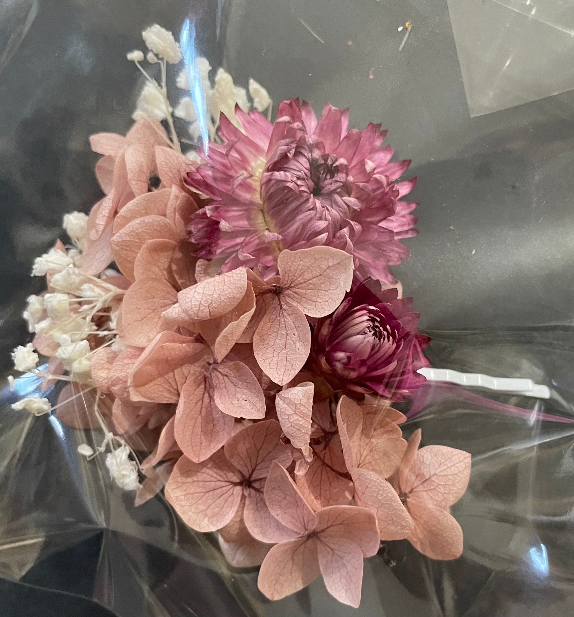 A dried flower arrangement in dusty pinks on a single white hair pin