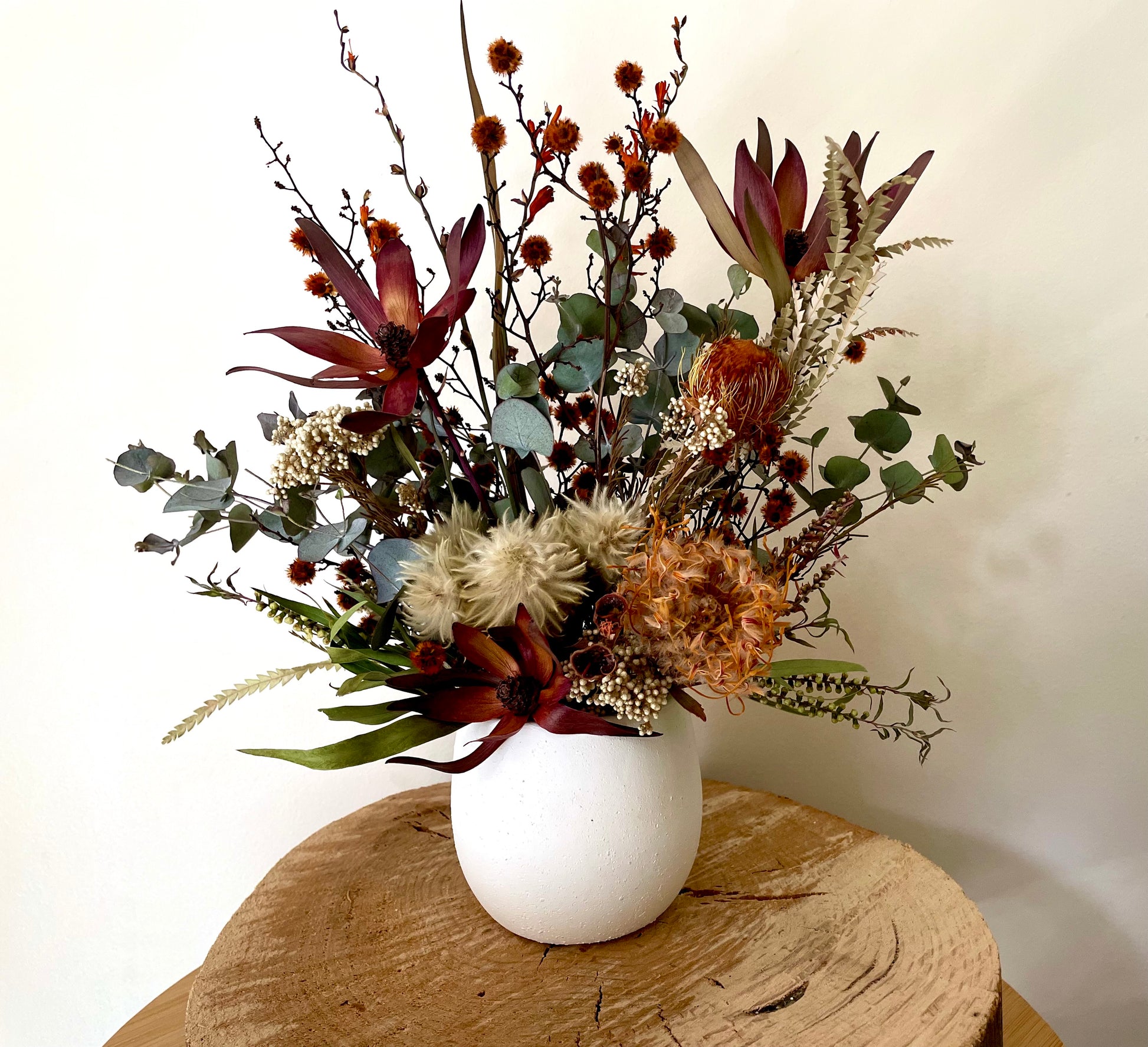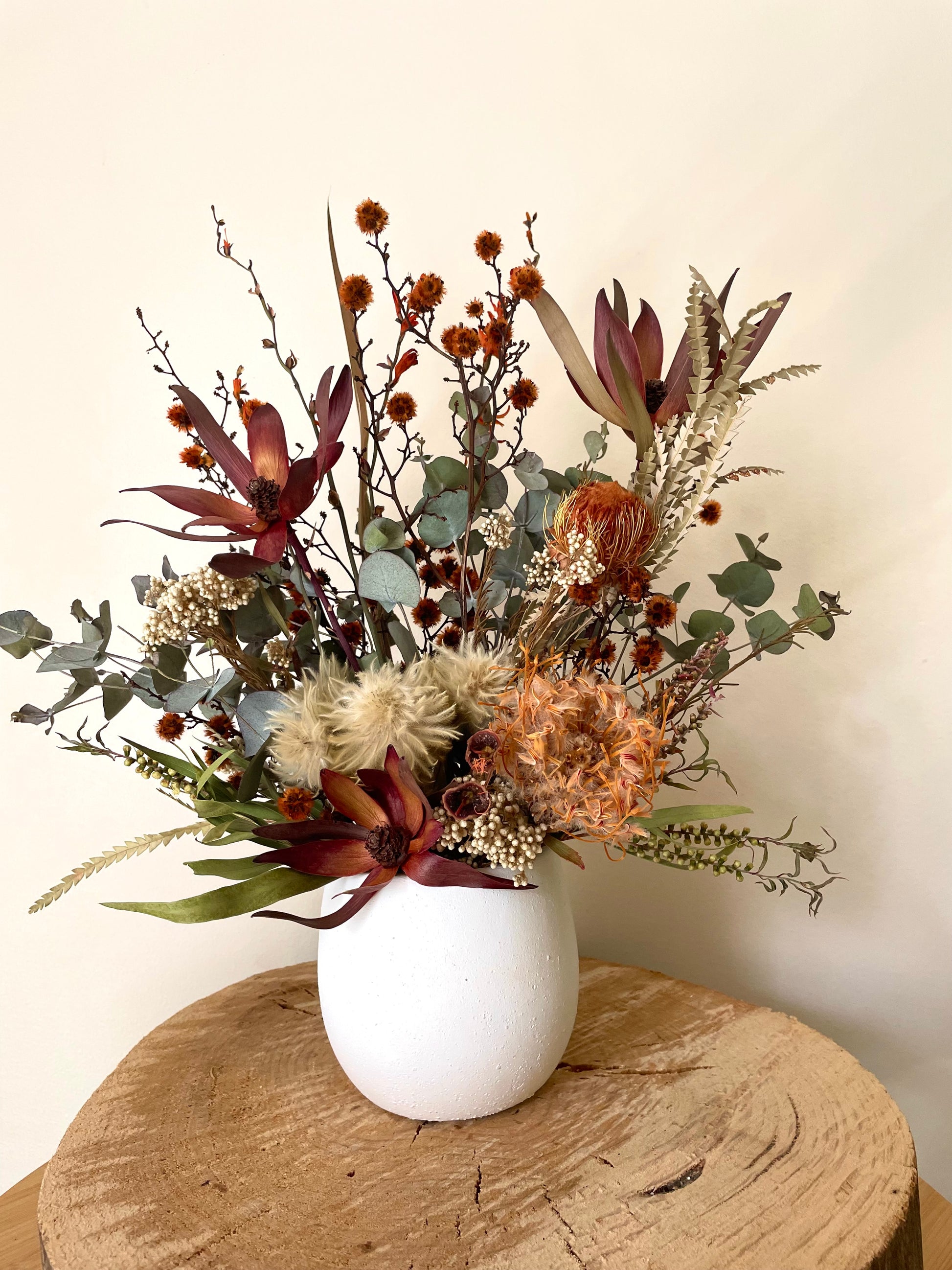 A mix of dried native flowers and foliages in a rust colour palette presented in a small white ceramic pot.