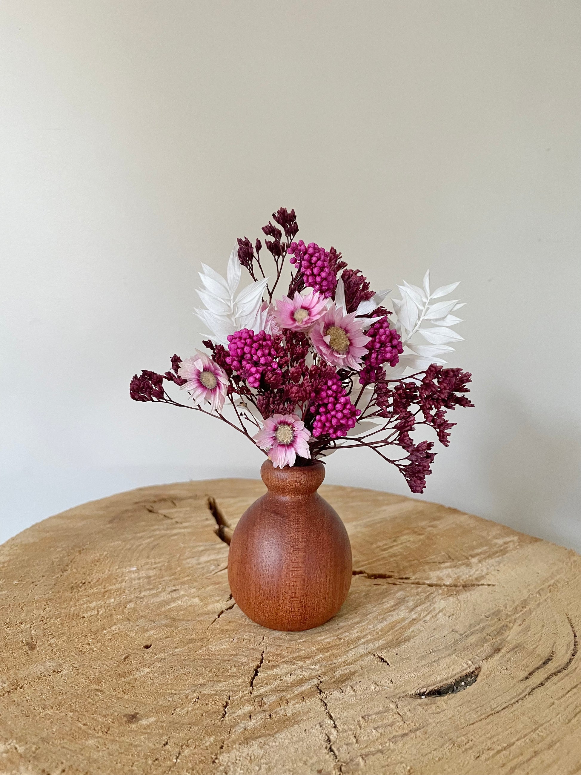 A mix of preserved flowers and foliages in a hot pink colour palette presented in a mini wooden vase