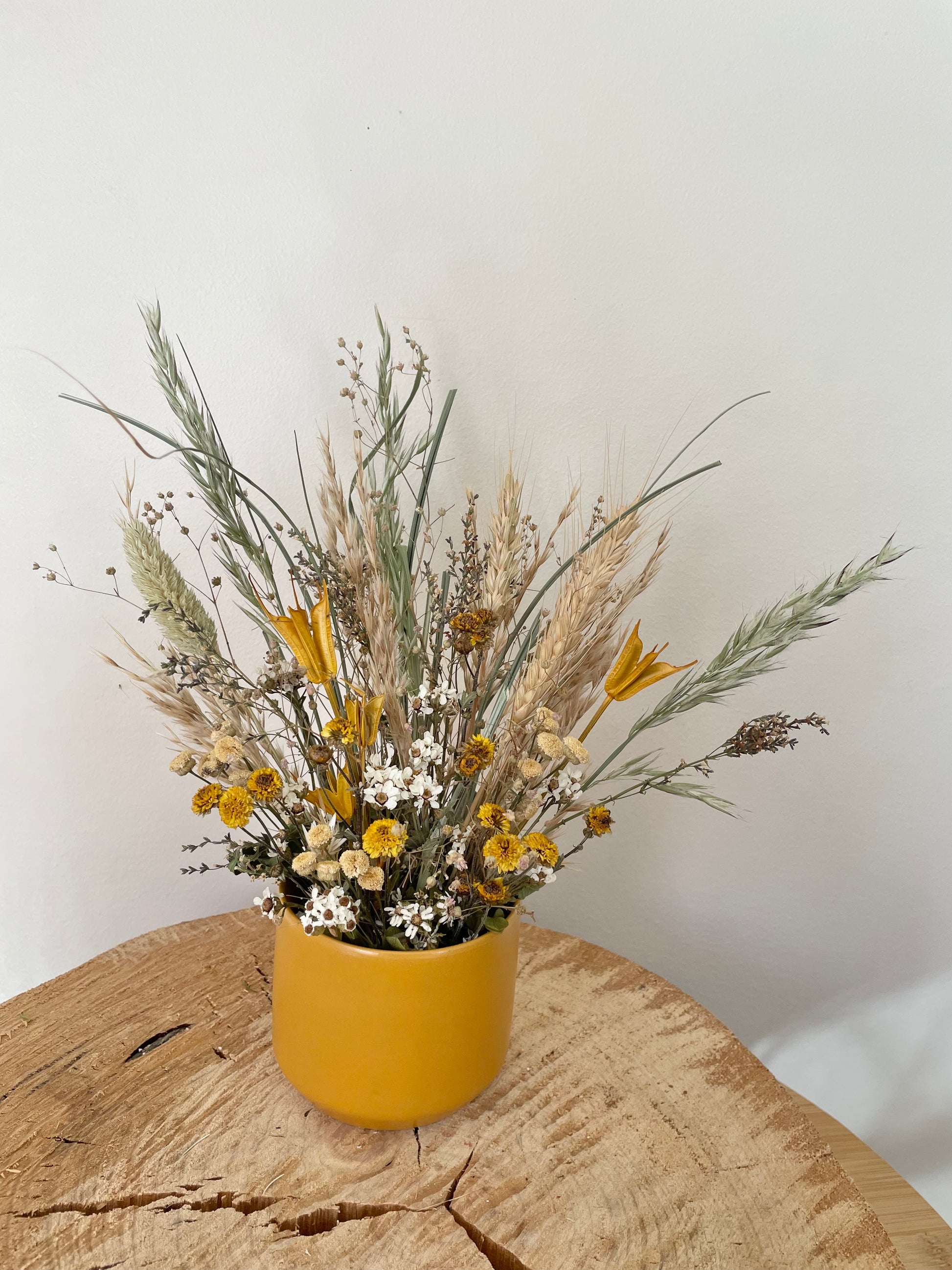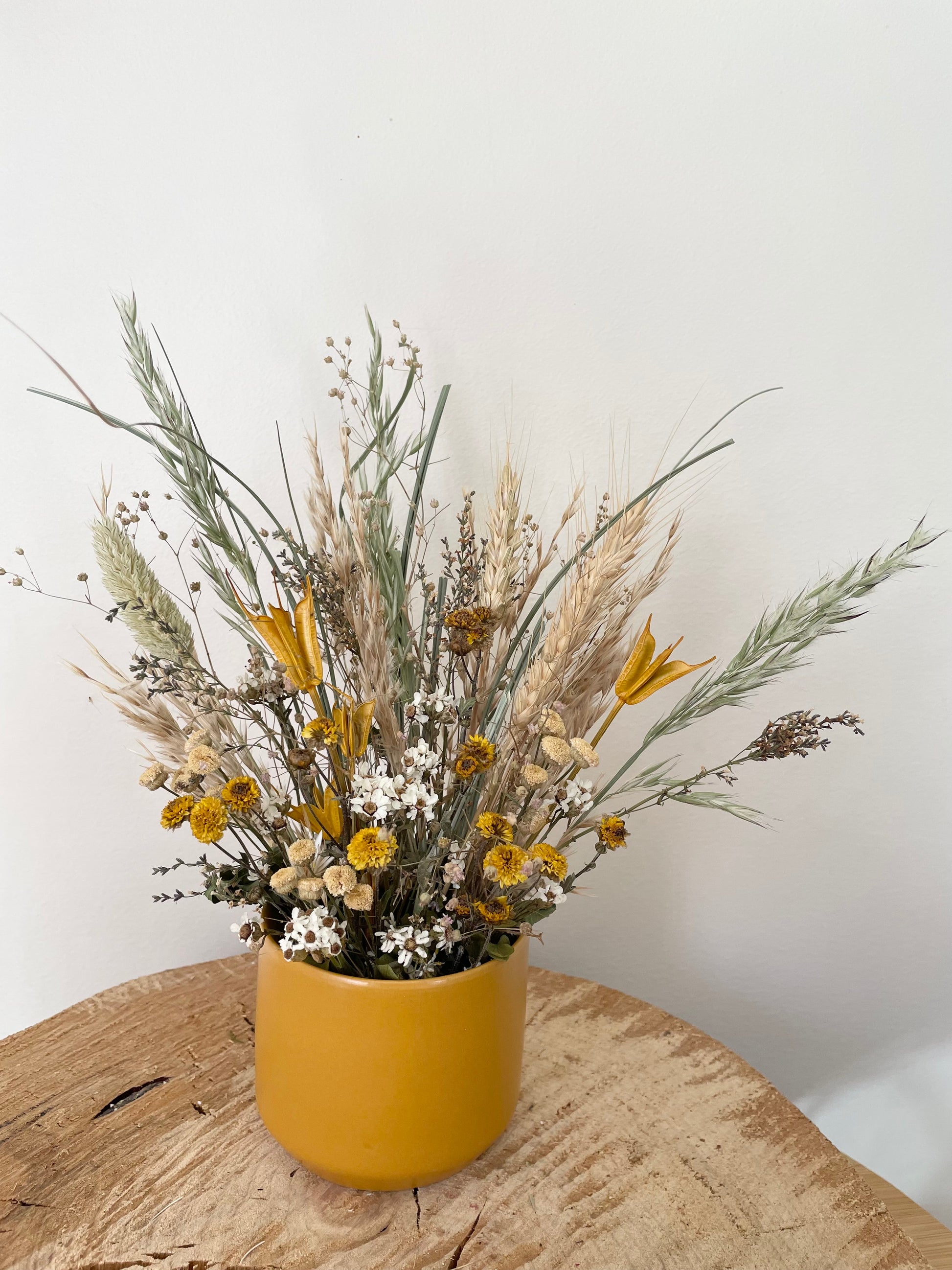 A mix of dried grasses, dried flowers and pods presented in a small mustard coloured pot.