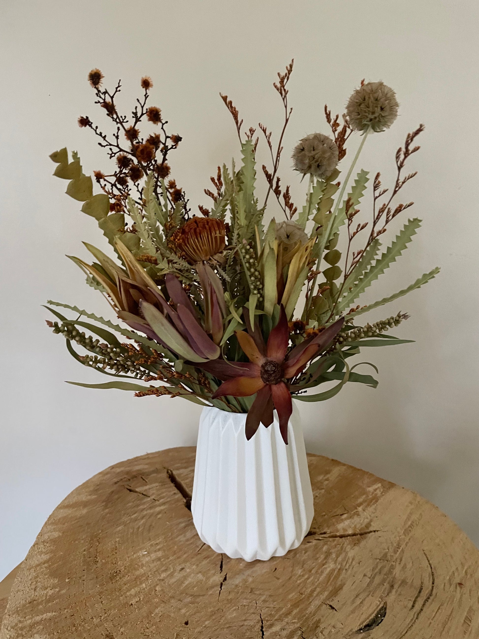 A small arrangement featuring natives in an earthy colour palette and presented in a white ribbed ceramic vase.