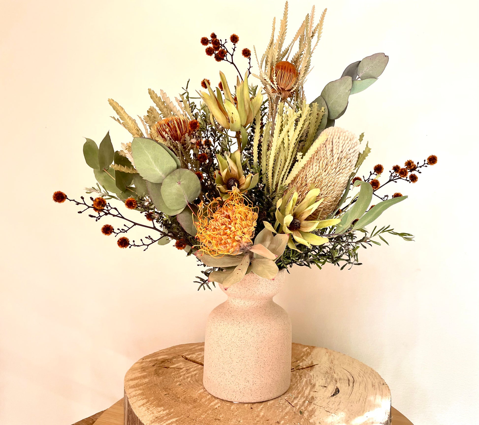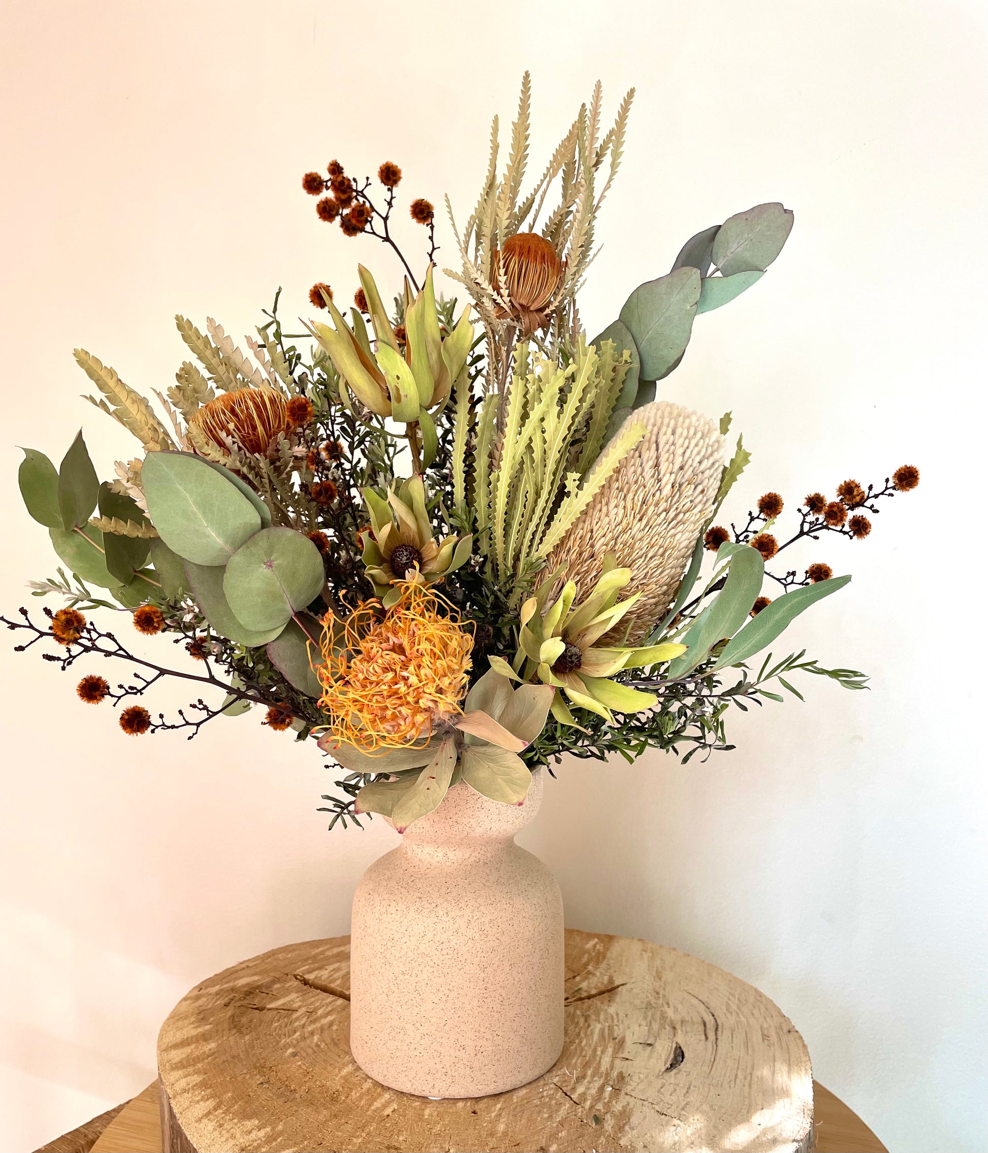 A gorgeous mix of dried natives in the rust, earthy colour palette in a sand colour ceramic pot. Arrangement measures 43cm at tallest stem tip with the pot alone measuring 14cm tall