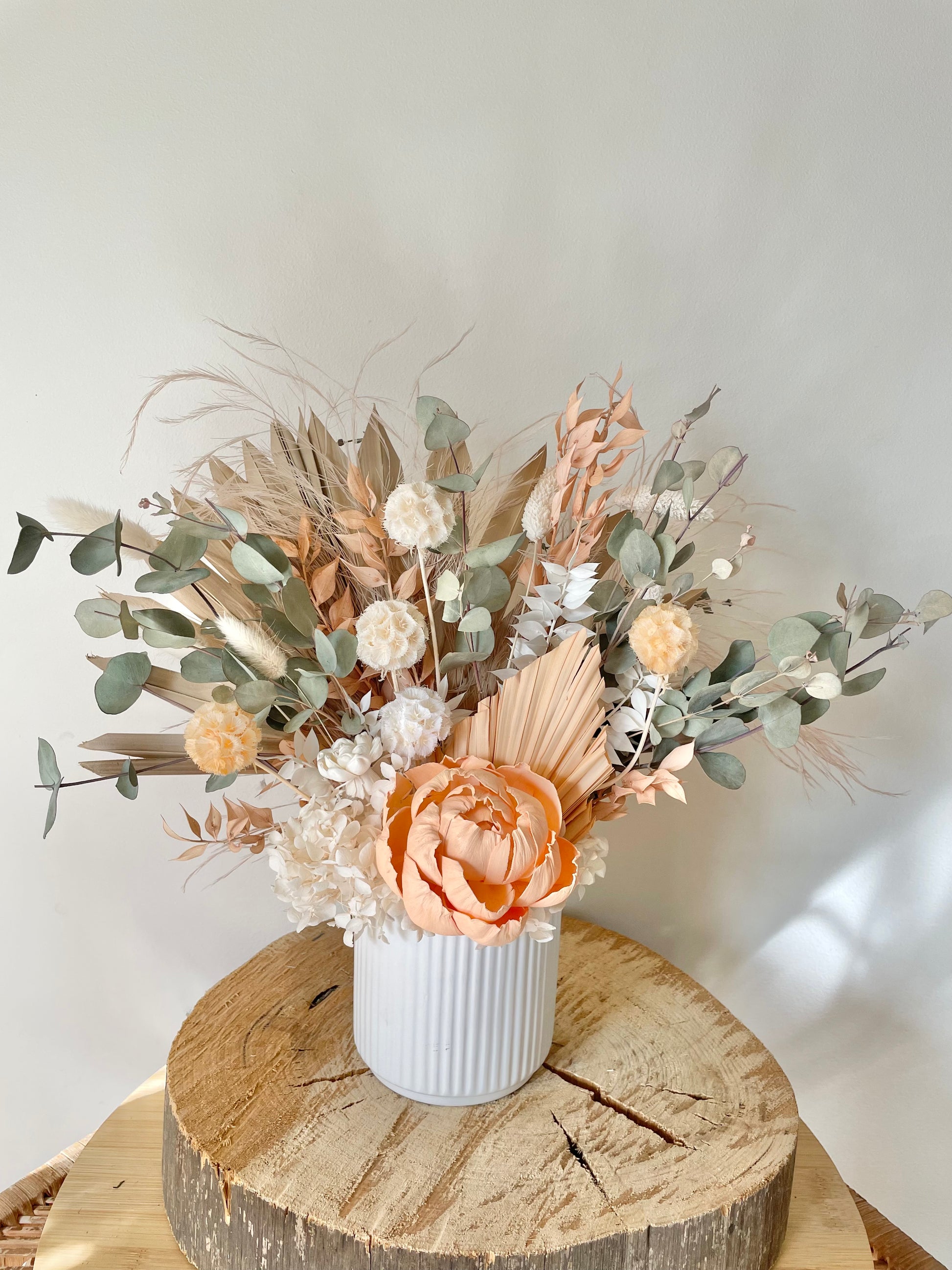 A mix of beautiful dried, preserved & sola flowers and foliages all arranged in a white ceramic pot with vertical lines.