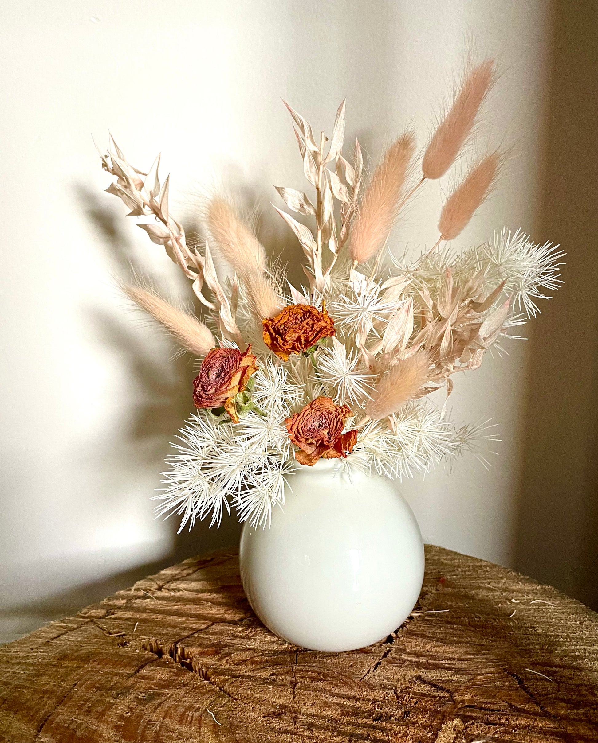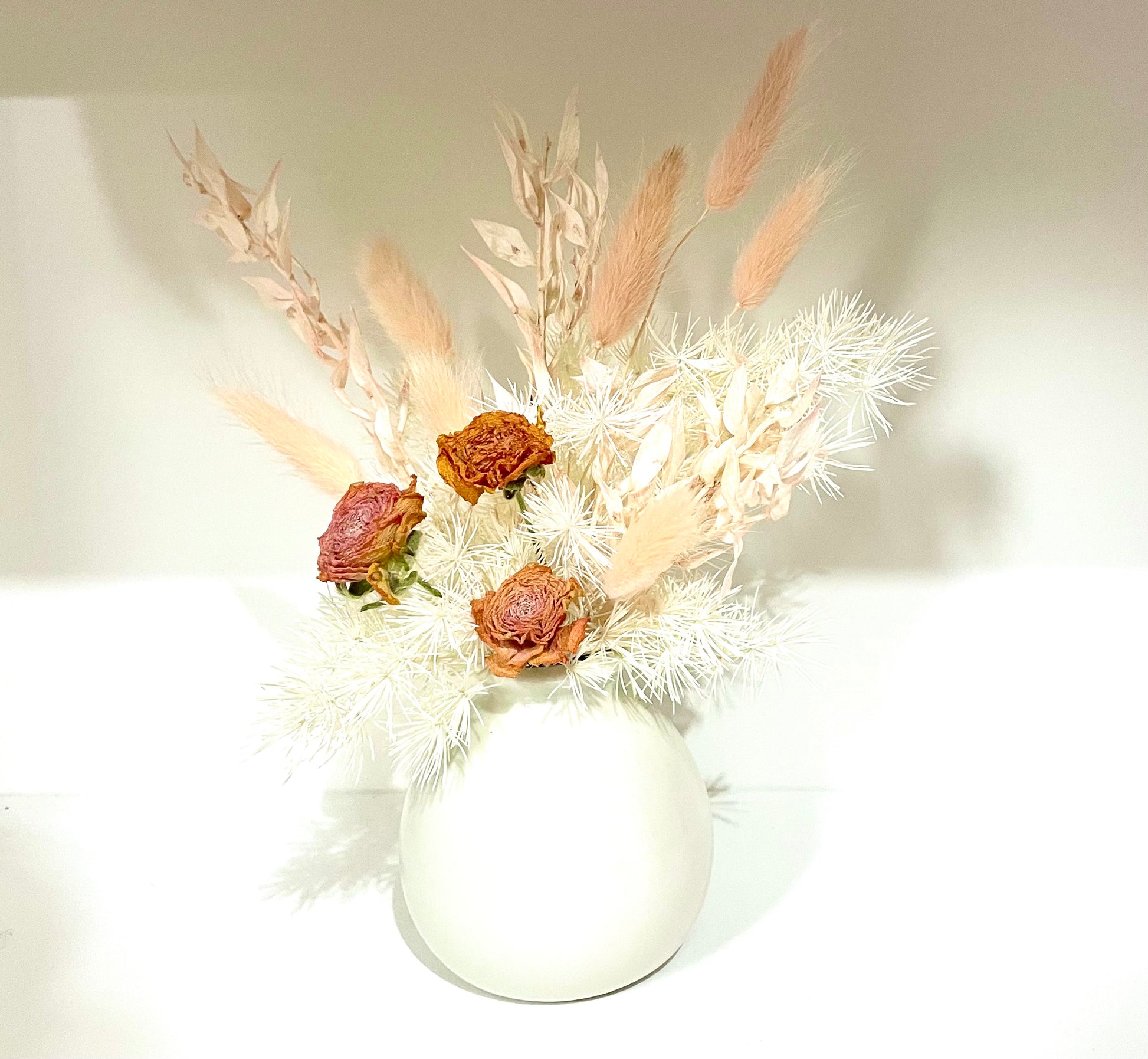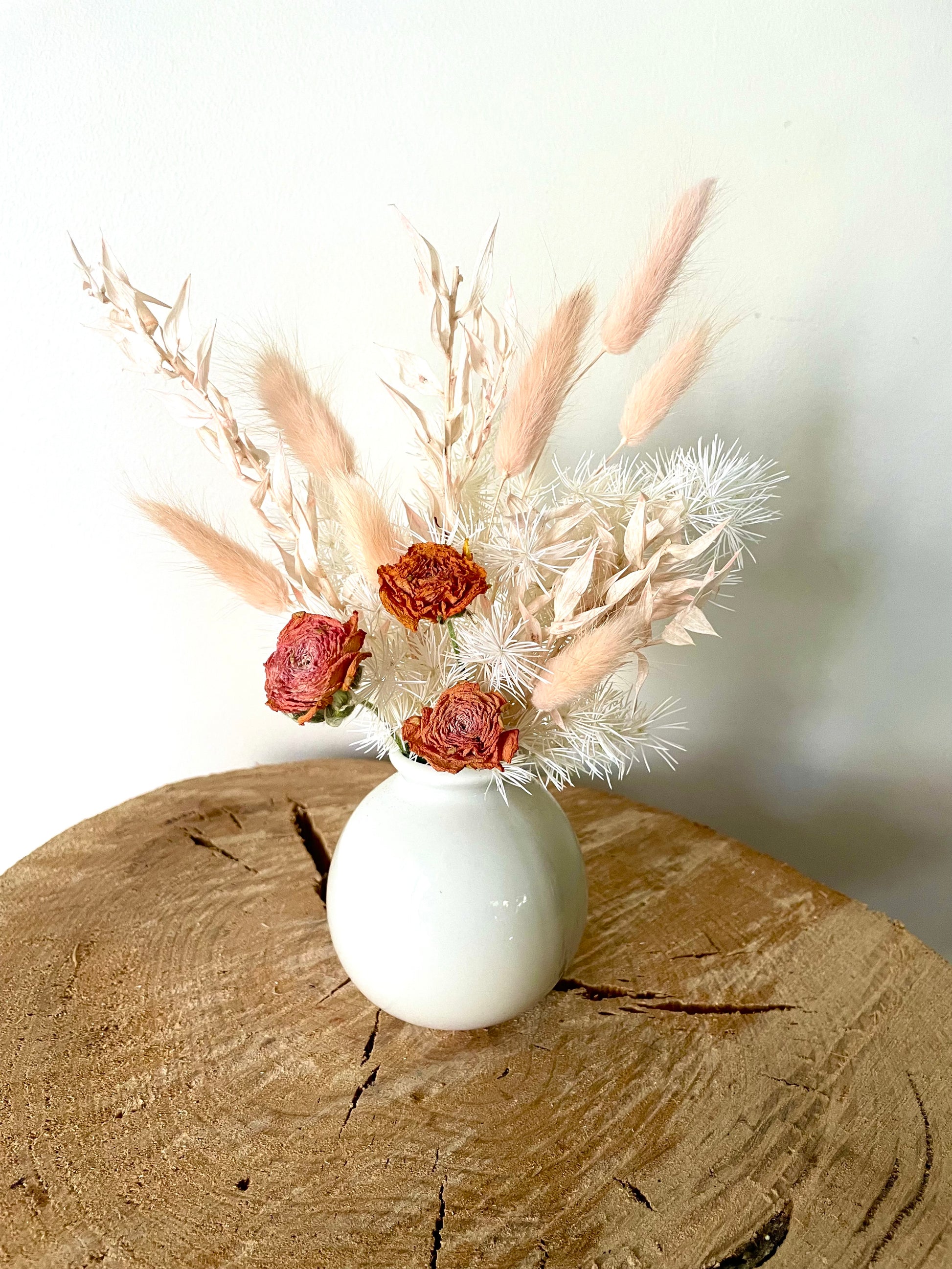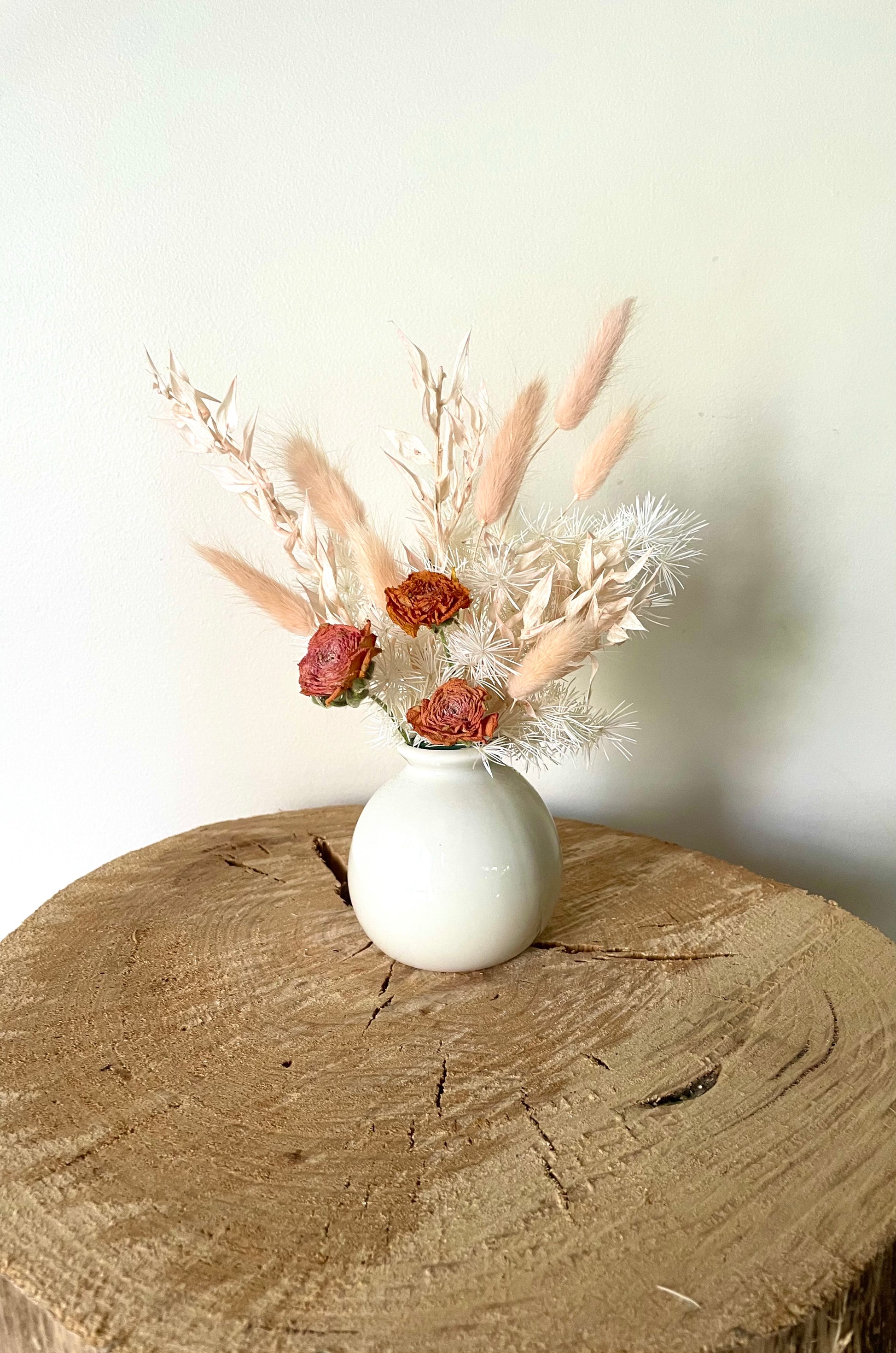 A mix of dried and preserved flowers and foliages in a white and peach colour palette presented in a white 7cm ceramic pot with the complete arrangement measuring 17cm tall