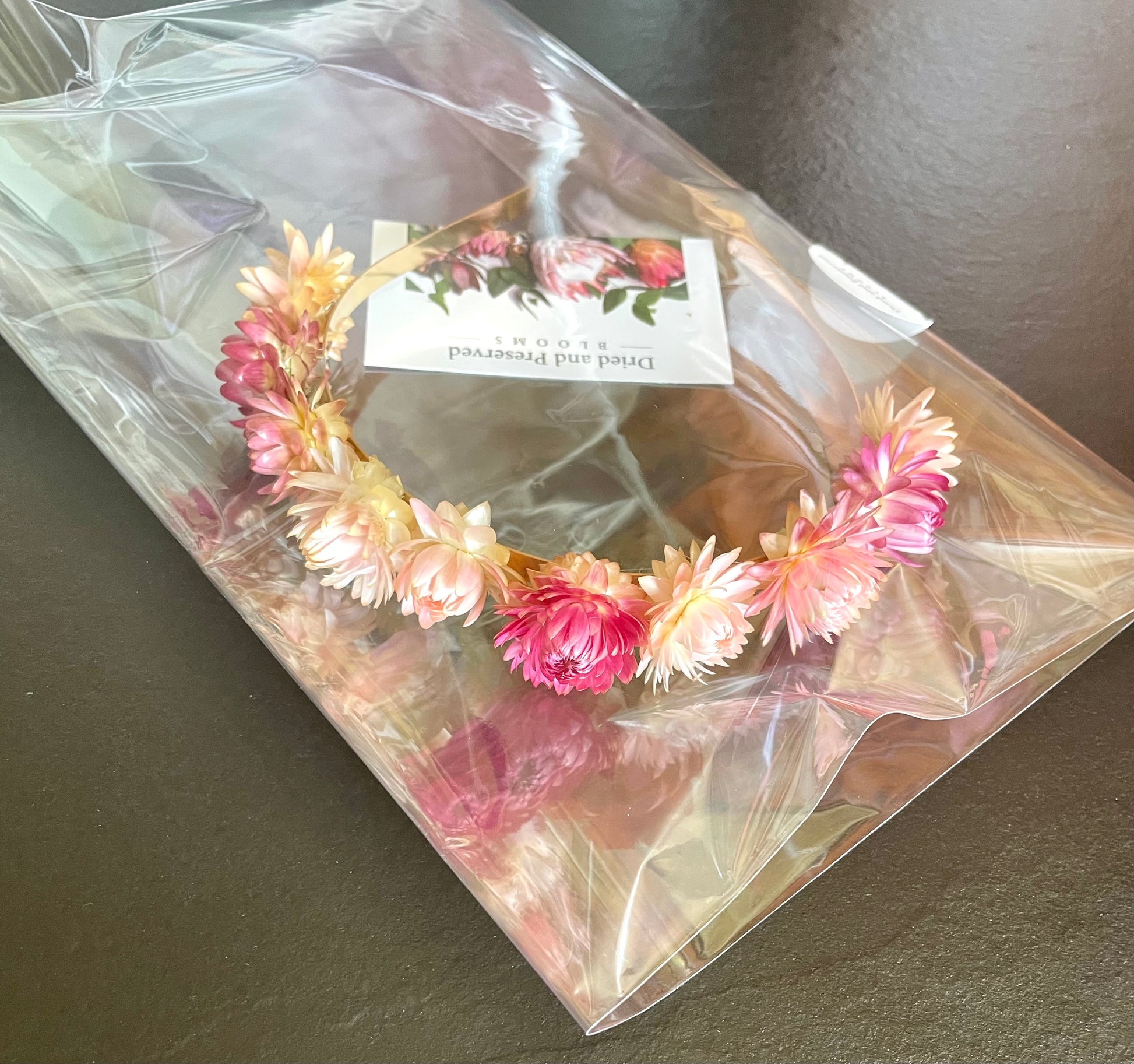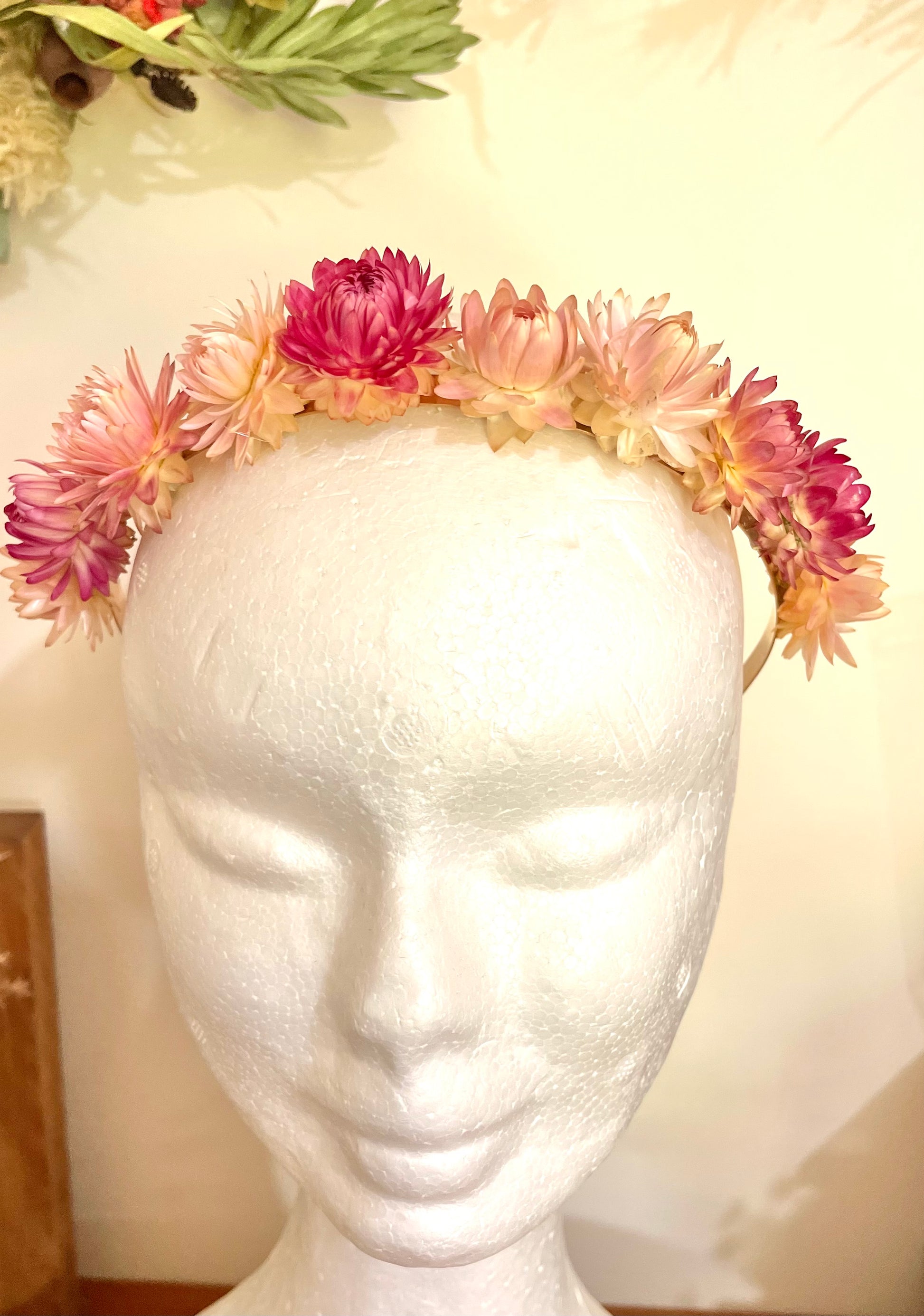 A cute gold head band filled with strawflowers in a mix of pinks!