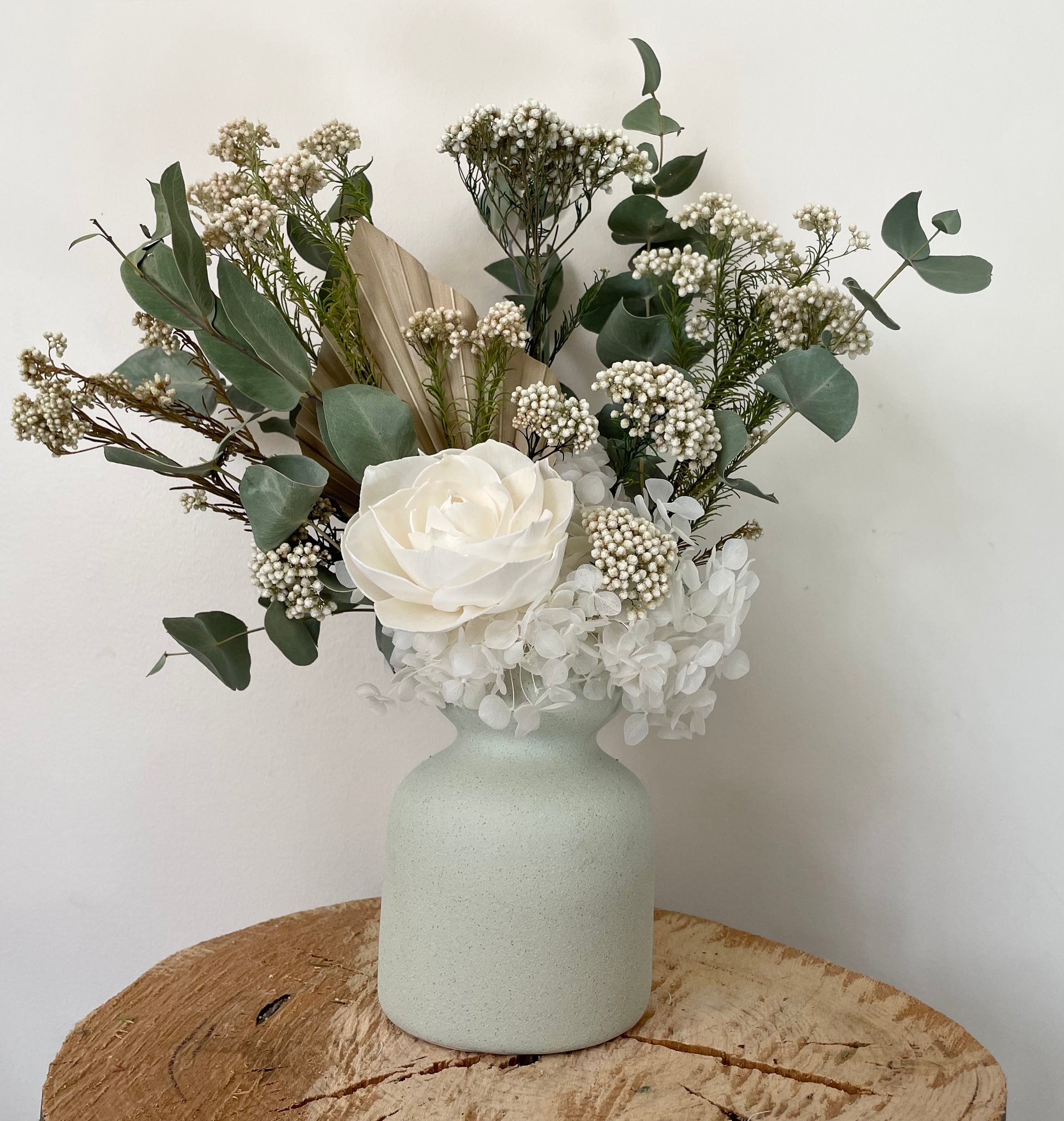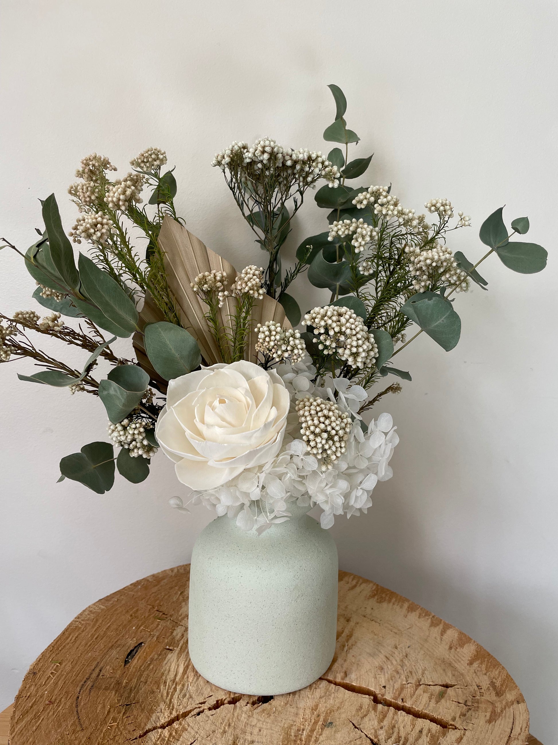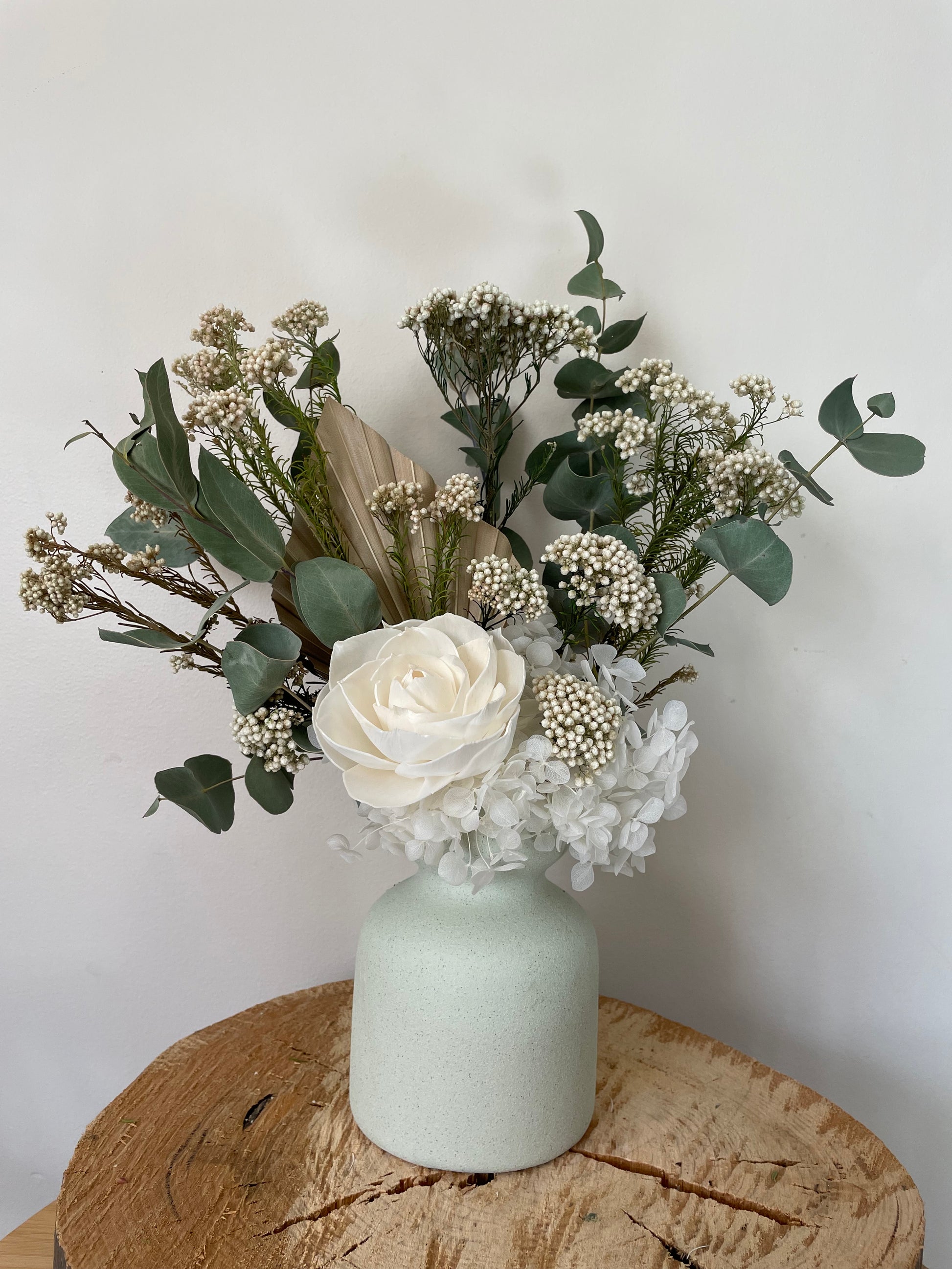 Beautiful dried eucalyptus, rice flowers & palm spear with preserved hydrangea & a gorgeous cream sola rose bud presented in a premium quality ceramic very soft mint vase/pot.