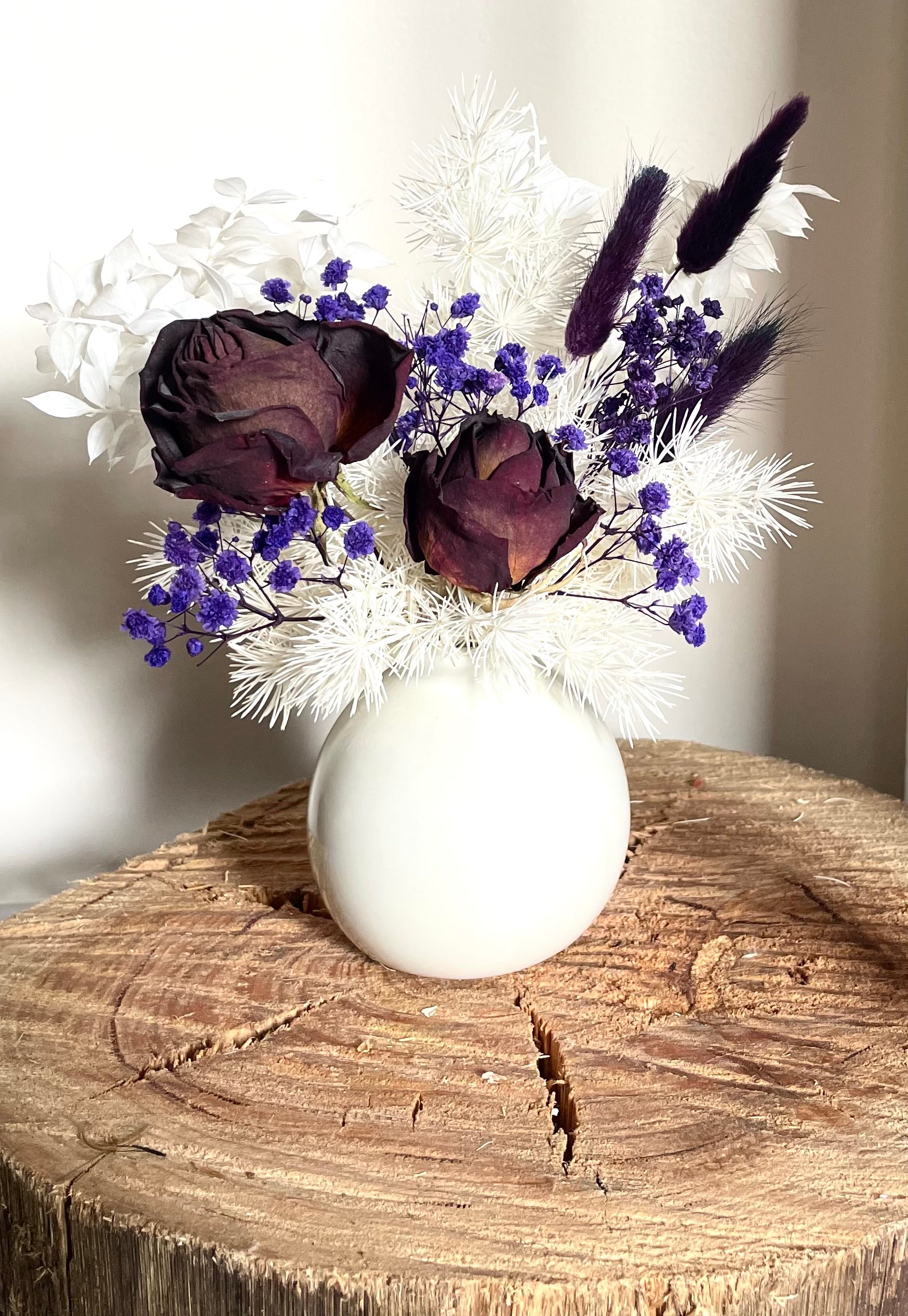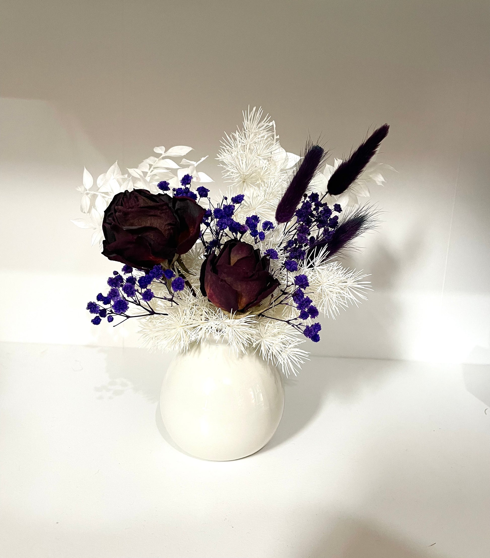 A mix of dried and preserved flowers and foliages in a white and purple palette presented in a white 7cm ceramic pot with the complete arrangement measuring 18cm at tallest stem tip