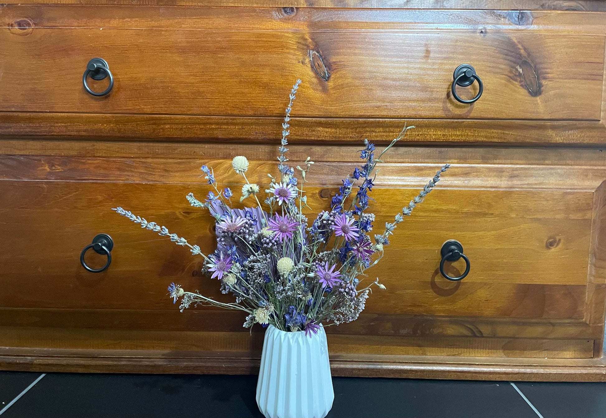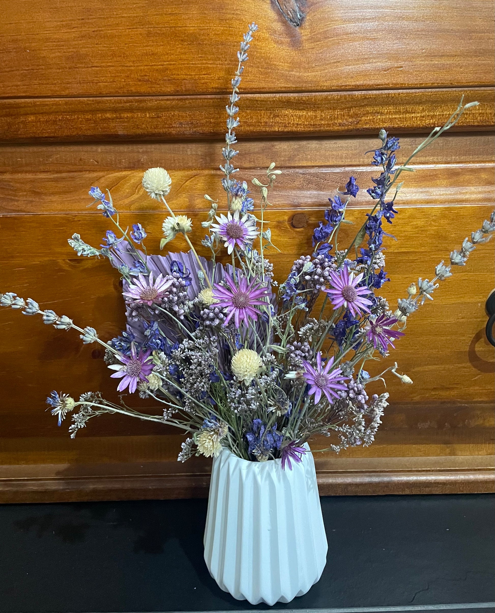 Pretty purples! A variety of carefully selected dried flowers and foliages in a purple palette presented in a white ceramic pot. Completed arrangement measures 30cm tall with the pot alone measuring 10cm tall