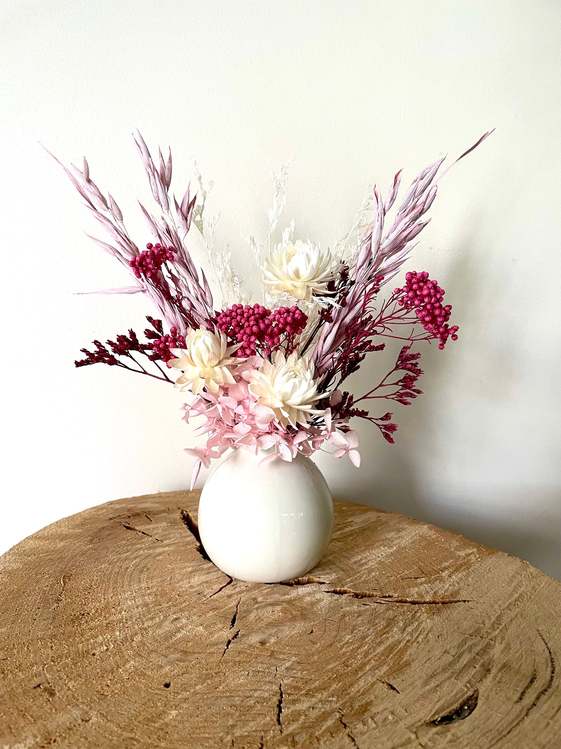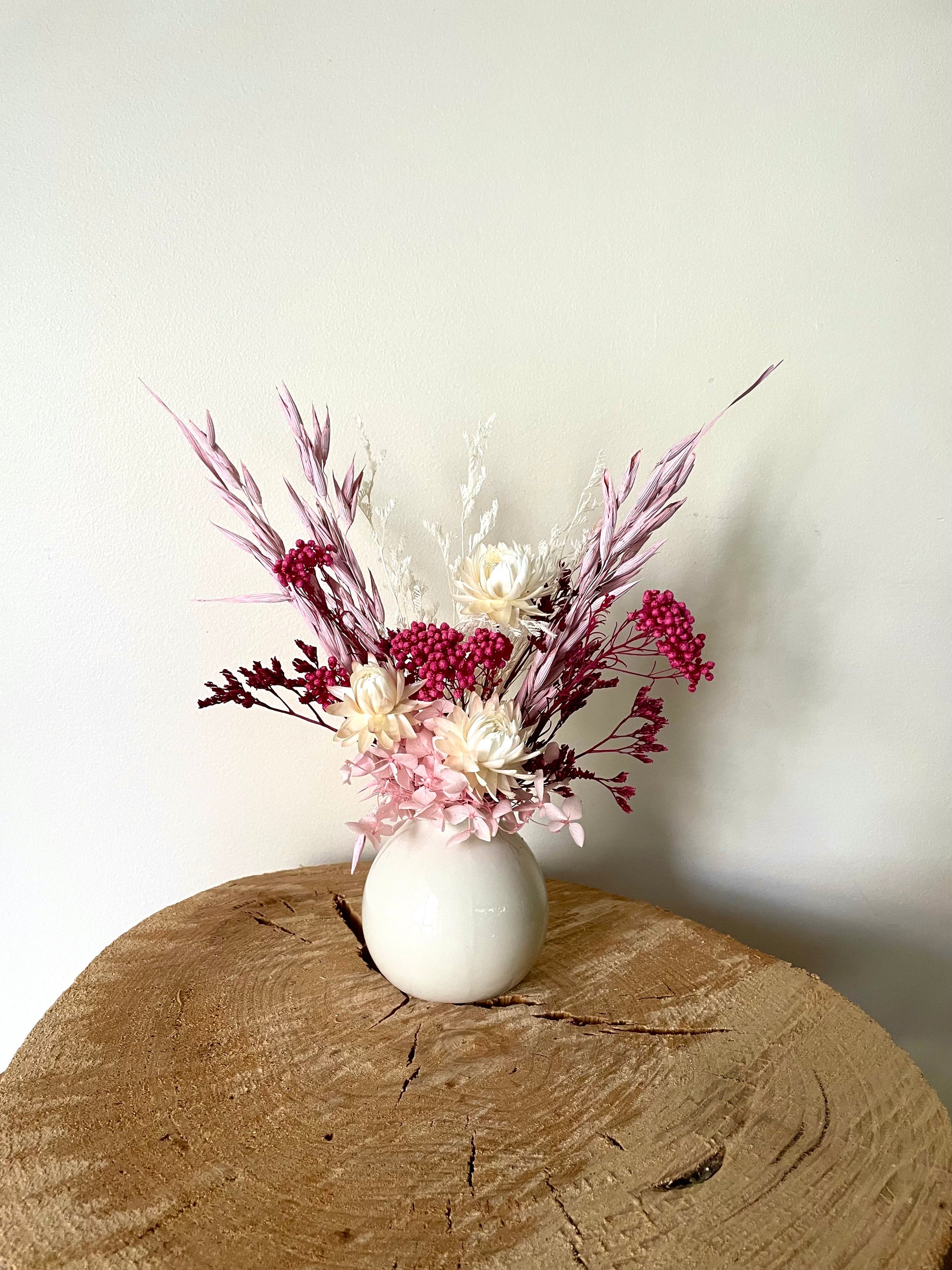 A pretty mix of dried and preserved flowers and foliages in a mix of pinks & whites presented in a mini white 7cm ceramic pot with the complete arrangement measuring 22cm at the tallest stem tip