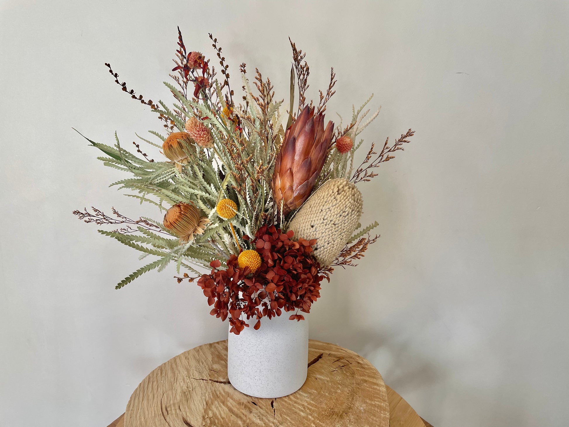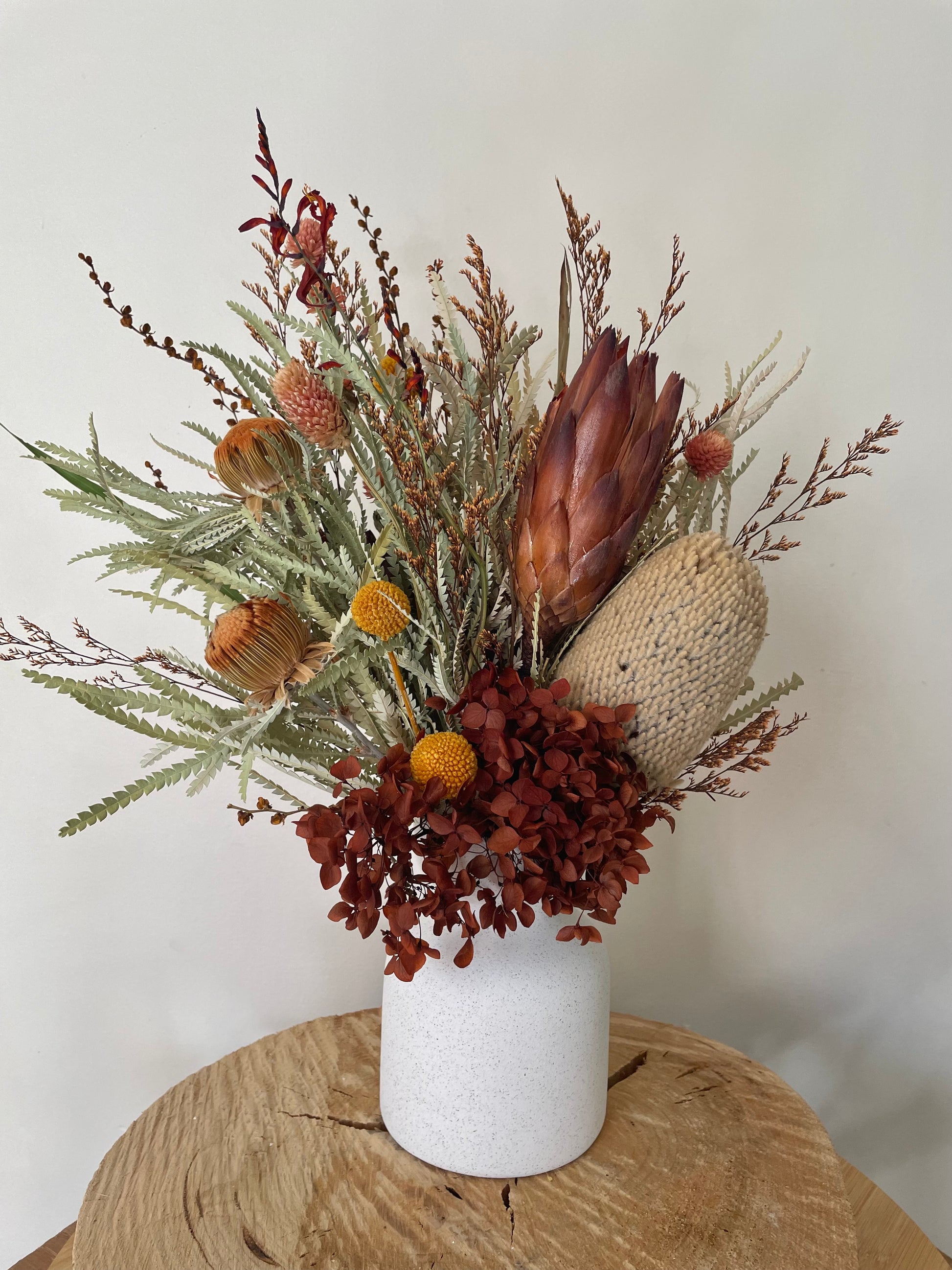 A gorgeous colour palette! A mix of dried protea, native banksia & Dyandra, billy buttons, rust foliages, green native foliages all presented in a quality white ceramic pot.