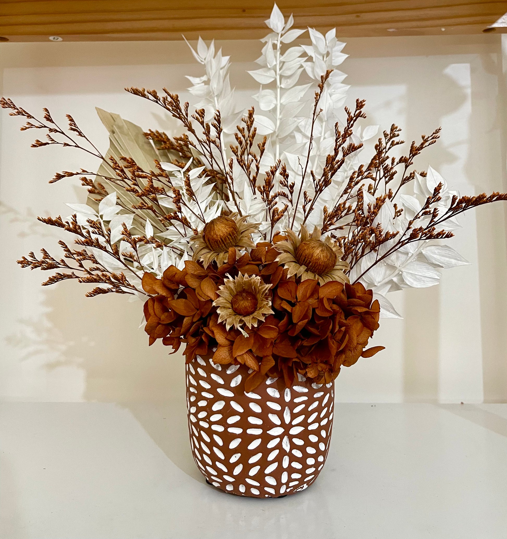 A small dried flower arrangement in a small rust ceramic pot . A mix of dried and preserved flowers and foliages in a rust colour palette.