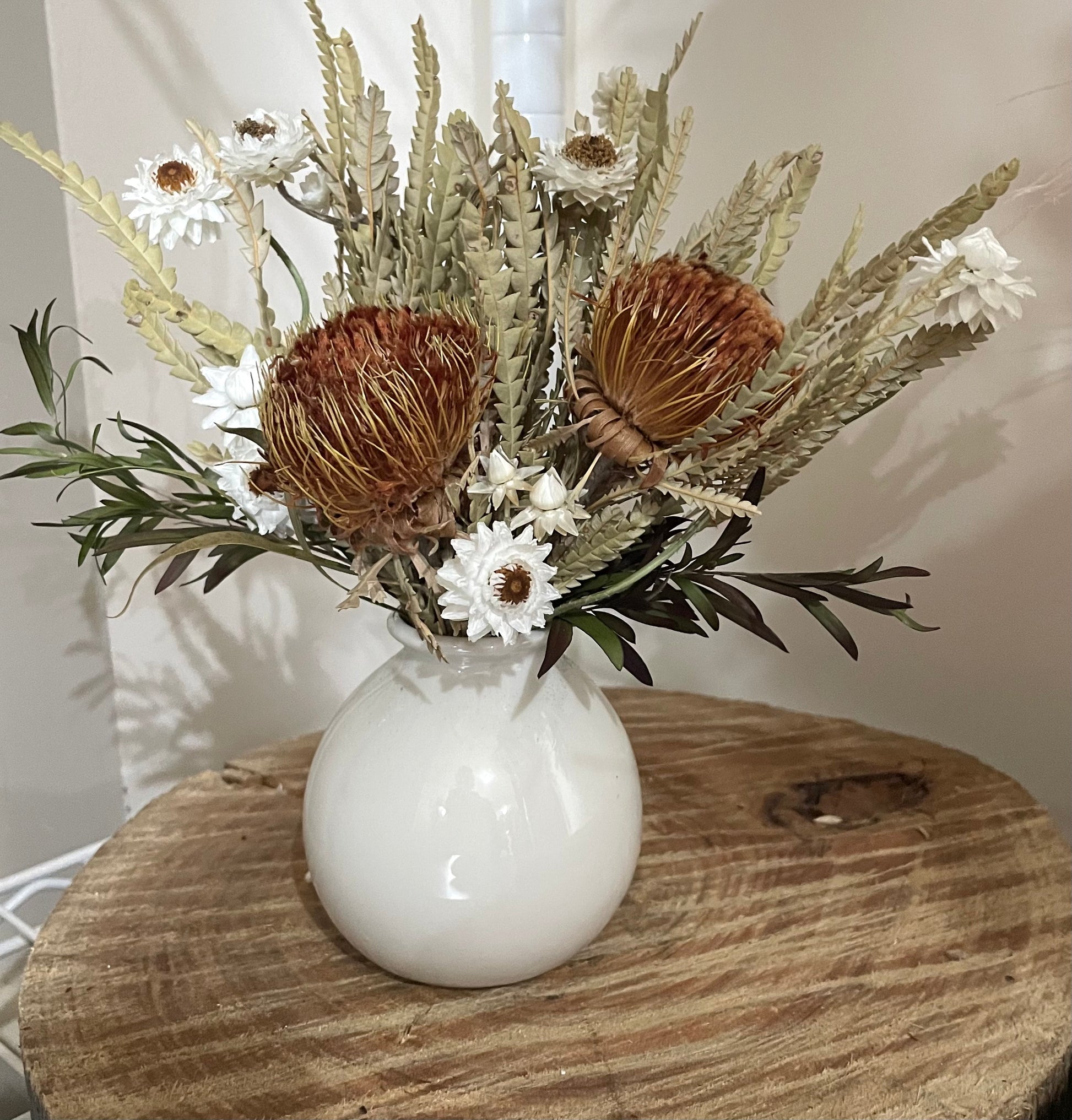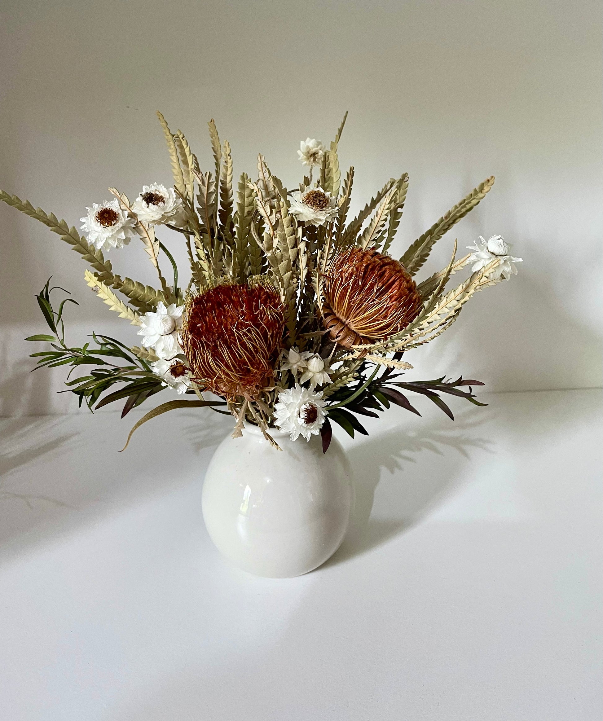 A Gorgeous rust colour palette in a white ceramic 7cm pot, beautiful native flowers & foliages