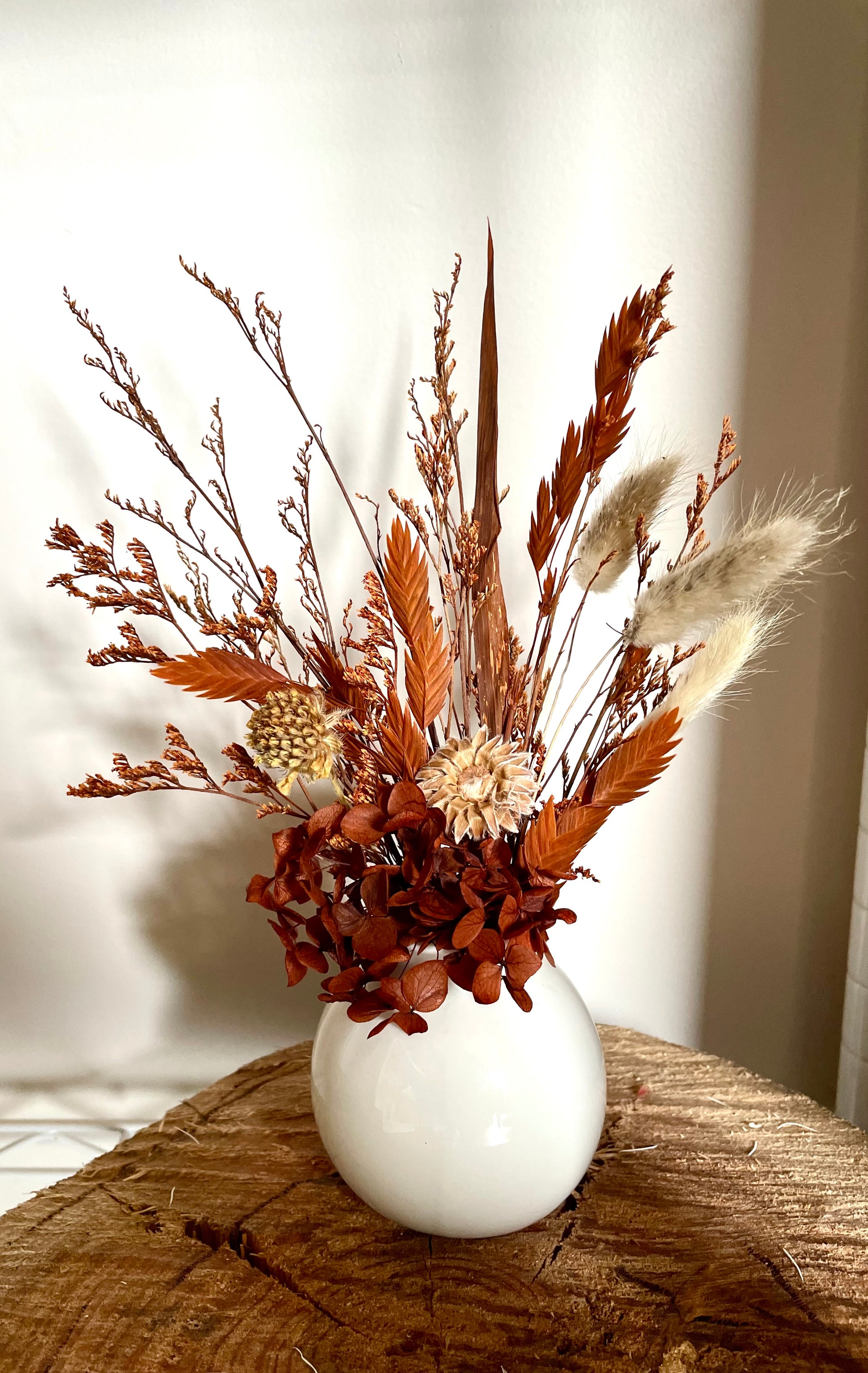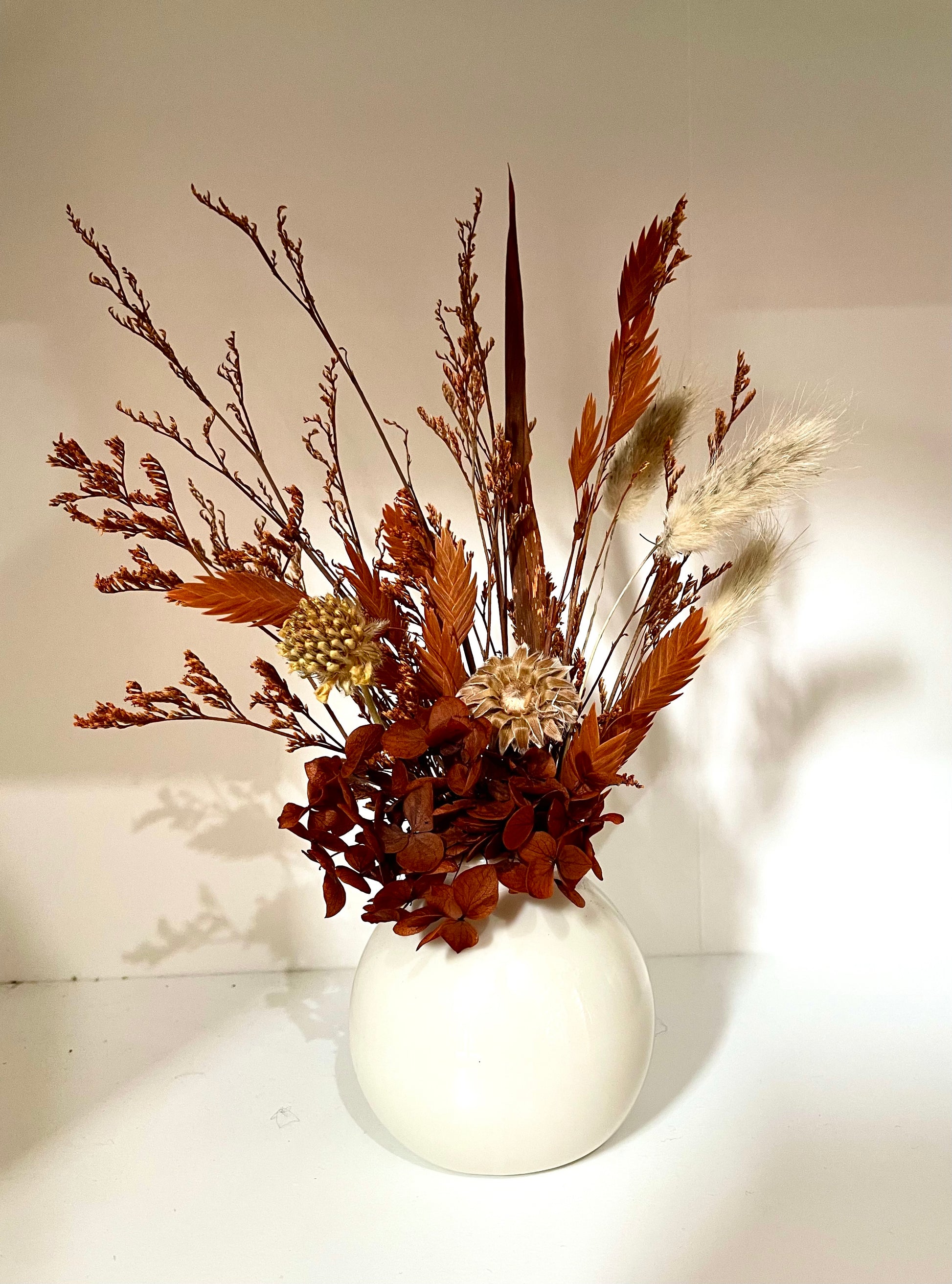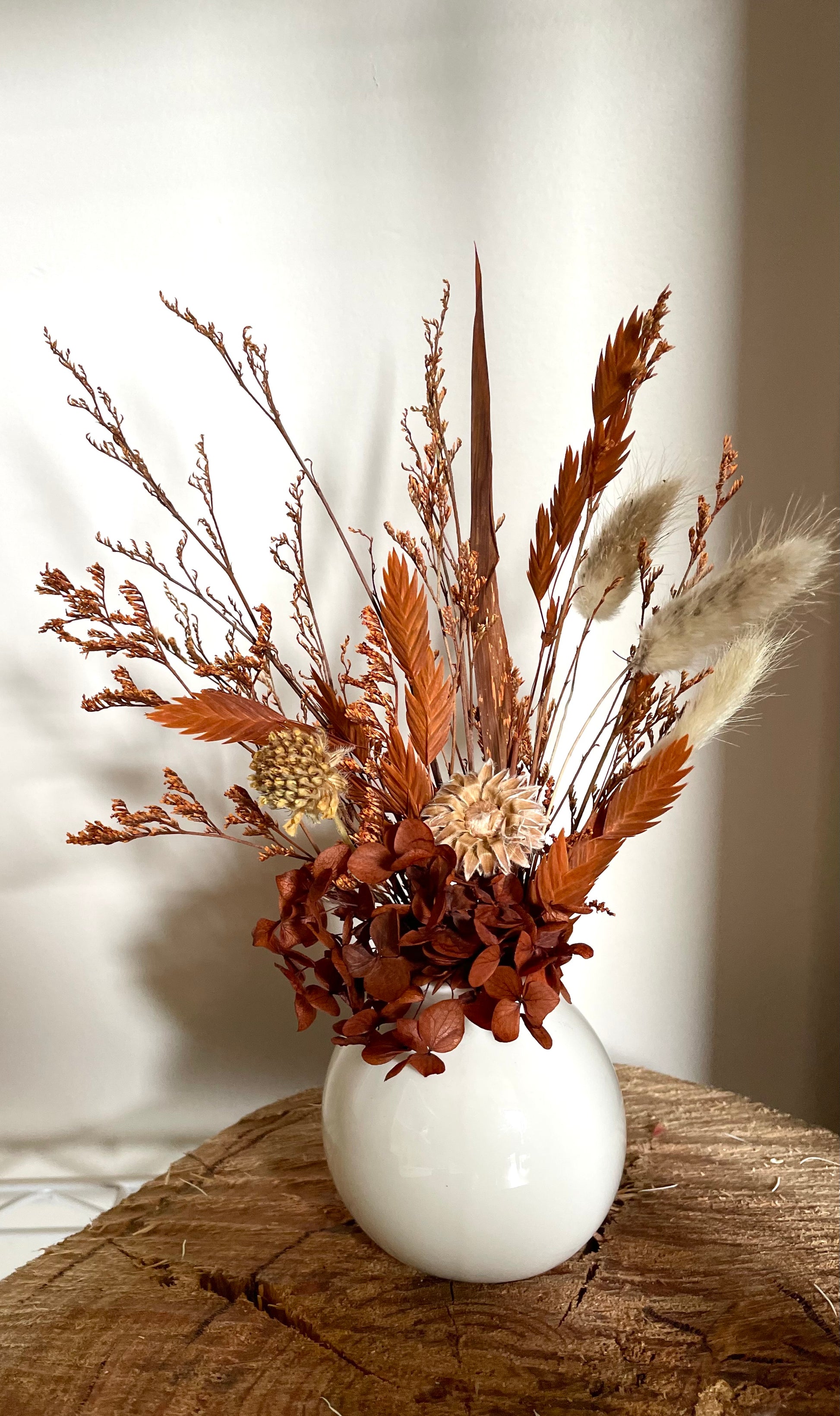 A mix of dried and preserved flowers in a rust colour palette presented in a white 7cm ceramic pot with the complete arrangement measuring 21cm tall