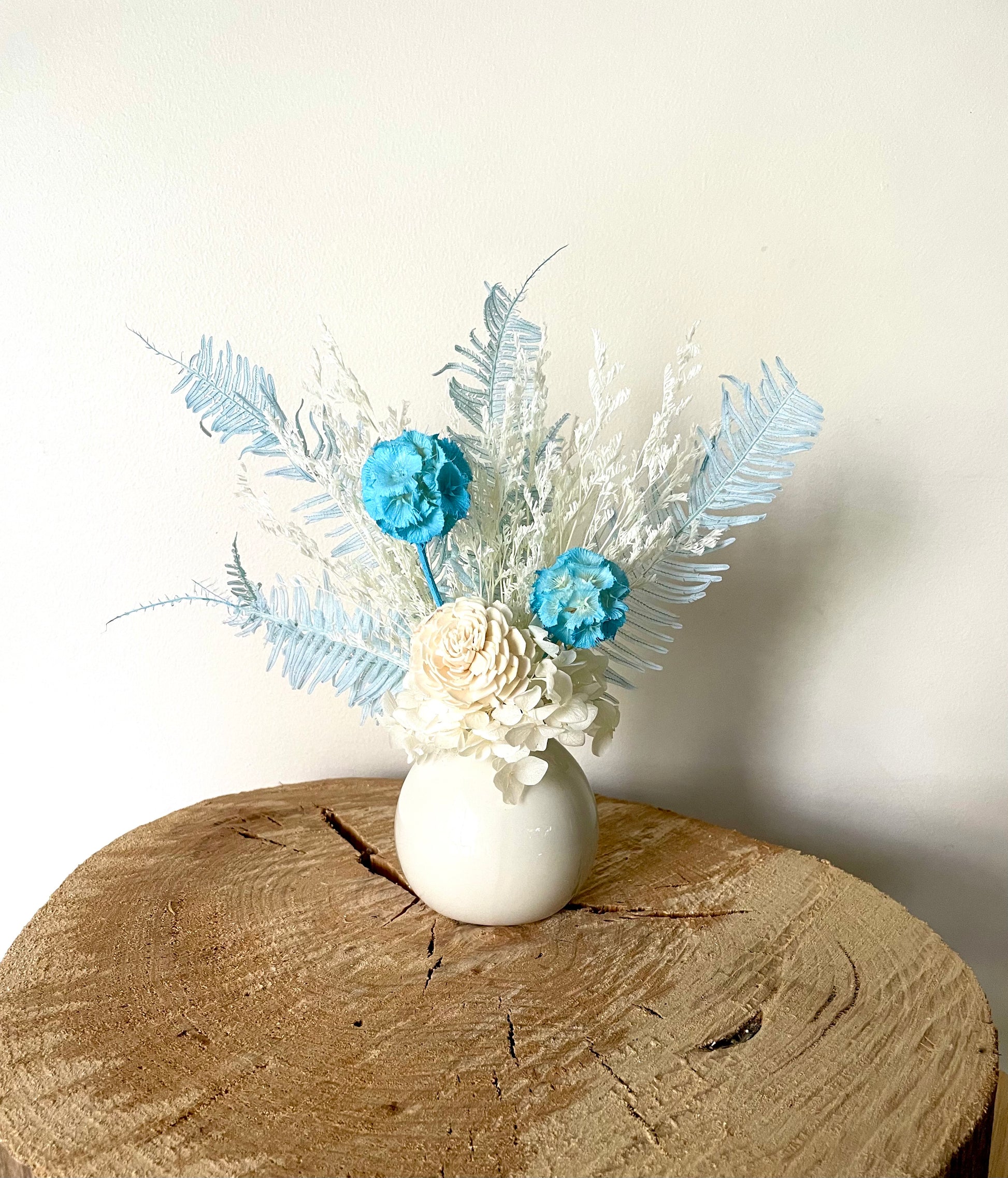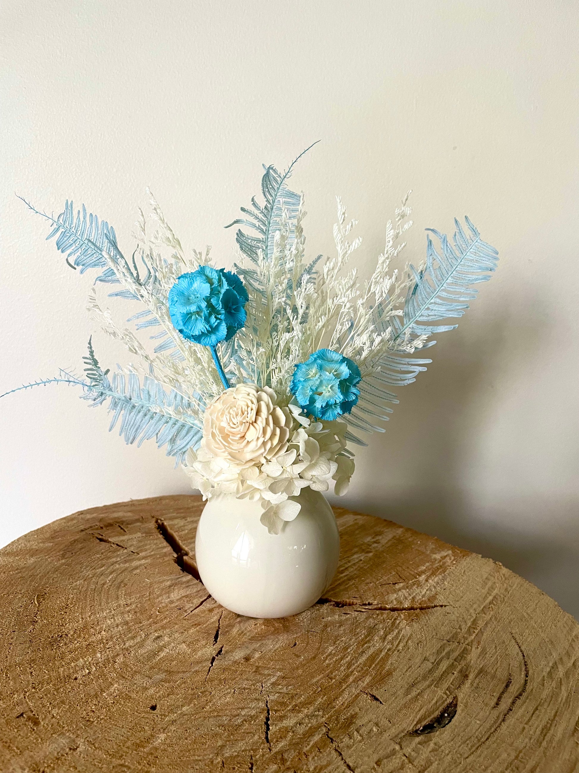 A mix of dried and preserved flowers and foliages in a white colour palette with pops of light blue, presented in a mini white 7cm ceramic pot with the complete arrangement measuring 20cm at the tallest stem tip