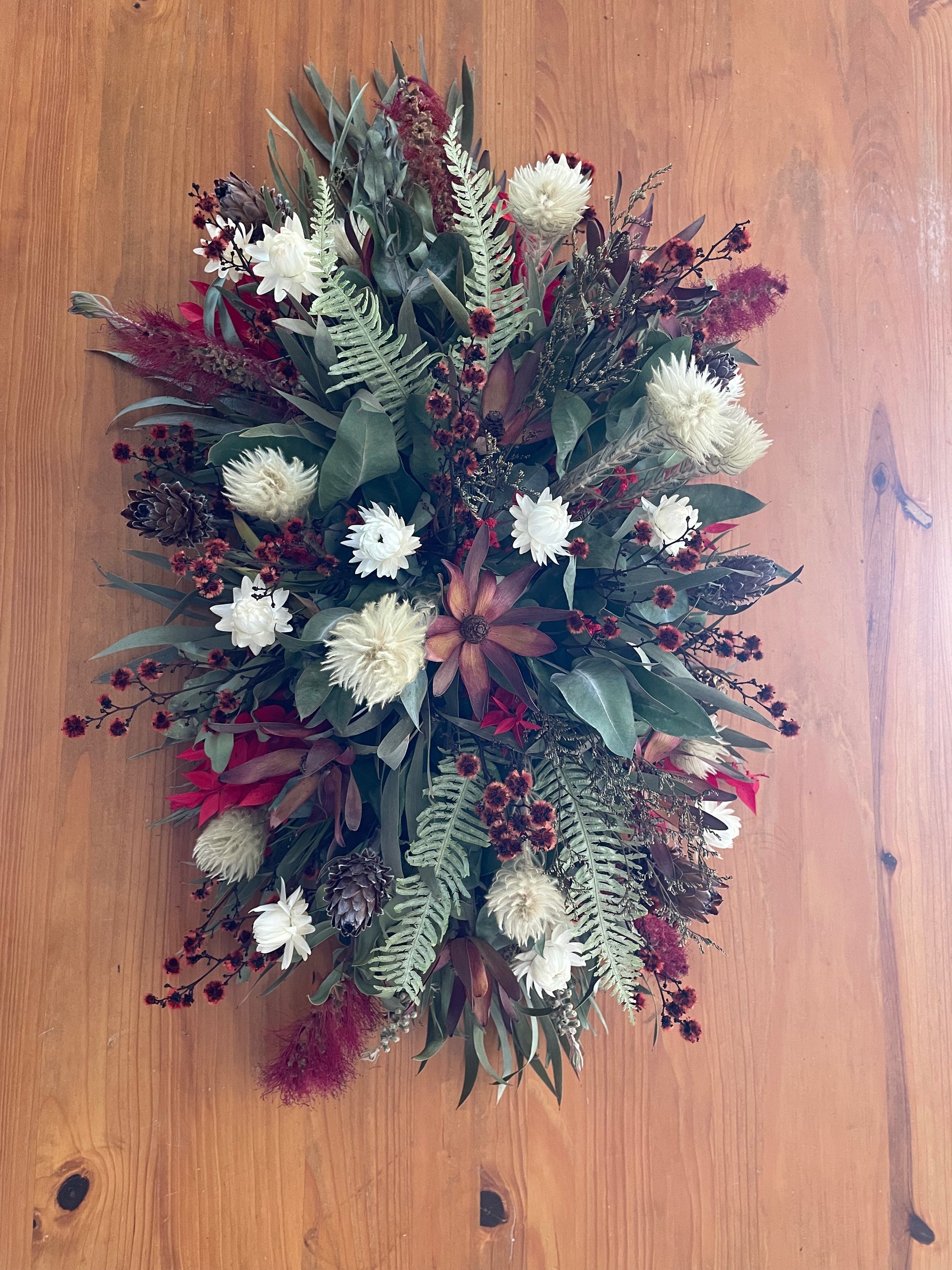 A mix of native flowers and foliages with the basis being a red colour palette with pops of lemon and white amongst the native greenery.