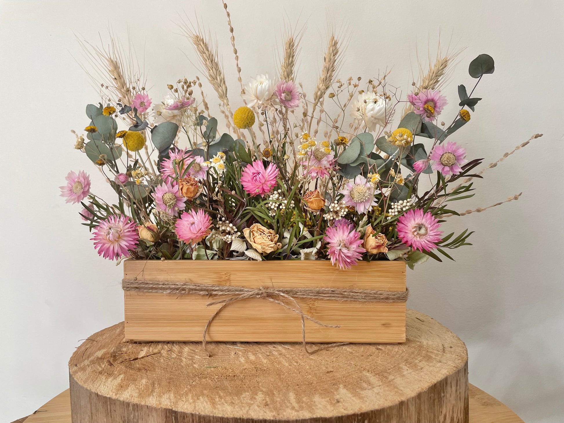 A bamboo planter box filled with dried flowers and foliages to replicate a small cottage garden.
