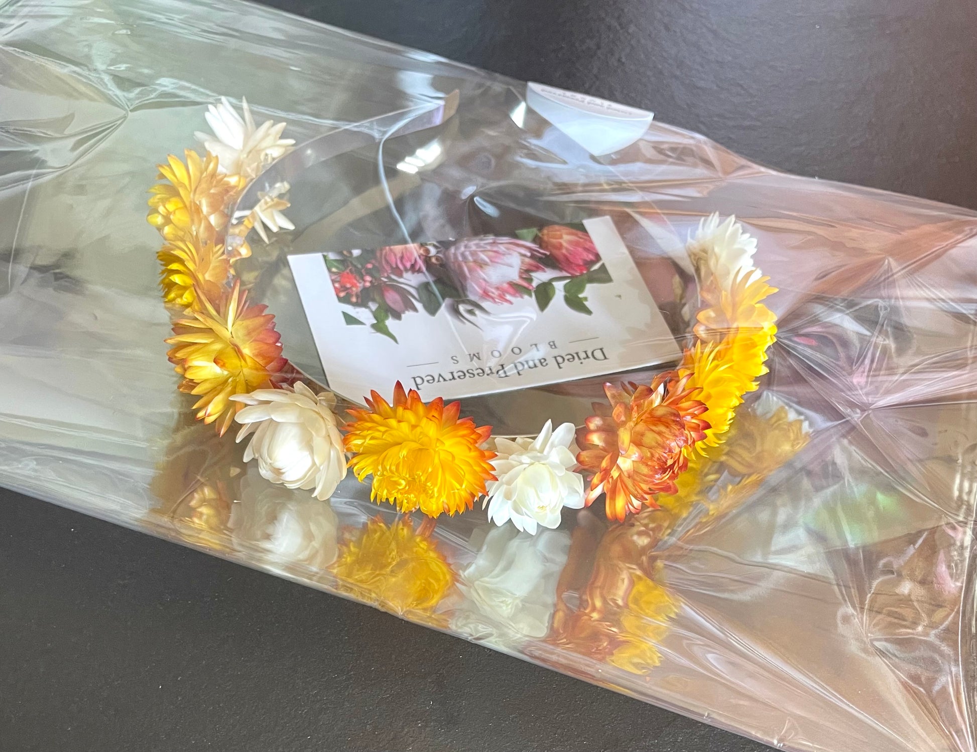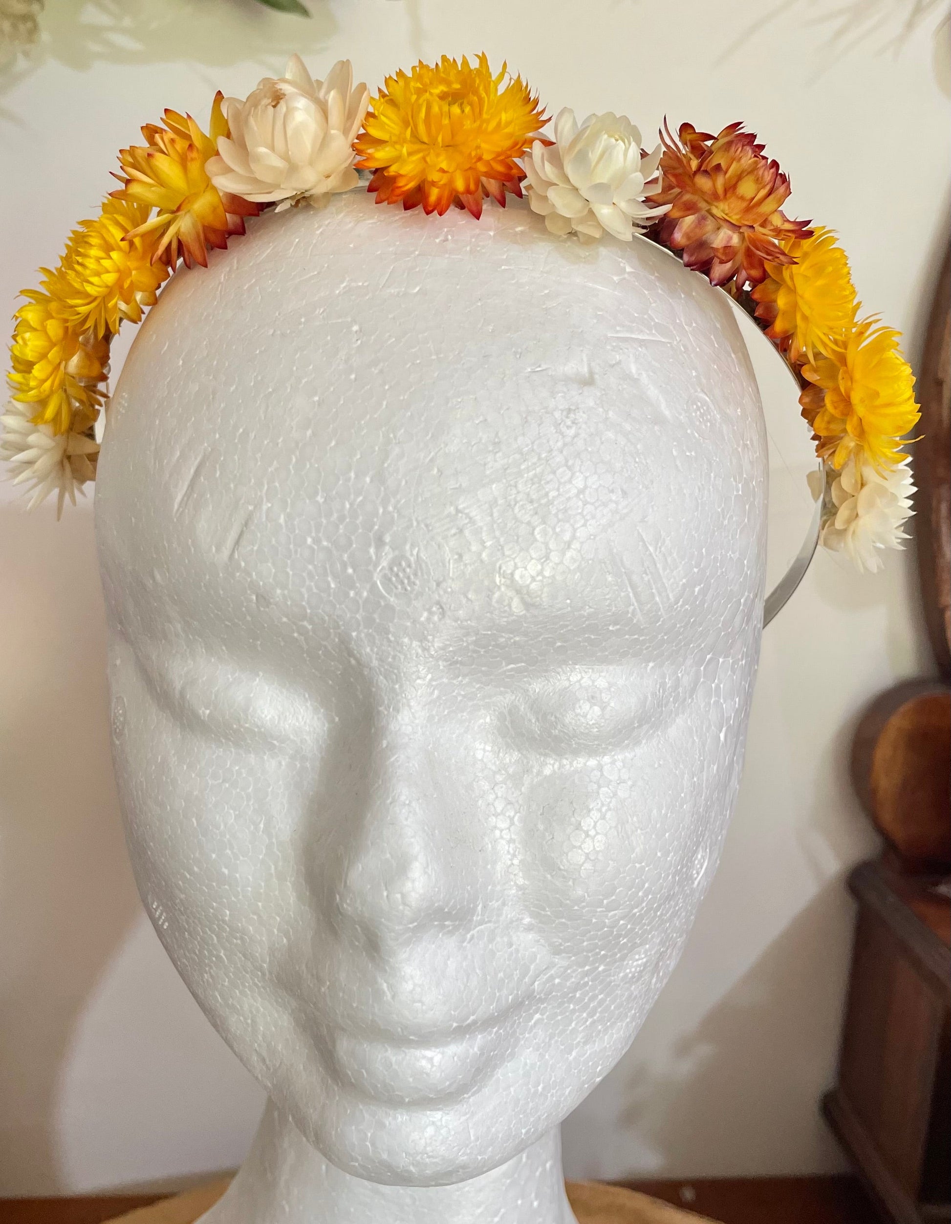 A cute silver headband filled with a mixed colour palette of yellow, oranges & cream Strawflowers.