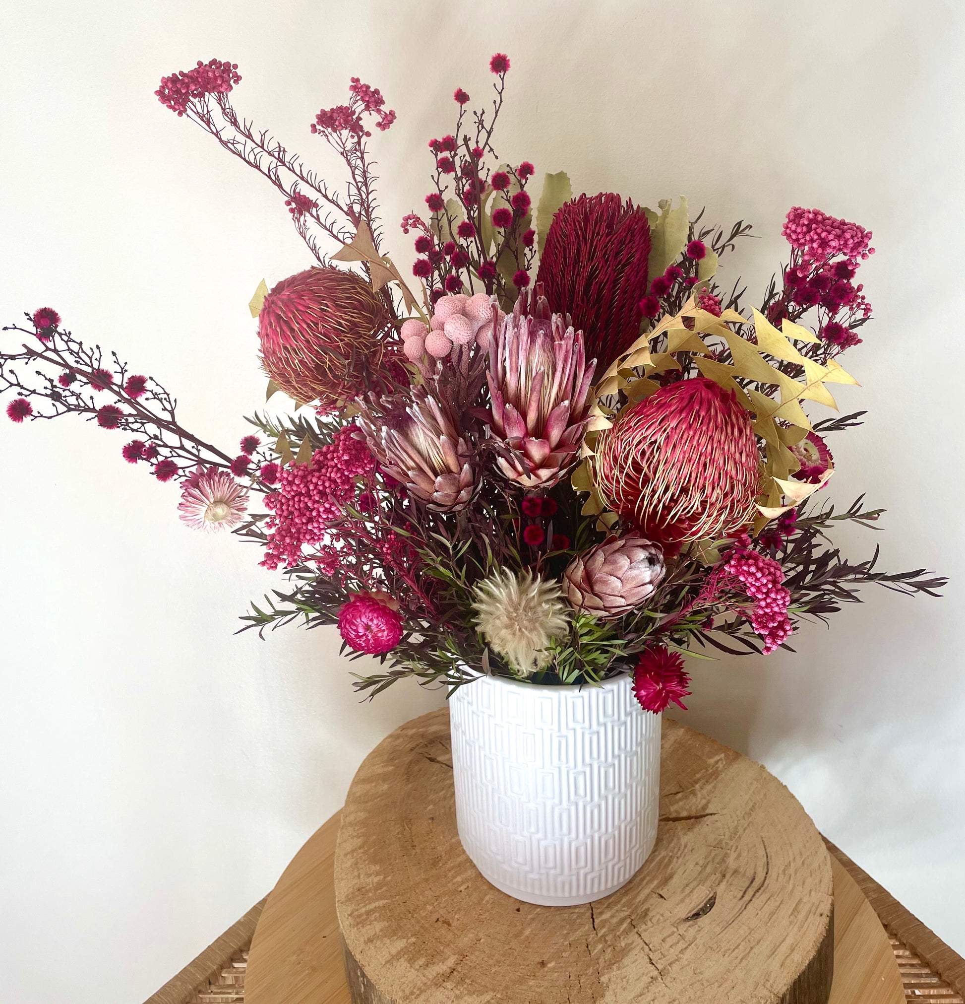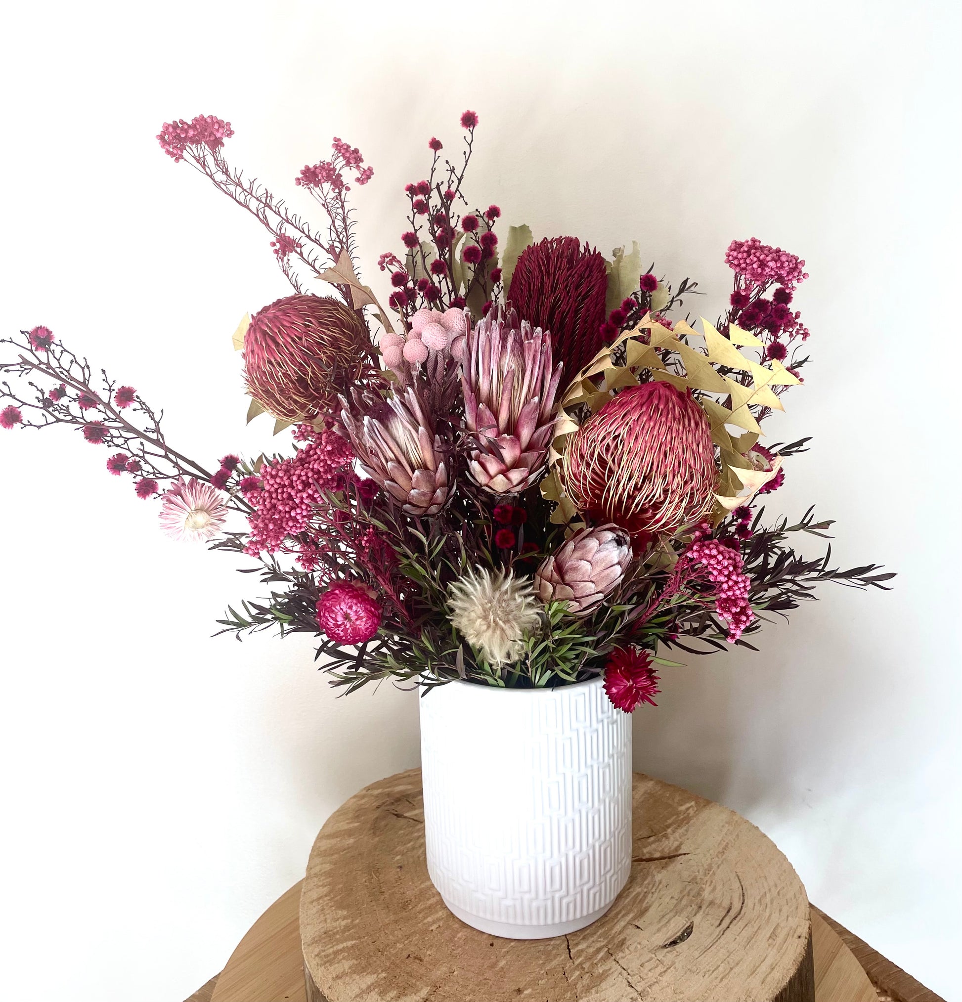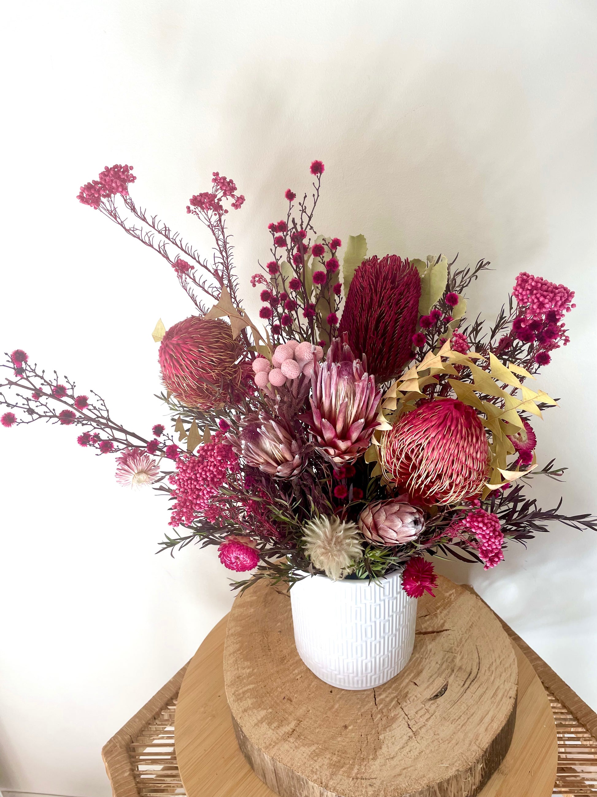 A mix of beautiful dried native flowers, proteas & native foliages, a mix of pinks colour palette all presented in a white ceramic pot,