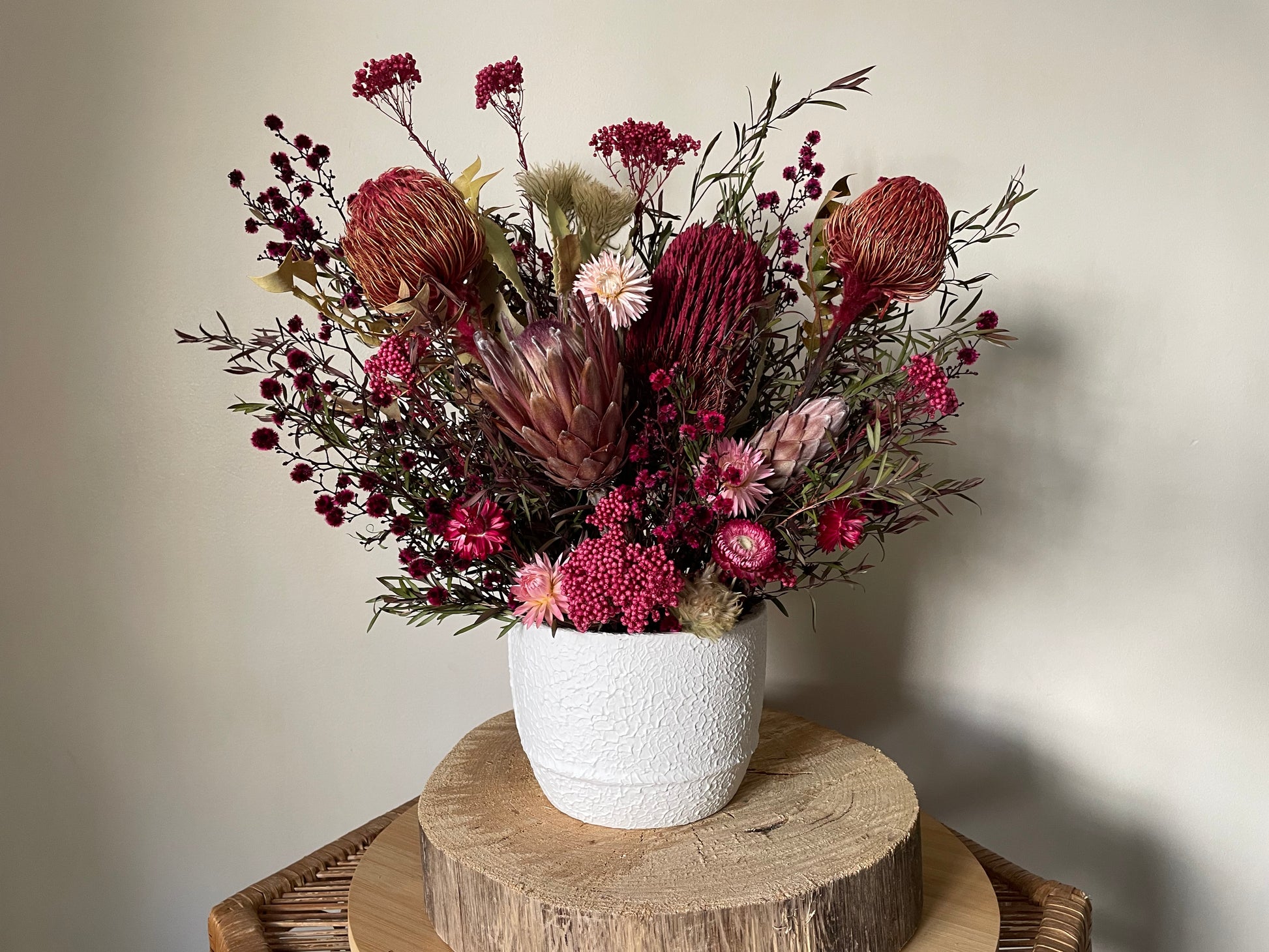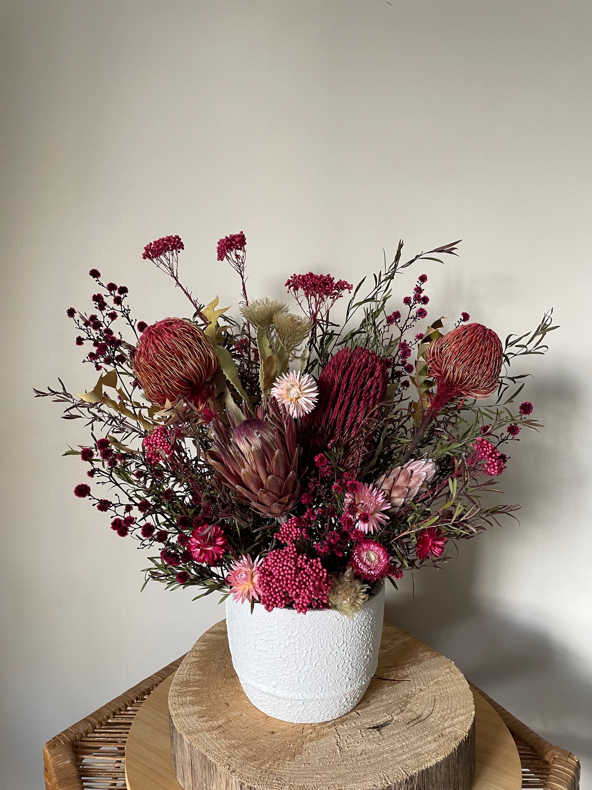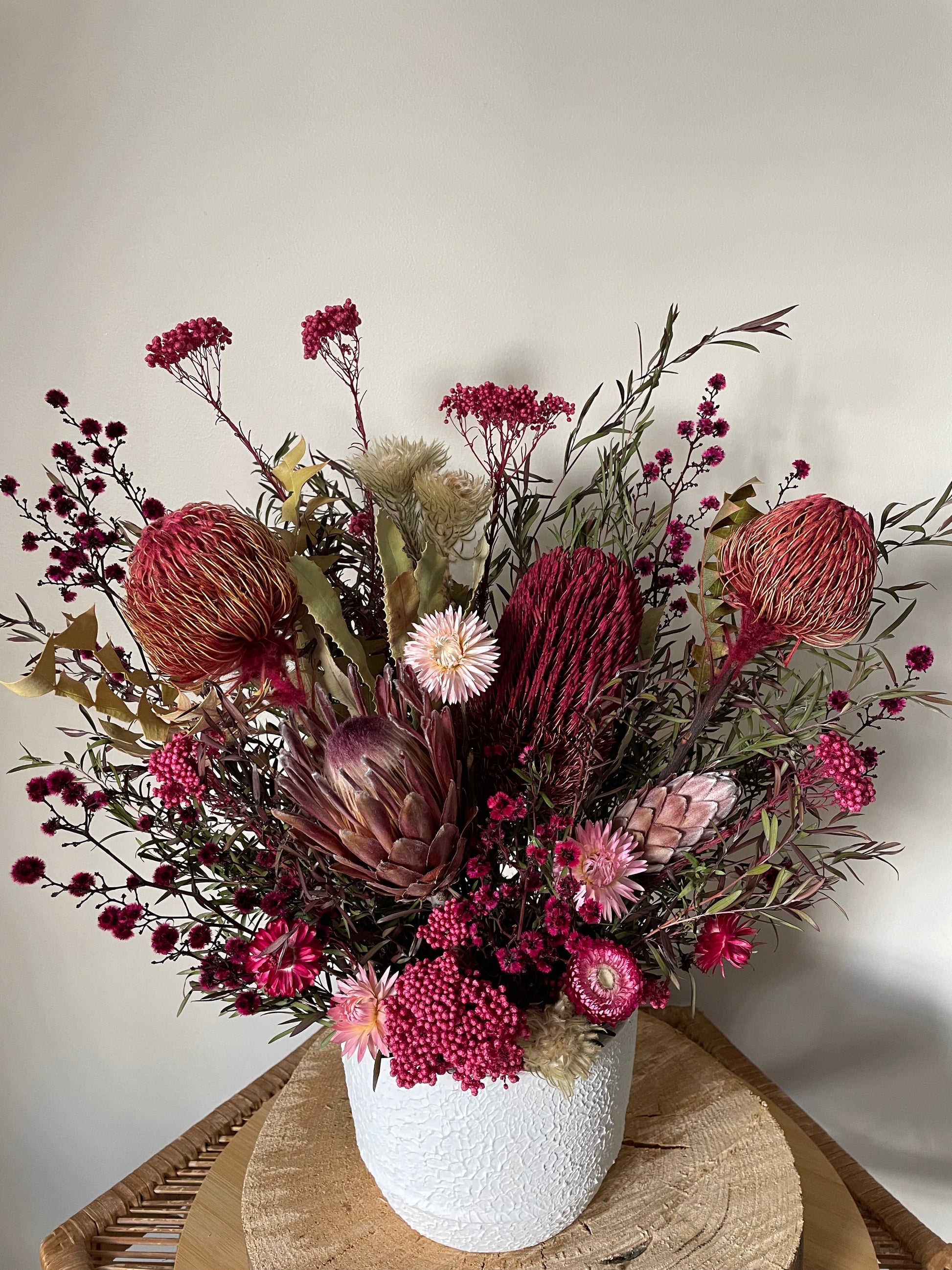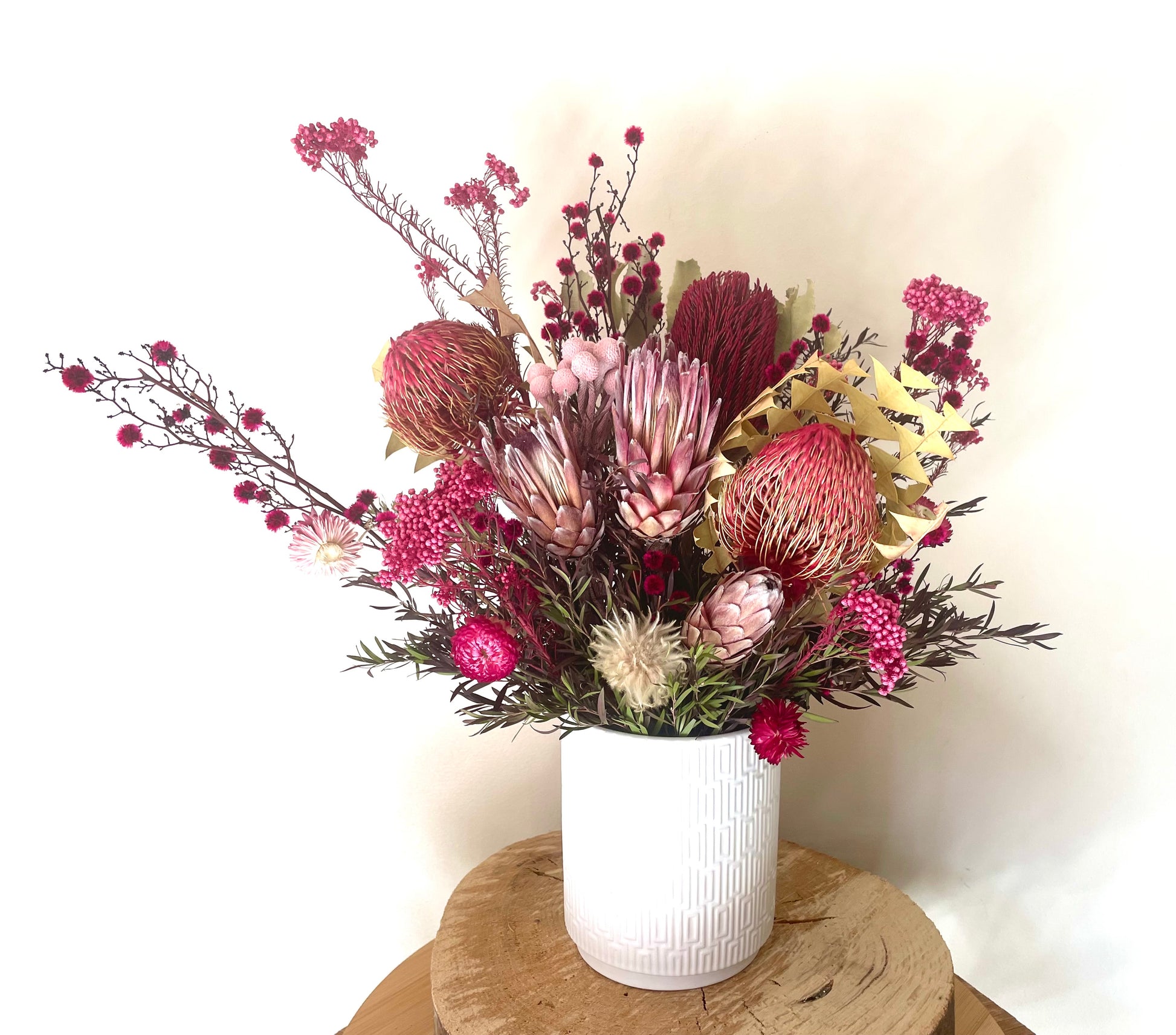 A mix of beautiful dried native flowers, proteas & native foliages, a mix of pinks colour palette all presented in a white ceramic pot,