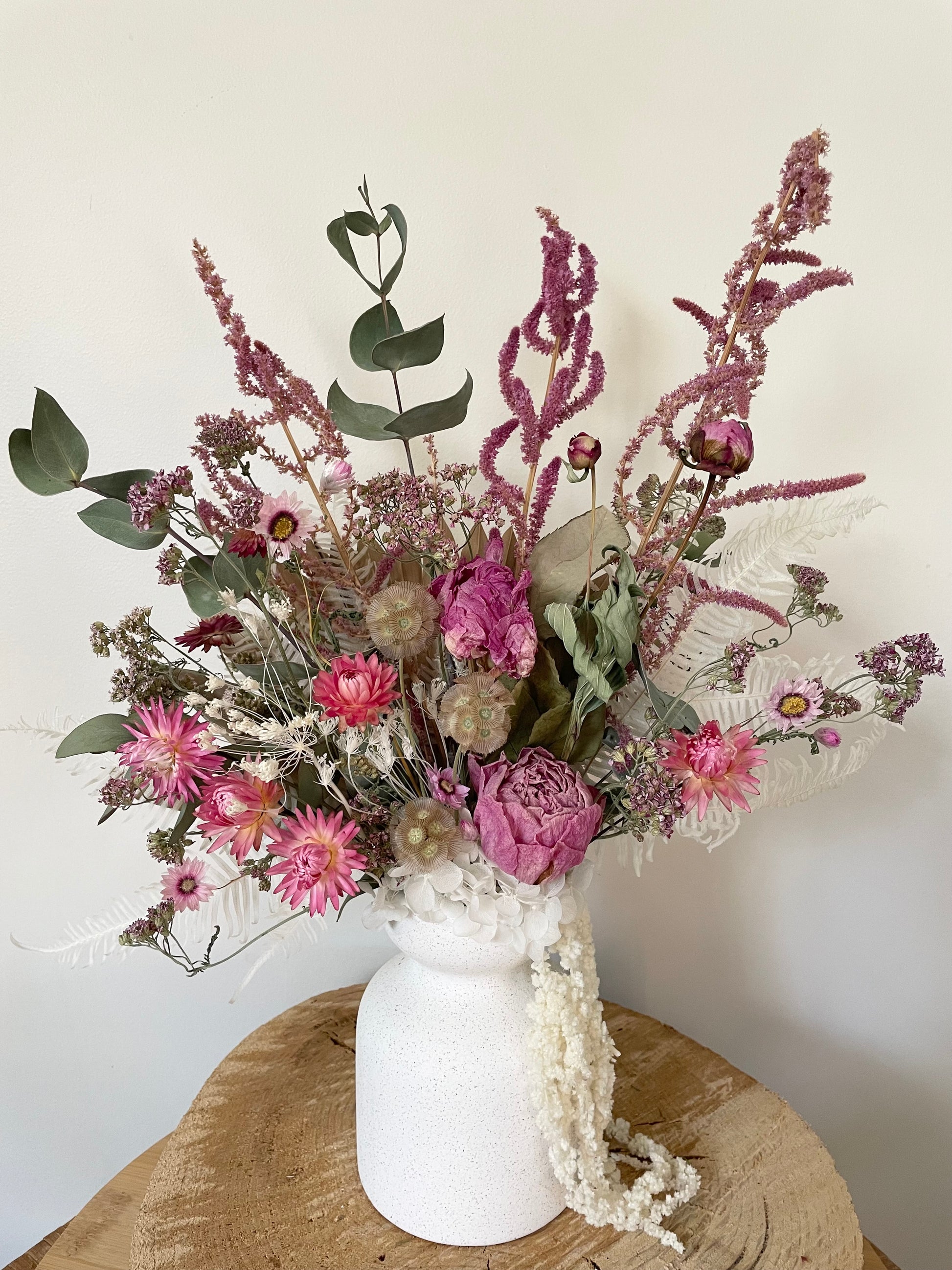 A gorgeous mix of dried peony roses, daisies, Russian stattice, achillea & eucalyptus in a white ceramic pot,