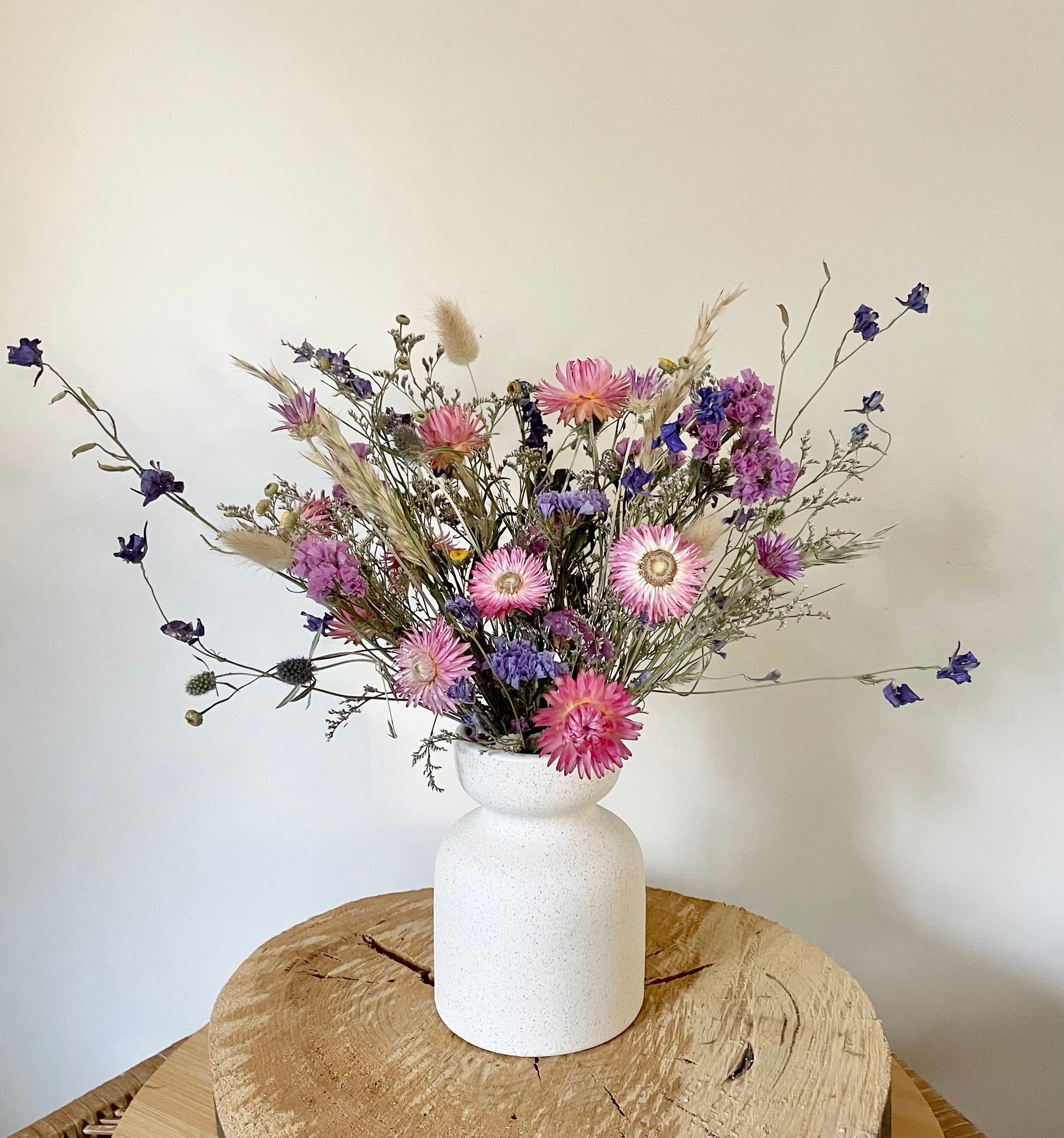 A mix of gorgeous dried wildflowers in a pink, mauve & purple colour palette with added grasses & whispy soft foliages all carefully selected, all grown spray and chemical free and arranged into this modern white ceramic pot