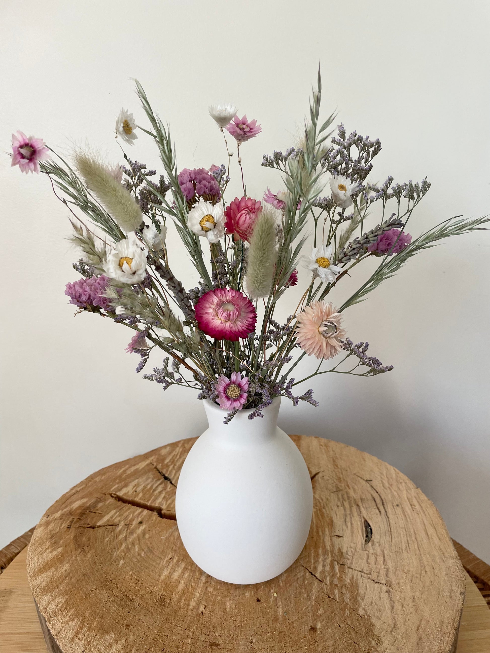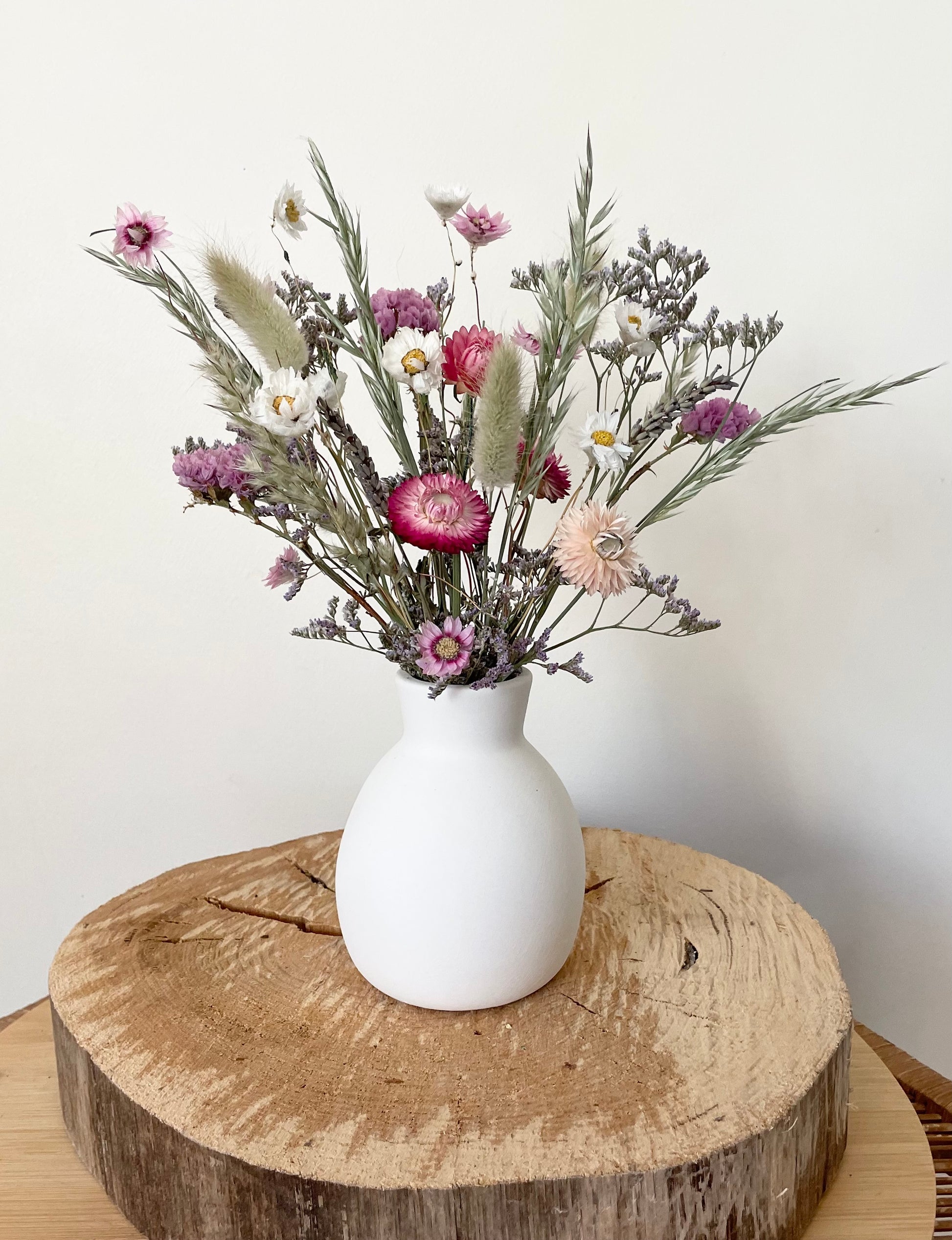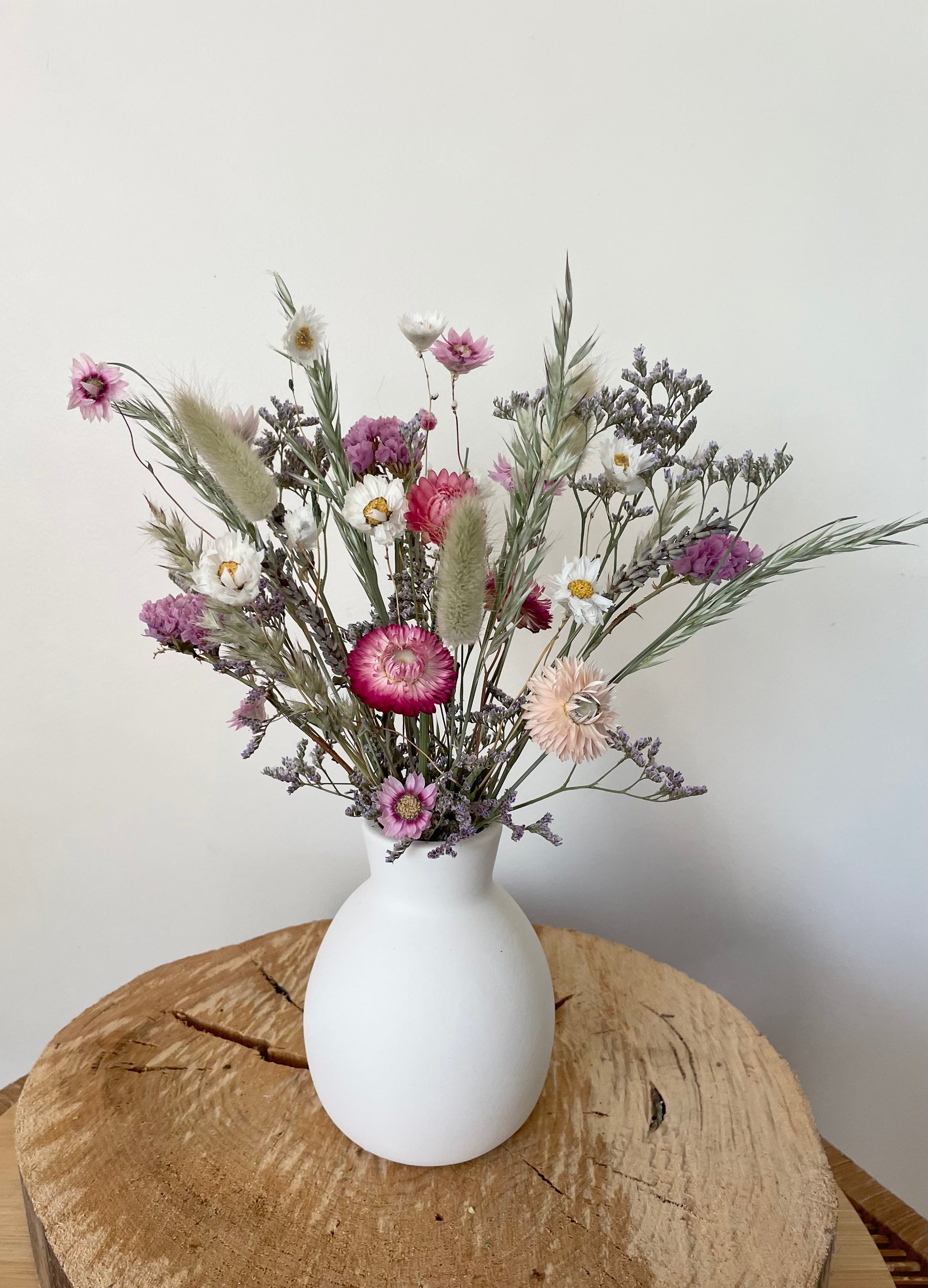 A mix of beautiful dried wildflowers presented in a white ceramic round vase.